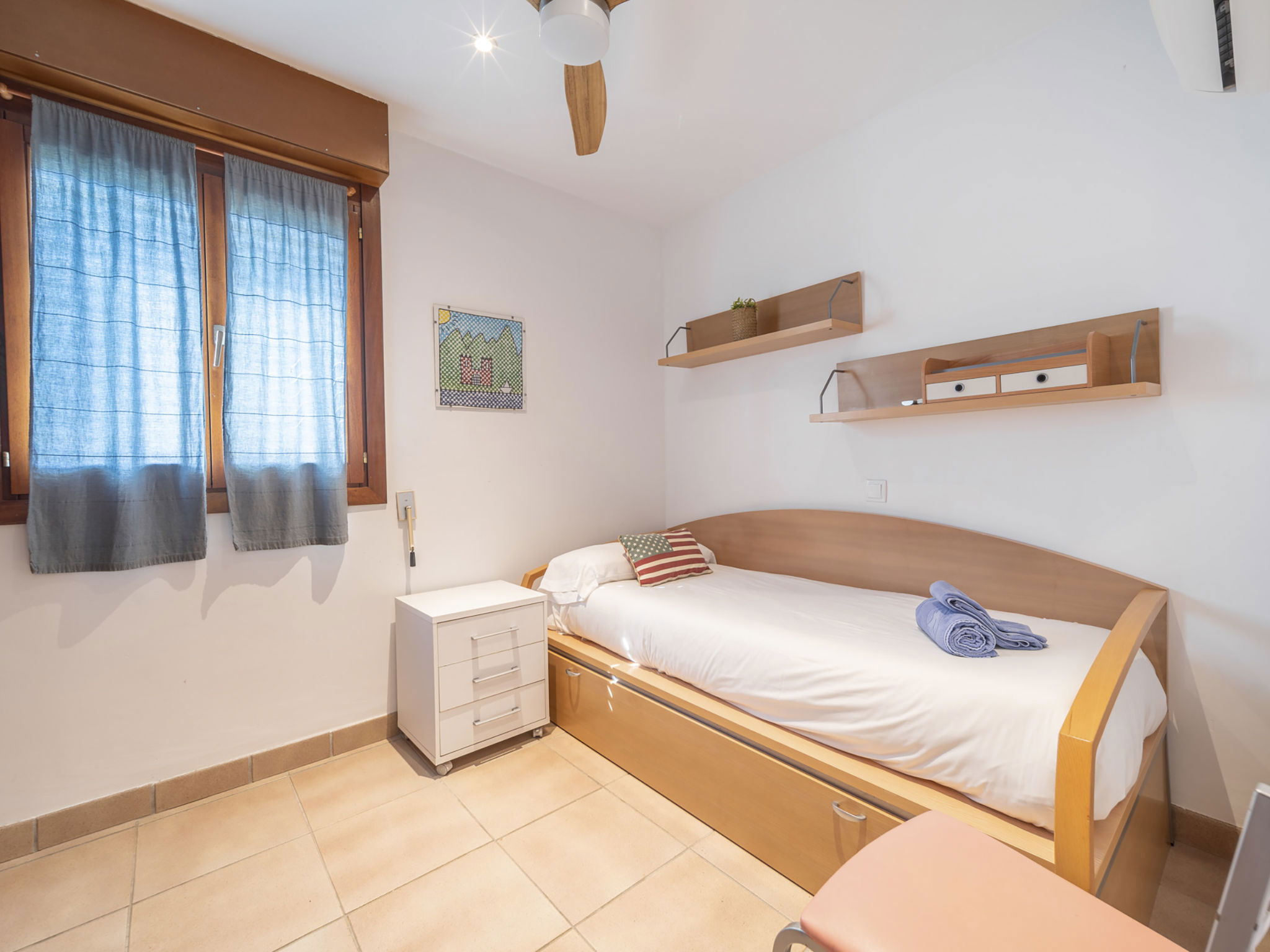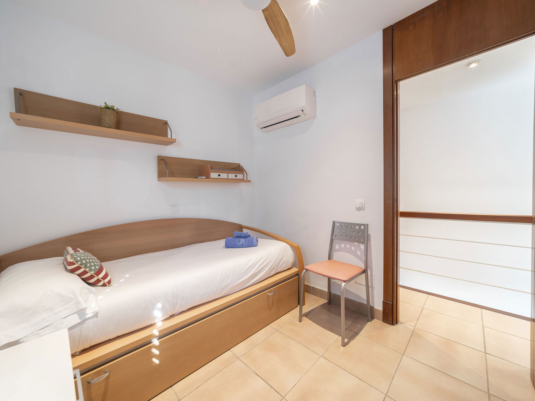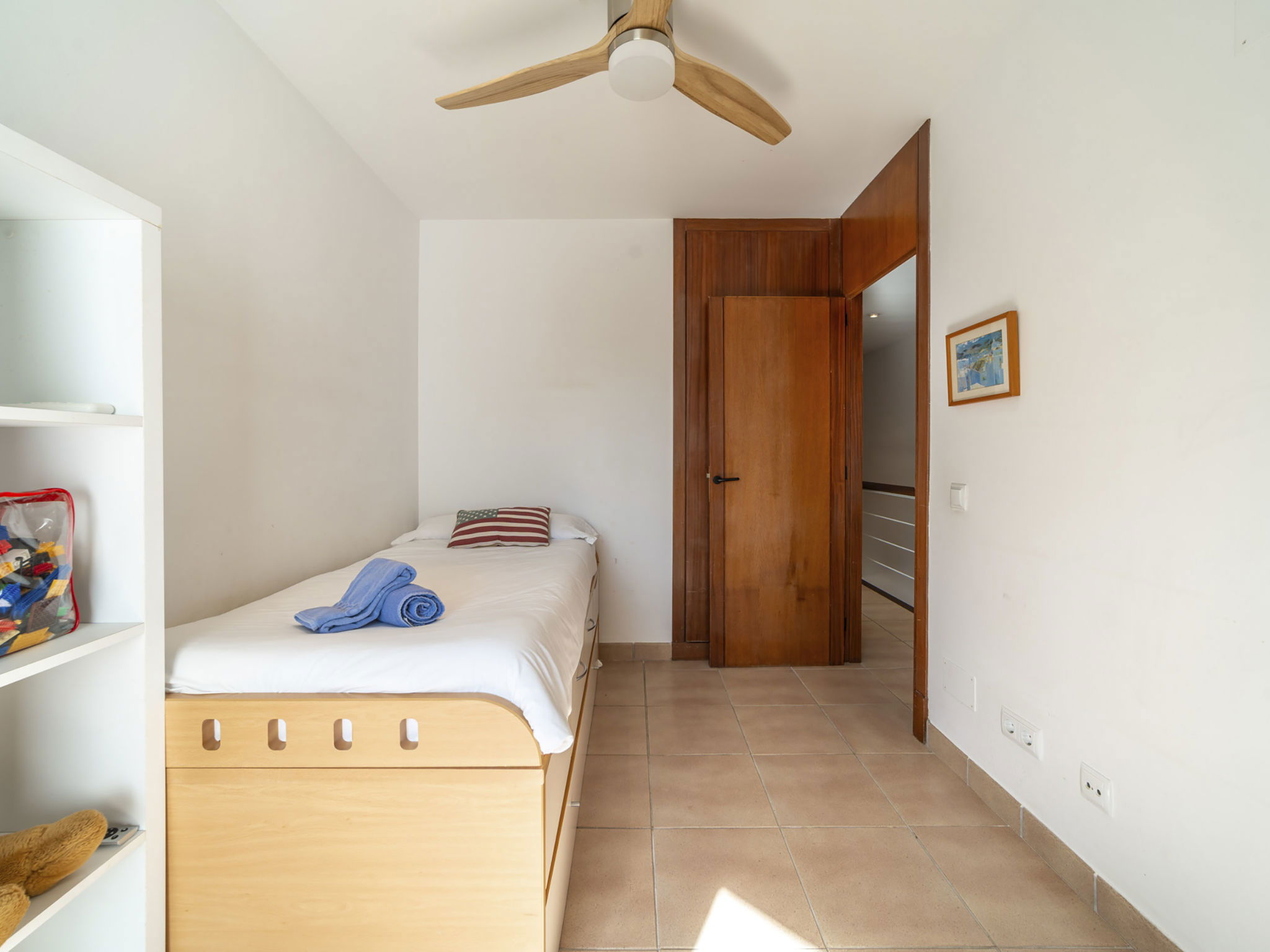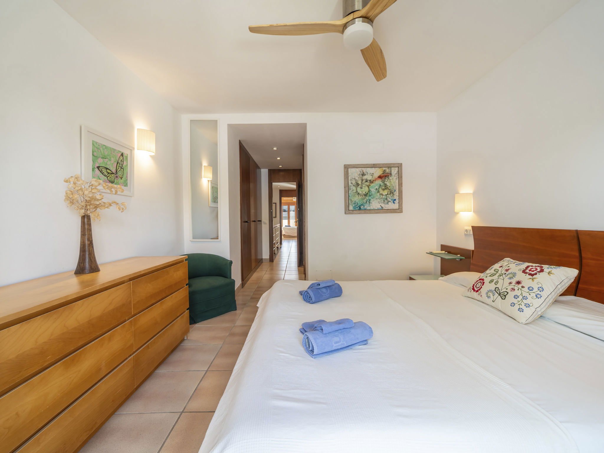 "Es Clot", 5-Zimmer-Doppelhaushälfte 125 m2 auf 2 Stockwerken. Objekt geeignet für 8 Erwachsene. Geräumig und hell, sehr komfortabel und geschmackvoll eingerichtet: grosses Wohn-/Esszimmer mit Schiebetür, Panoramafenster mit Esstisch, Sat-TV, Klimaanlage und Warmluftheizung. Ausgang zum Gartensitzplatz. Küche (Backofen, Geschirrspüler, 3 Glaskeramikplatten, Toaster, Wasserkocher, Mikrowelle, Tiefkühler, elektrische Kaffeemaschine) mit Esstisch. Bad/WC. Obergeschoss: 1 grosses Doppelzimmer mit Schiebetür, Panoramafenster mit 1 franz. Bett, Bad/Dusche/WC, Klimaanlage, Ventilator und Warmluftheizung. Ausgang zum Balkon. 1 Doppelzimmer mit Panoramafenster mit 1 Ausziehbett (2 Pers. 2 x 90 cm, Länge 190 cm), Klimaanlage, Ventilator und Warmluftheizung. 2 Zimmer mit Panoramafenster, jedes Zimmer mit 1 Ausziehbett (2 Pers. 2 x 90 cm), Klimaanlage, Ventilator und Warmluftheizung. Bad/WC mit Eckbadewanne. Gartensitzplatz, Rasen. Terrassenmöbel, Gartengrill, Liegestühle, Loggia. Herrliche Sicht auf das Meer und die Berge. Zur Verfügung: Waschmaschine, Bügeleisen, Kinderhochstuhl, Babybett, Haartrockner. Internet (WLAN, gratis). Parkplatz (eingezäunt), Garage. Geeignet für Familien. ETV/8238