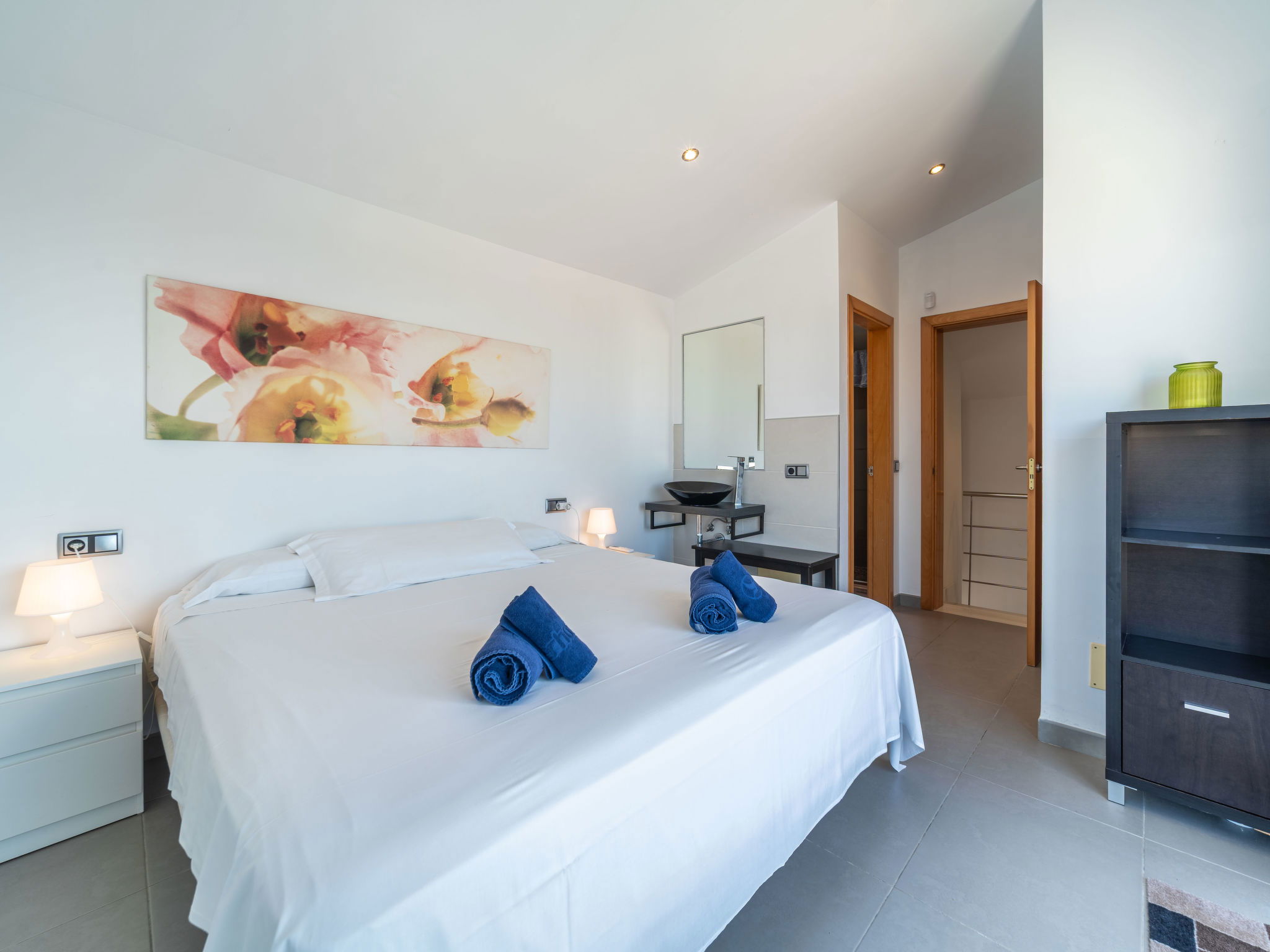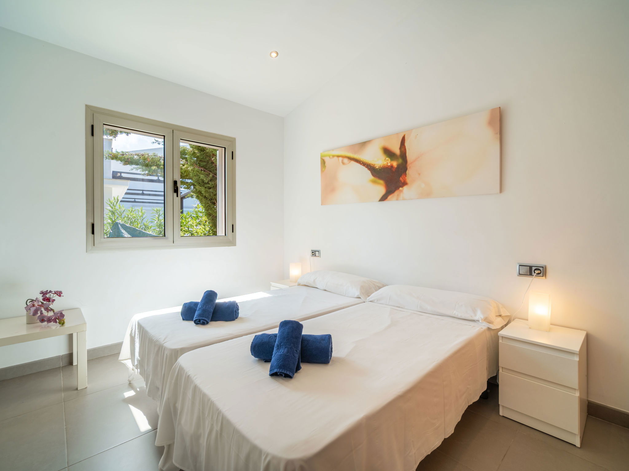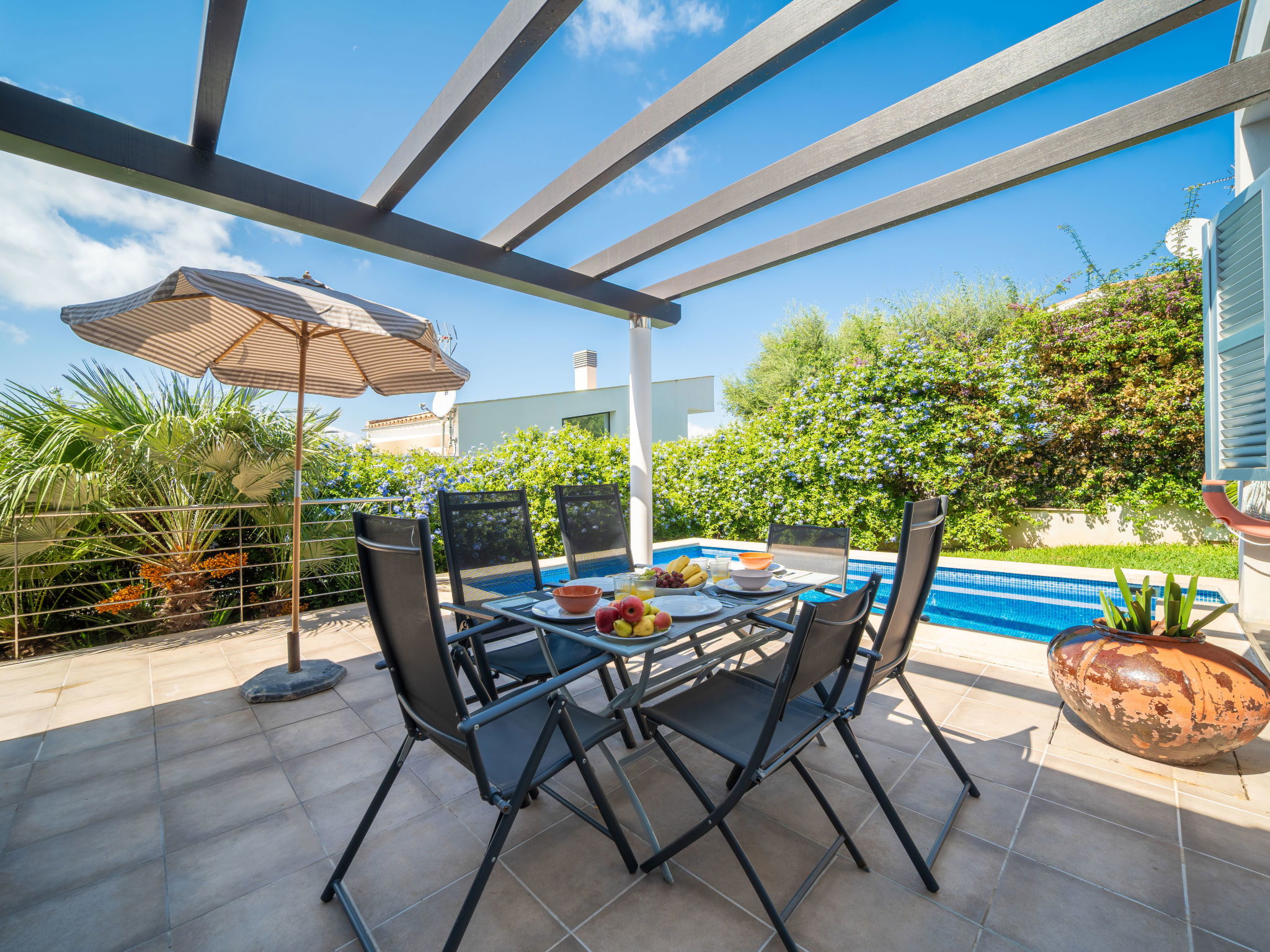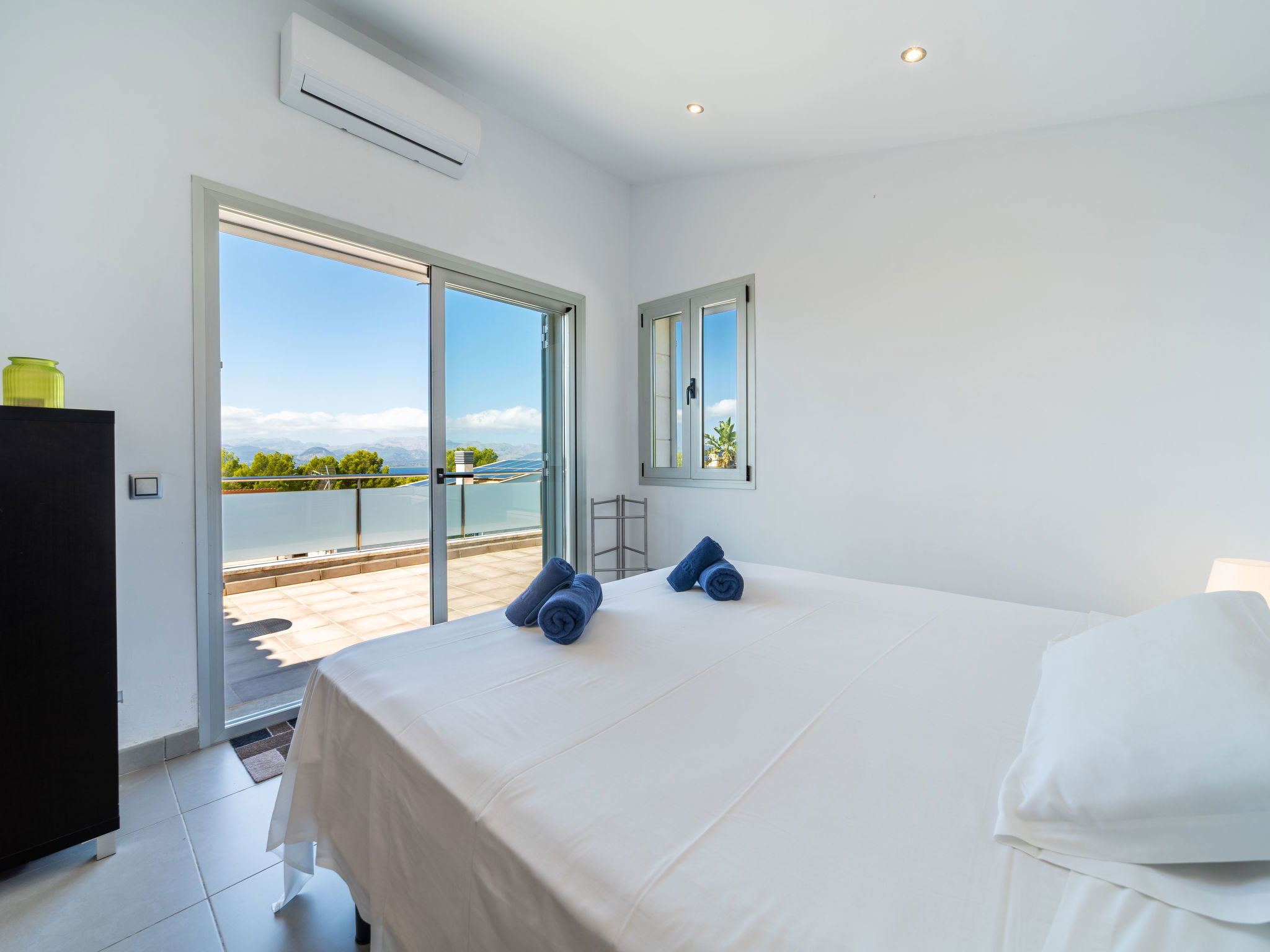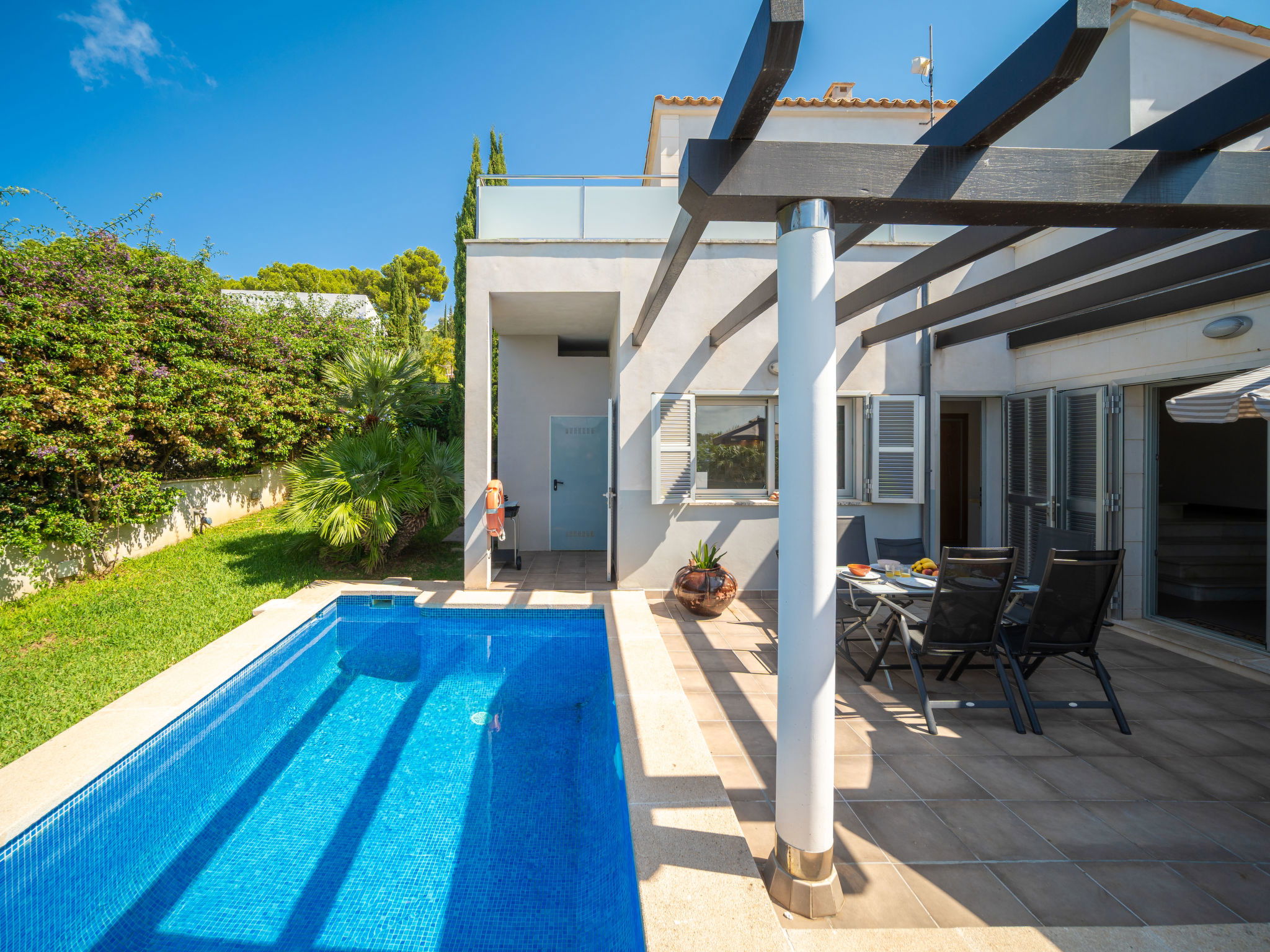 "Amanecer", 4-Zimmer-Villa 157 m2 auf 2 Stockwerken. Objekt geeignet für 6 Erwachsene. Geräumig und hell, modern und gemütlich eingerichtet: offenes grosses Wohn-/Esszimmer mit Schiebetür, Panoramafenster mit Esstisch, TV, Sat-TV, Flachbildschirm, Klimaanlage und Warmluftheizung. Ausgang zum Gartensitzplatz, zum Schwimmbad. 1 grosses Doppelzimmer mit Panoramafenster mit 2 Betten (90 cm, Länge 190 cm), Bad/WC. 1 grosses Doppelzimmer mit Panoramafenster mit 2 Betten (90 cm, Länge 190 cm). Küche (Backofen, Geschirrspüler, 4 Glaskeramikherd Platten, Mikrowelle, Tiefkühler, elektrische Kaffeemaschine). Ausgang zum Garten. Bad/Dusche/WC. Obergeschoss: 1 grosses Doppelzimmer mit Schiebetür, Panoramafenster mit 1 franz. Bett (180 cm, Länge 200 cm), Bad/Dusche/WC, Klimaanlage und Warmluftheizung. Ausgang zur Terrasse. Grosse Terrasse, Gartensitzplatz, Rasen, Laube. Terrassenmöbel, Balkonmöbel, Gartengrill, Liegestühle, Loggia. Eingeschränkte Sicht auf das Meer und die Berge. Zur Verfügung: Waschmaschine, Bügeleisen, Haartrockner. Internet (Wireless LAN, gratis). EAppartement273