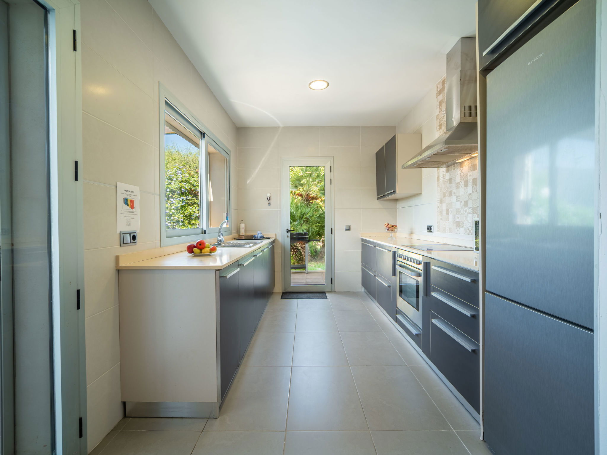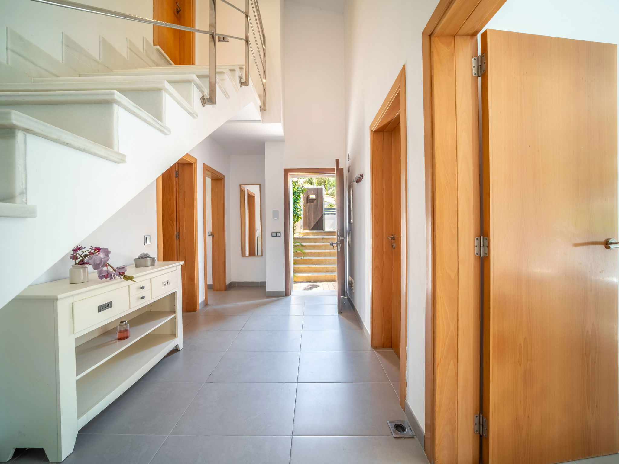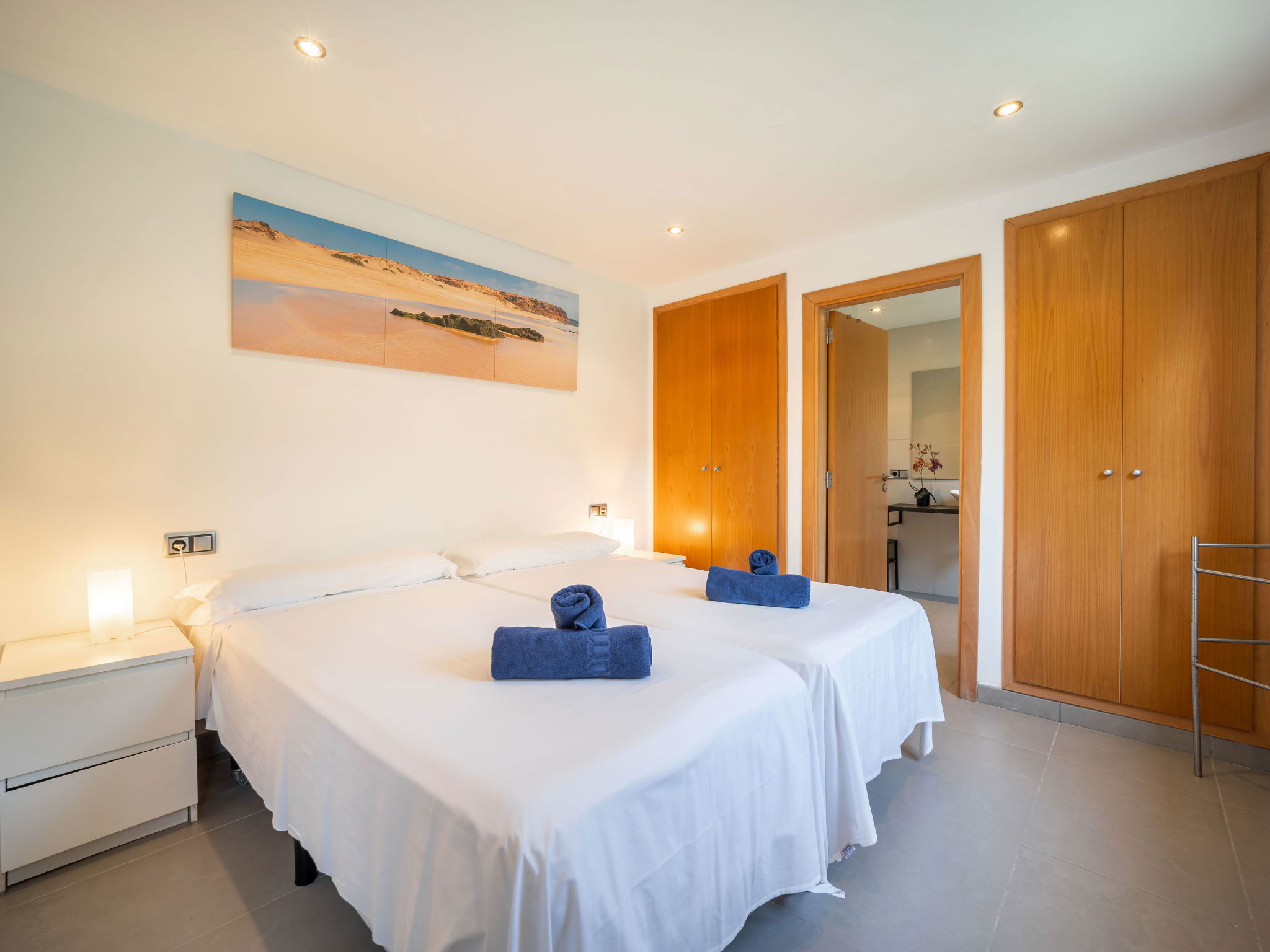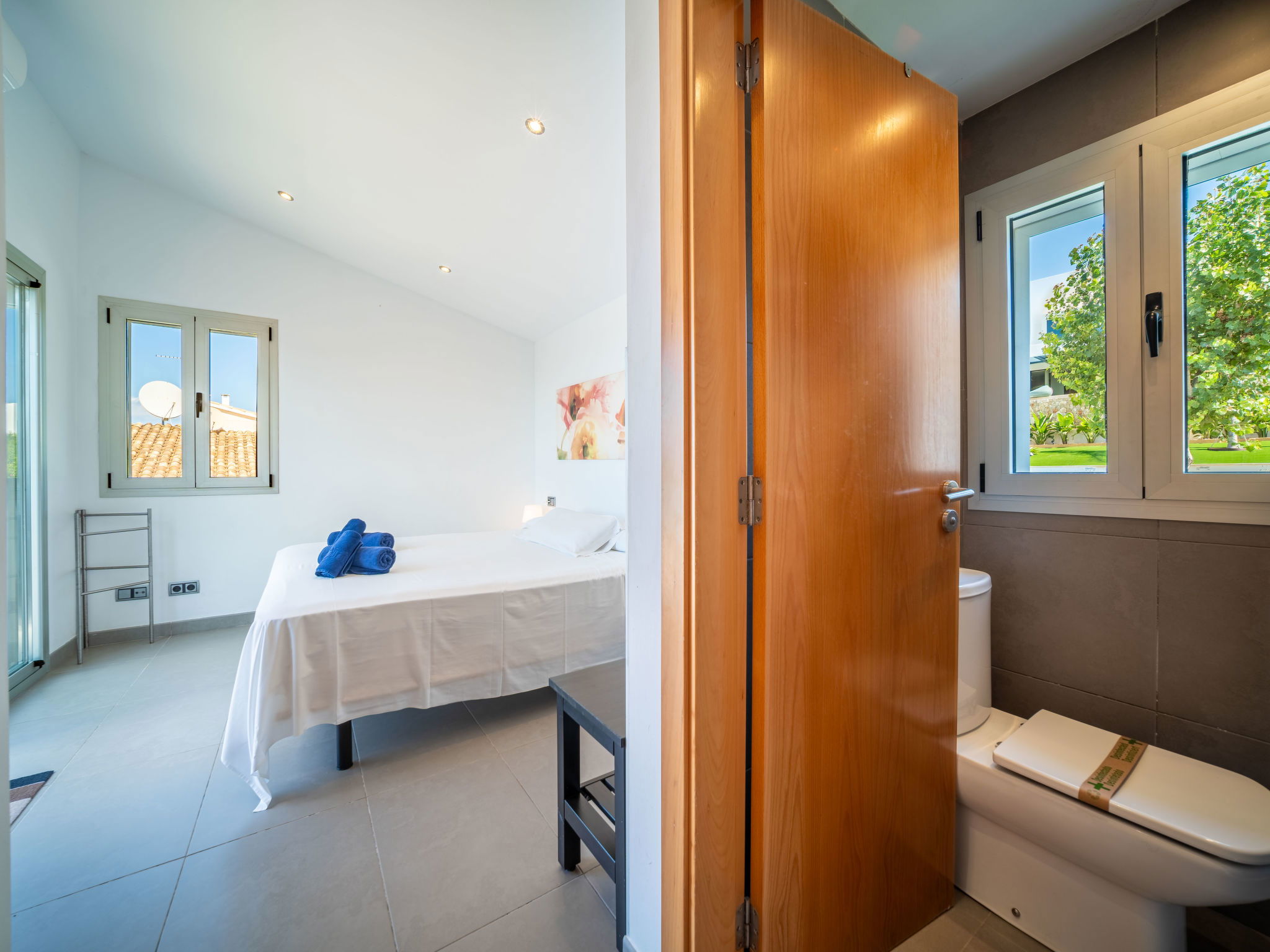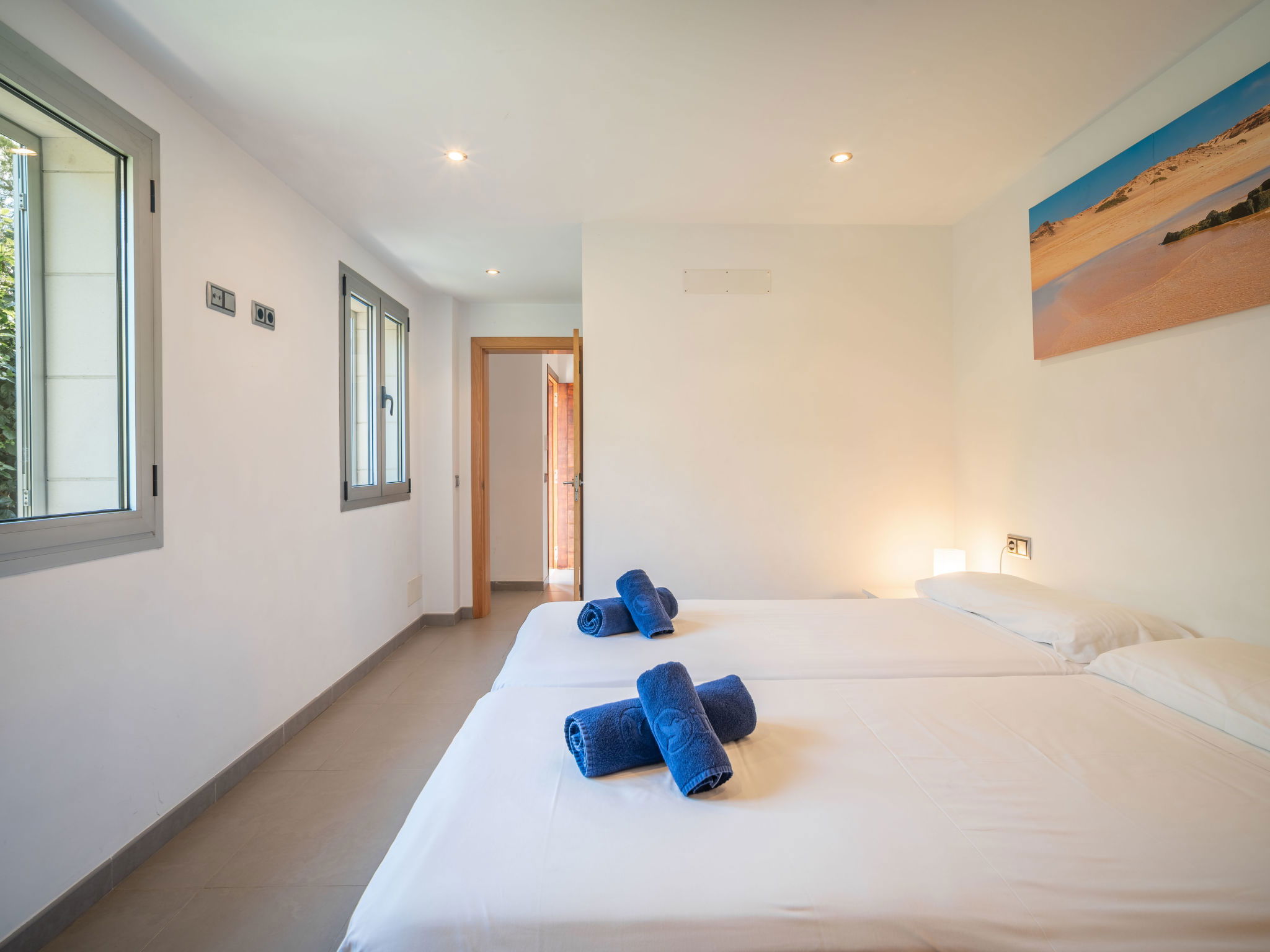 "Amanecer", 4-Zimmer-Villa 157 m2 auf 2 Stockwerken. Objekt geeignet für 6 Erwachsene. Geräumig und hell, modern und gemütlich eingerichtet: offenes grosses Wohn-/Esszimmer mit Schiebetür, Panoramafenster mit Esstisch, TV, Sat-TV, Flachbildschirm, Klimaanlage und Warmluftheizung. Ausgang zum Gartensitzplatz, zum Schwimmbad. 1 grosses Doppelzimmer mit Panoramafenster mit 2 Betten (90 cm, Länge 190 cm), Bad/WC. 1 grosses Doppelzimmer mit Panoramafenster mit 2 Betten (90 cm, Länge 190 cm). Küche (Backofen, Geschirrspüler, 4 Glaskeramikherd Platten, Mikrowelle, Tiefkühler, elektrische Kaffeemaschine). Ausgang zum Garten. Bad/Dusche/WC. Obergeschoss: 1 grosses Doppelzimmer mit Schiebetür, Panoramafenster mit 1 franz. Bett (180 cm, Länge 200 cm), Bad/Dusche/WC, Klimaanlage und Warmluftheizung. Ausgang zur Terrasse. Grosse Terrasse, Gartensitzplatz, Rasen, Laube. Terrassenmöbel, Balkonmöbel, Gartengrill, Liegestühle, Loggia. Eingeschränkte Sicht auf das Meer und die Berge. Zur Verfügung: Waschmaschine, Bügeleisen, Haartrockner. Internet (Wireless LAN, gratis). EAppartement273