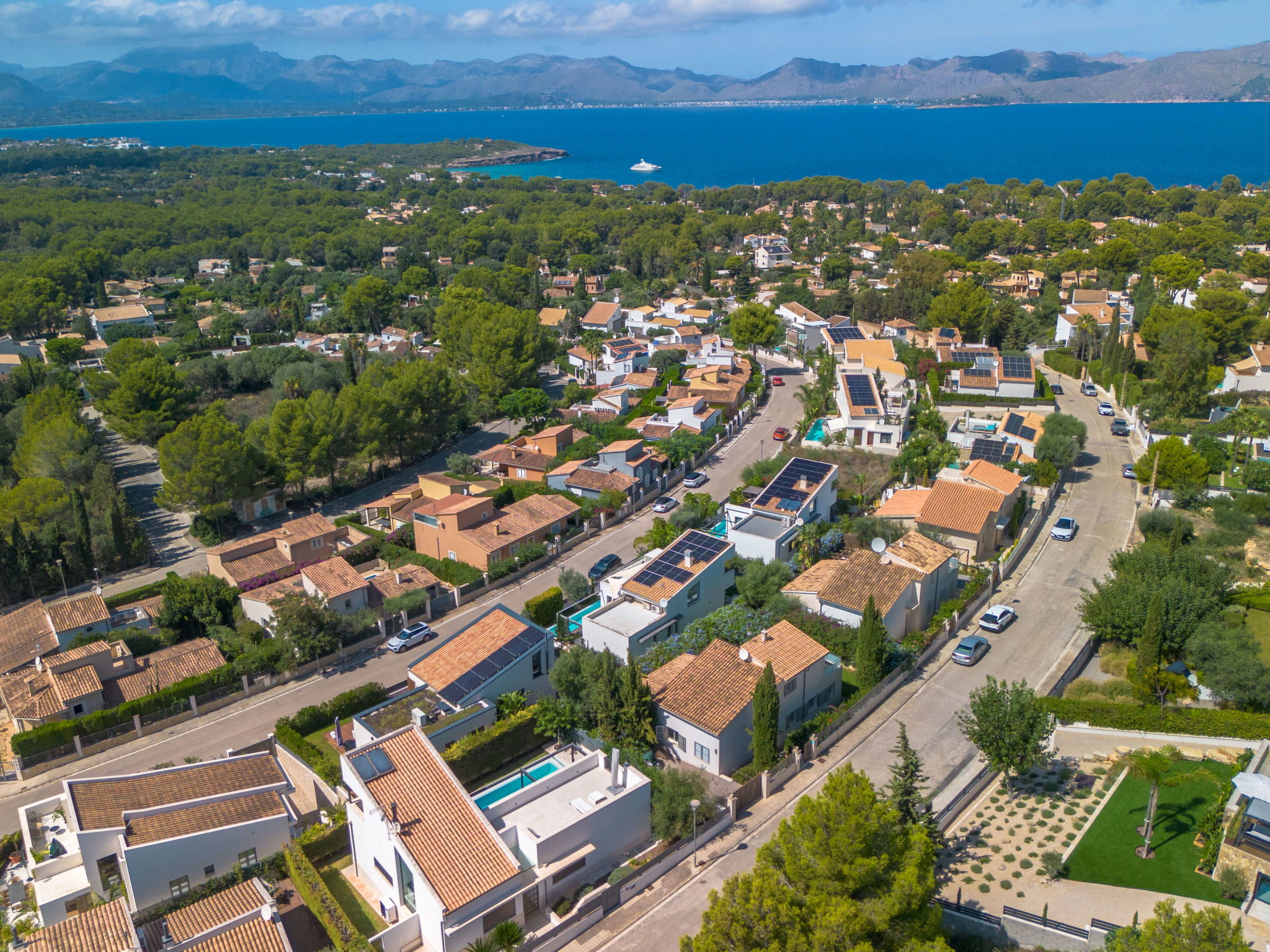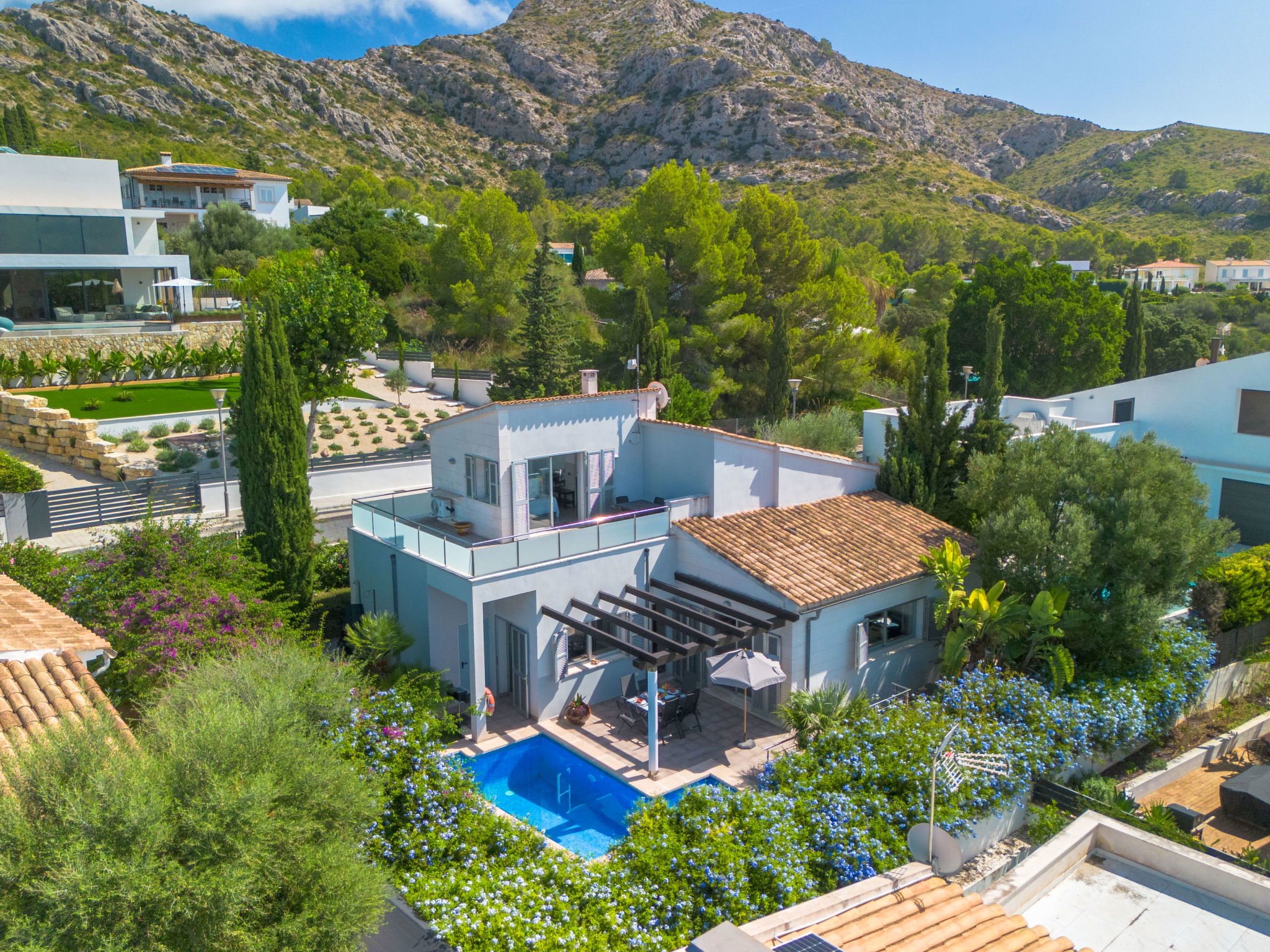 Bonaire, Alcúdia: Schöne, komfortable Villa "Amanecer", auf 2 Stockwerken. Im Ortsteil Cielo de Bonaire, ruhige, sonnige Lage im Villenviertel, 1 km vom Waldrand, 1.3 km vom Meer, 1.9 km vom Strand. Zur Alleinbenutzung: Grundstück 400 m2 (eingezäunt), grosser Garten mit Rasen und Pflanzen, Schwimmbad eckig (5 x 4 m, 120 - 190 cm tief, saisonale Verfügbarkeit: 01.Jan. - 31.Dez.). Sitzplatz, Laube, Pergola, Gartenmöbel, Grill, Poolpflege durch den Besitzer/Gärtner. Im Hause: Internetzugang, Wireless LAN, Klimaanlage, Alarmanlage, Waschmaschine. Lebensmittelgeschäft 1.5 km, Supermarkt 3.4 km, Restaurant 1.2 km, Bar 1.3 km, Bäckerei 3.4 km, Fahrradverleih 3.5 km, Zentrum zu Fuss in 40 Minuten erreichbar, Bushaltestelle 1.5 km, Fähre "Port Alcúdia" 5.5 km, Sandstrand "Sant Pere" 1.9 km, Felsstrand "La Victoria" 1.8 km, Badebucht 1.3 km. Sporthafen 1.3 km, Golfplatz (18 Loch) 5 km, Reitstall 6 km, Wanderwege ab Haus, Radweg 800 m. Nahe gelegene Sehenswürdigkeiten: Ciudad Romana de Alcúdia 3.8 km, Puerto de Alcúdia 4.5 km, Ermita de La Victoria y s'Illot Playa. 3.8 km, Malpas, Es Barcarés, Sa Marina. Puerto de Pollença y Pollença Pueblo 12 km, Hidropark Aquatic Park 5.5 km. Wandergebiete: Atalaya de Alcúdia - La Victoria 4.5 km, Puig de Sant Martí, Alcúdia. Serra de Tramuntana y Albufera Mallorca. Bitte beachten: Fahrzeug empfohlen. Objekt geeignet für 6 Erwachsene. Der Besitzer akzeptiert keine Jugendgruppen. Flugplatz 55 km vom Haus.