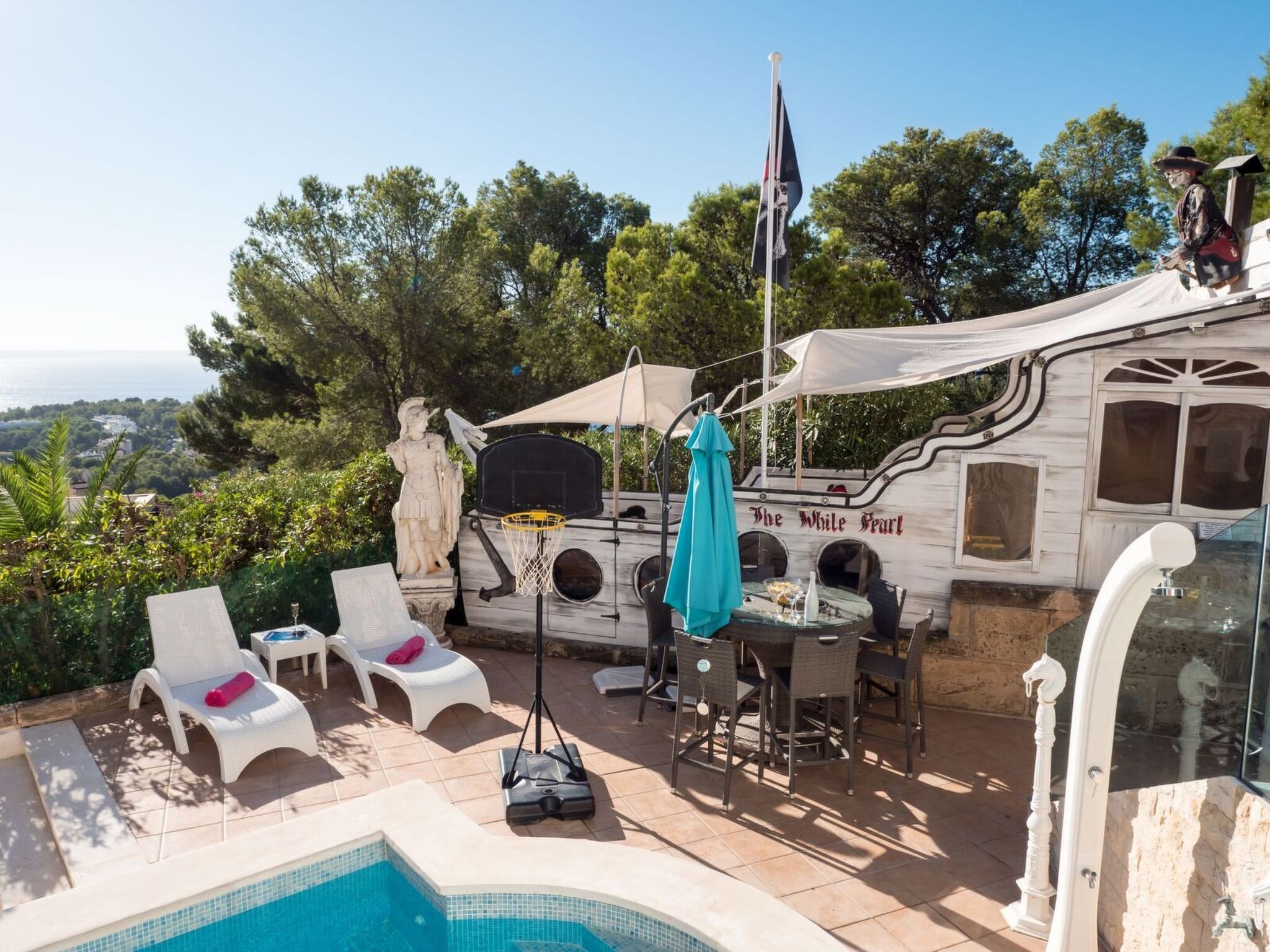 Die Villa's exterior is an oasis of entertainment and relaxation. Dive into the private heated pool, dine alfresco with a fully equipped barbecue area, or socialize at the Ocean Sports Bar featuring an American pool table, foosball, and Internet TV under the glow of a Disney-themed light waterfall. The Spa area, complete with a gym, sauna, and an 8-seater Hydro hot tub offers a luxury sunbathing zone and a chill-out deck for ultimate relaxation. Young guests will revel in the pirate-themed safe play area, ensuring fun and safety in equal measure.