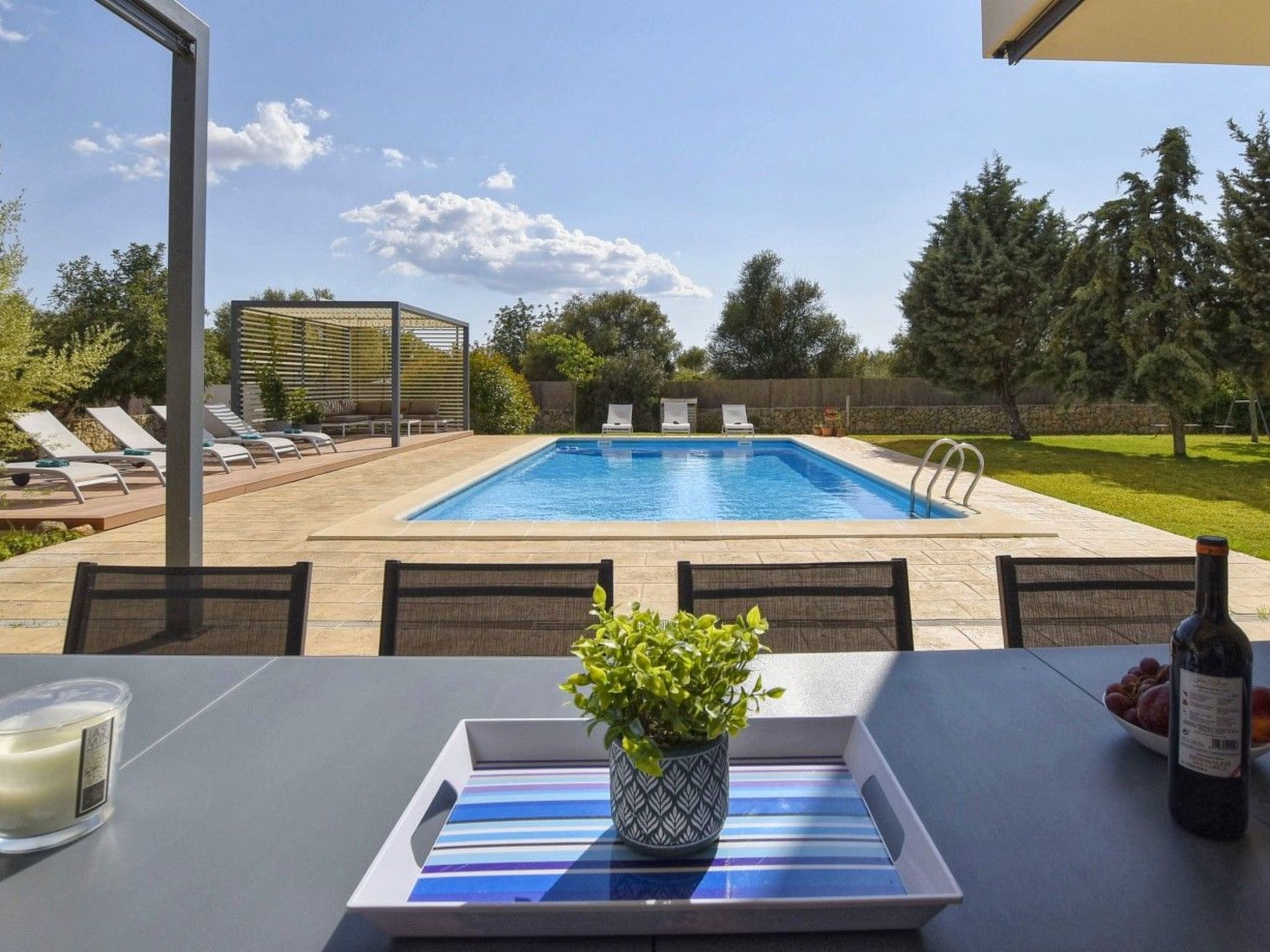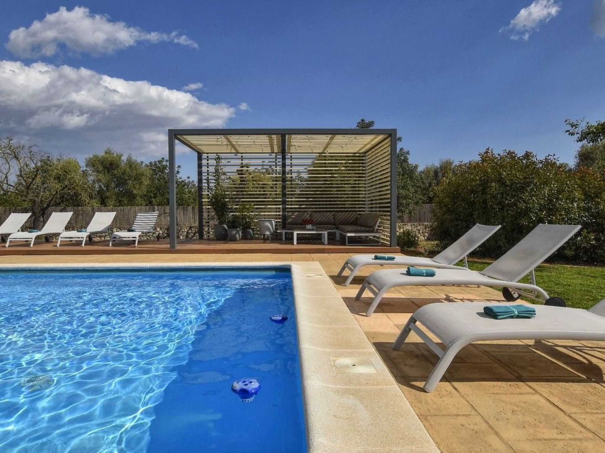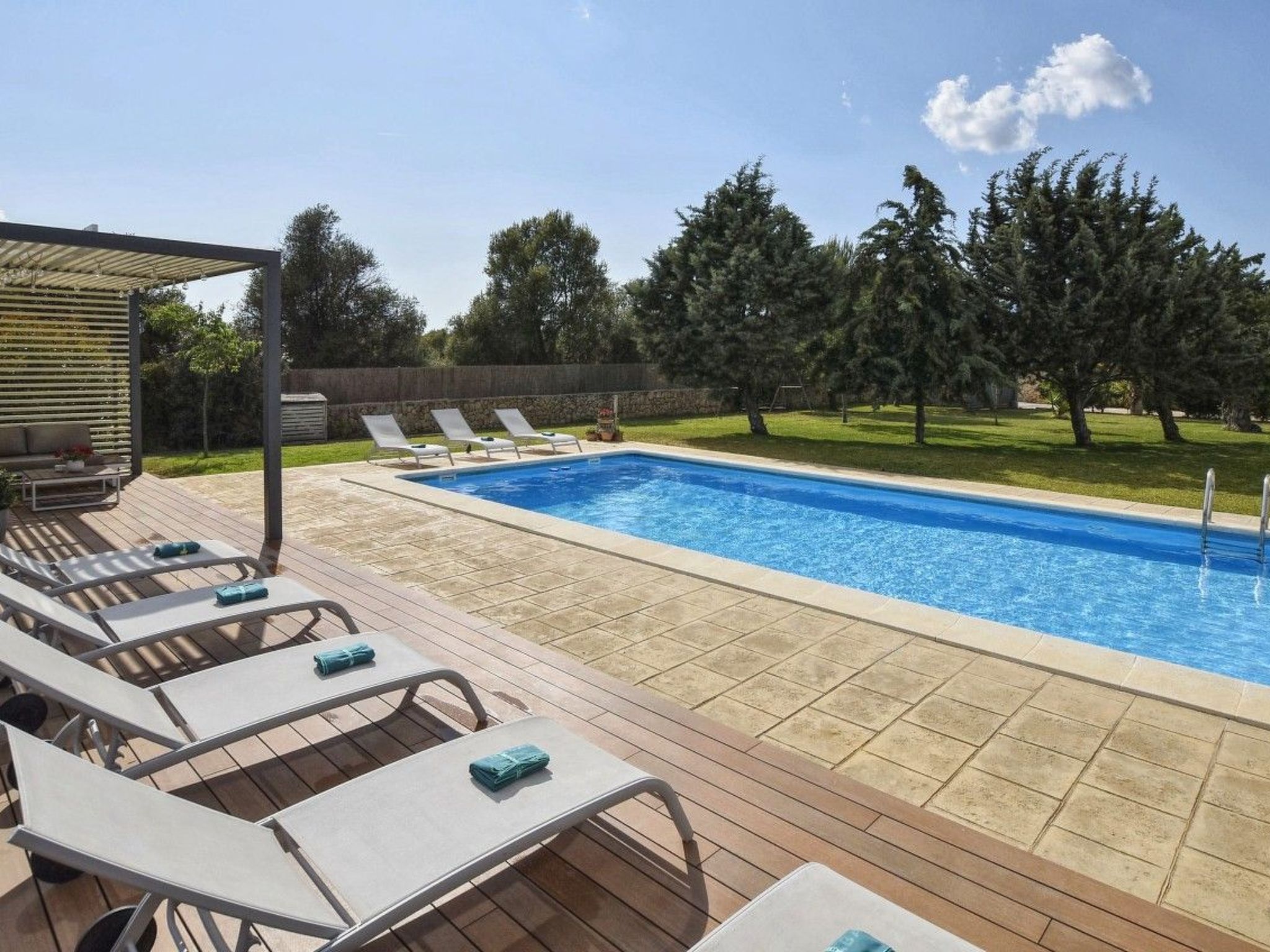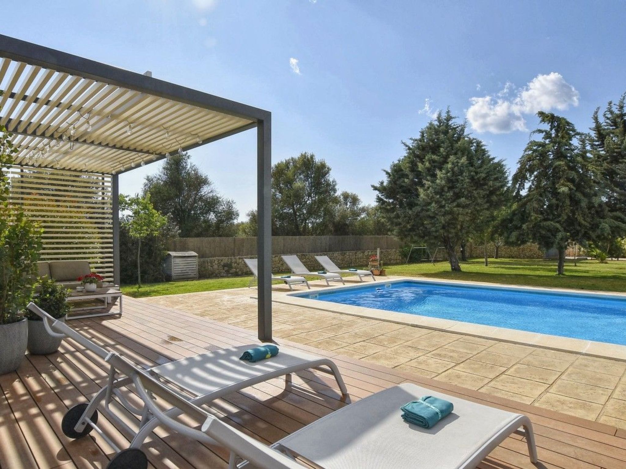 Der Außenbereich mit schattenspendender Sitzecke und Chillsofa ist wundervoll angelegt und der private 10 m x 5 m Swimming Pool ( Tiefe 1 m x 1,80 m ) ist komplett von einer großzügigen Rasenfläche umgeben. Zur weiteren Ausstattung gehören ebenfalls eine Waschmaschine, Wäschetrockner, Kinderhochstuhl und ein Babybett.