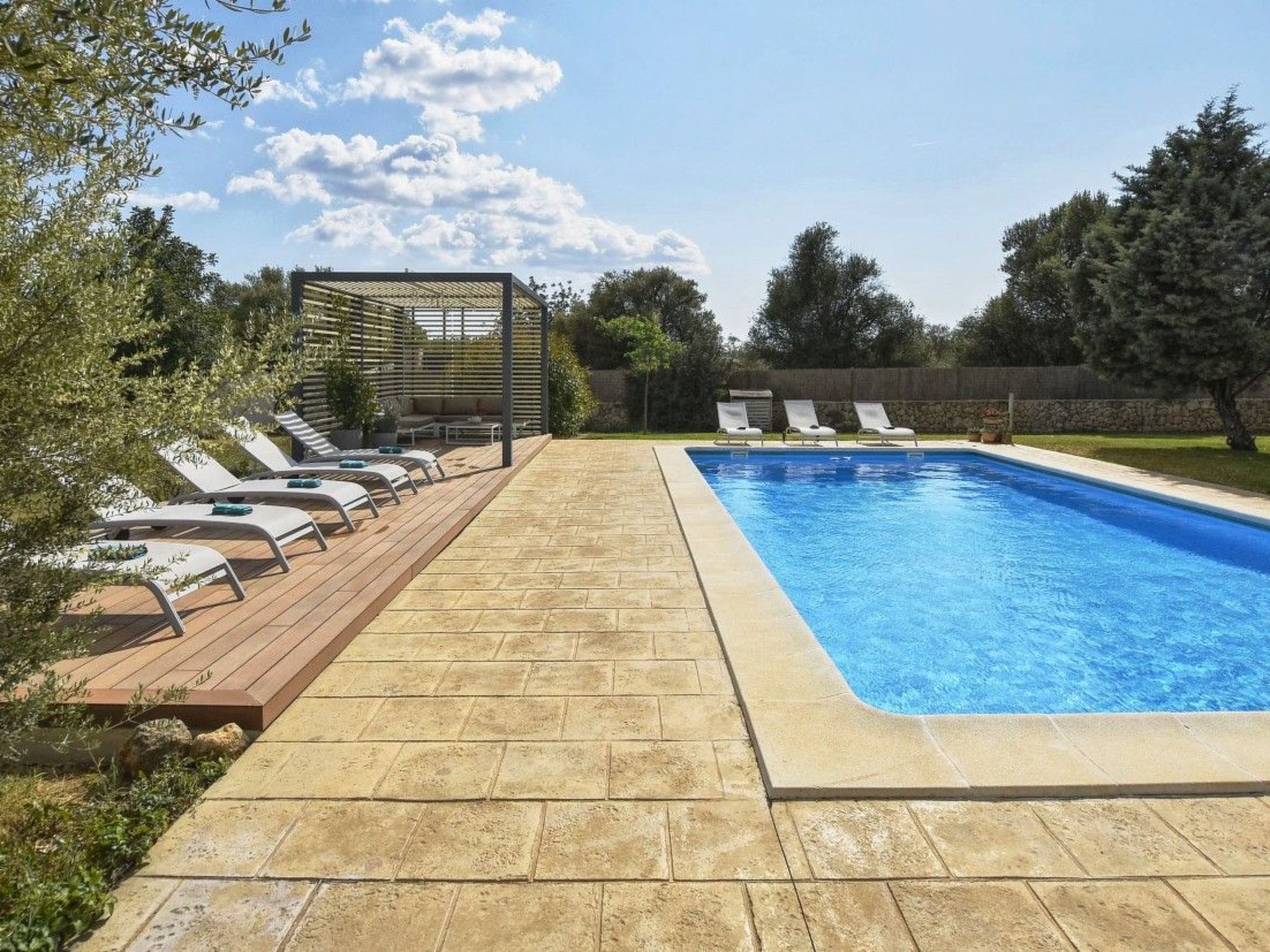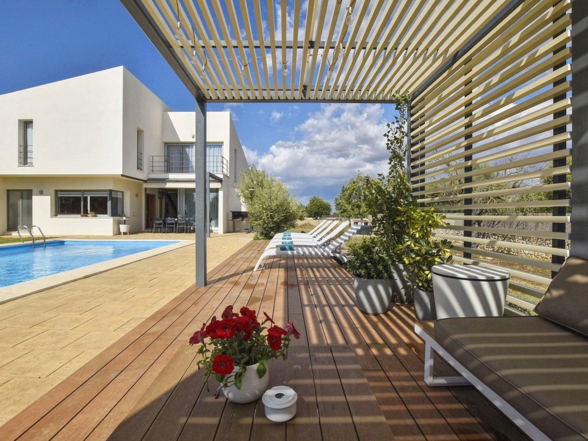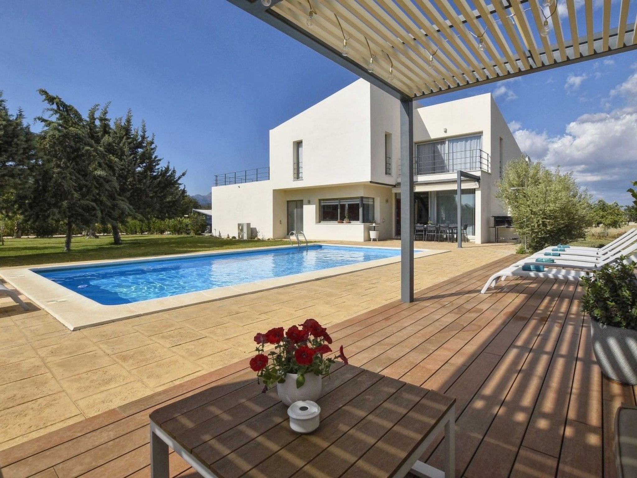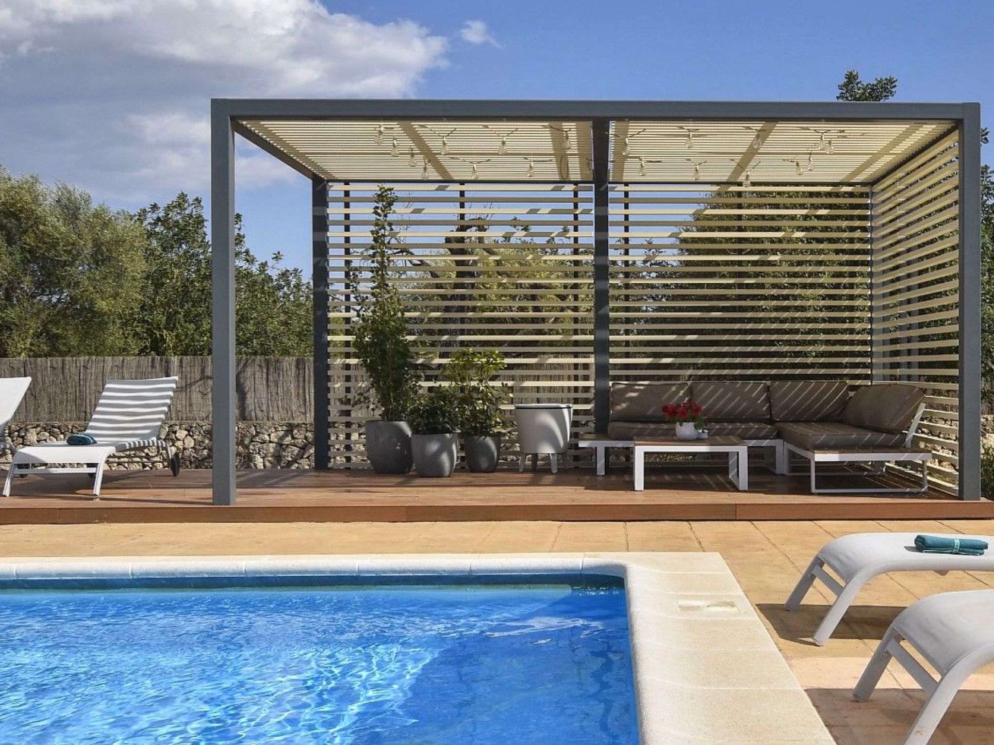 Der Außenbereich mit schattenspendender Sitzecke und Chillsofa ist wundervoll angelegt und der private 10 m x 5 m Swimming Pool ( Tiefe 1 m x 1,80 m ) ist komplett von einer großzügigen Rasenfläche umgeben. Zur weiteren Ausstattung gehören ebenfalls eine Waschmaschine, Wäschetrockner, Kinderhochstuhl und ein Babybett.