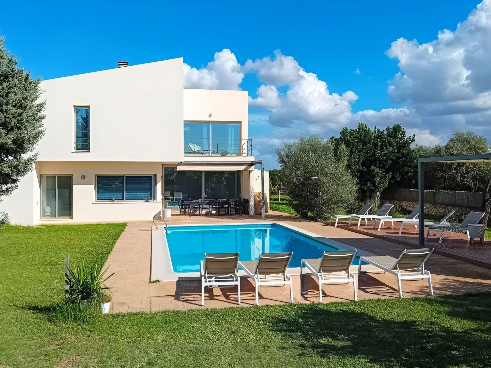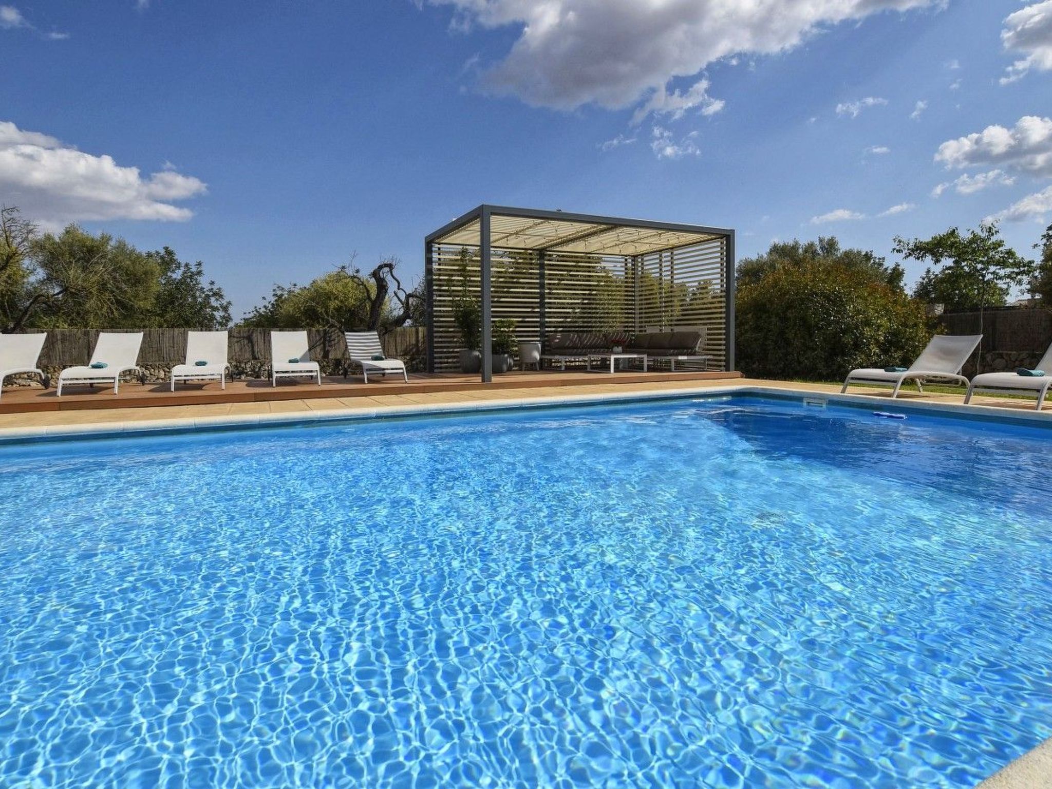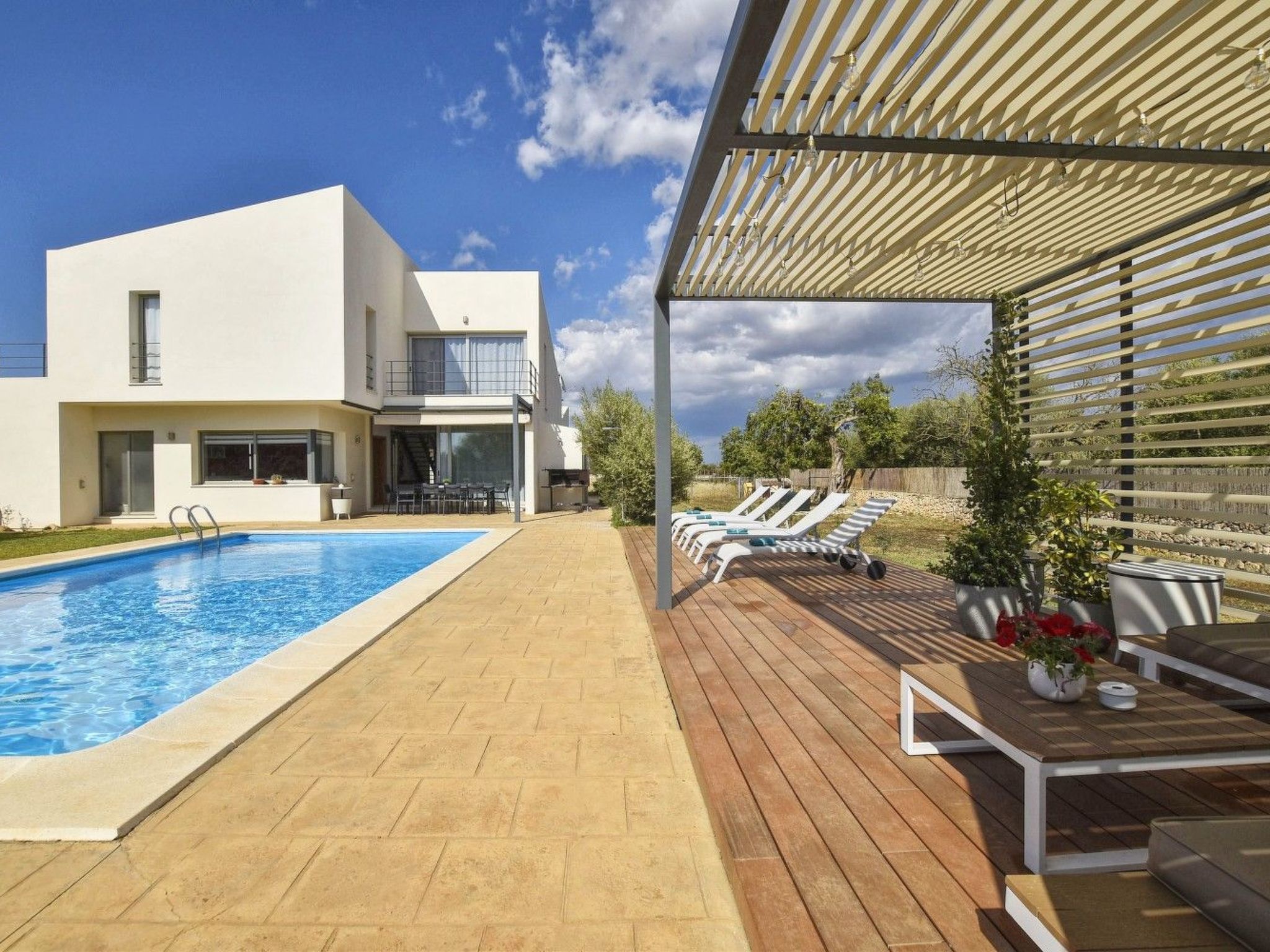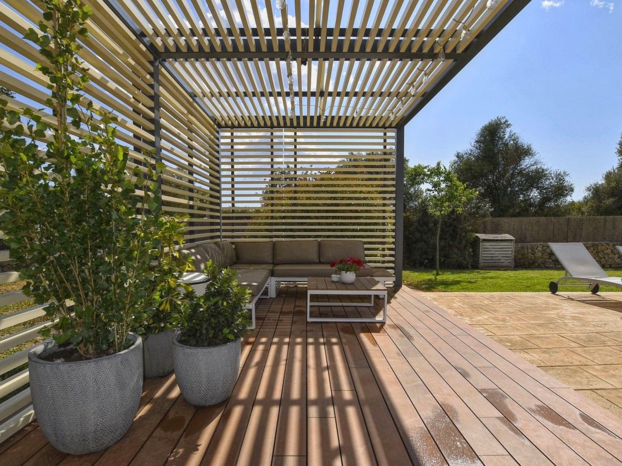 Der Außenbereich mit schattenspendender Sitzecke und Chillsofa ist wundervoll angelegt und der private 10 m x 5 m Swimming Pool ( Tiefe 1 m x 1,80 m ) ist komplett von einer großzügigen Rasenfläche umgeben. Zur weiteren Ausstattung gehören ebenfalls eine Waschmaschine, Wäschetrockner, Kinderhochstuhl und ein Babybett.