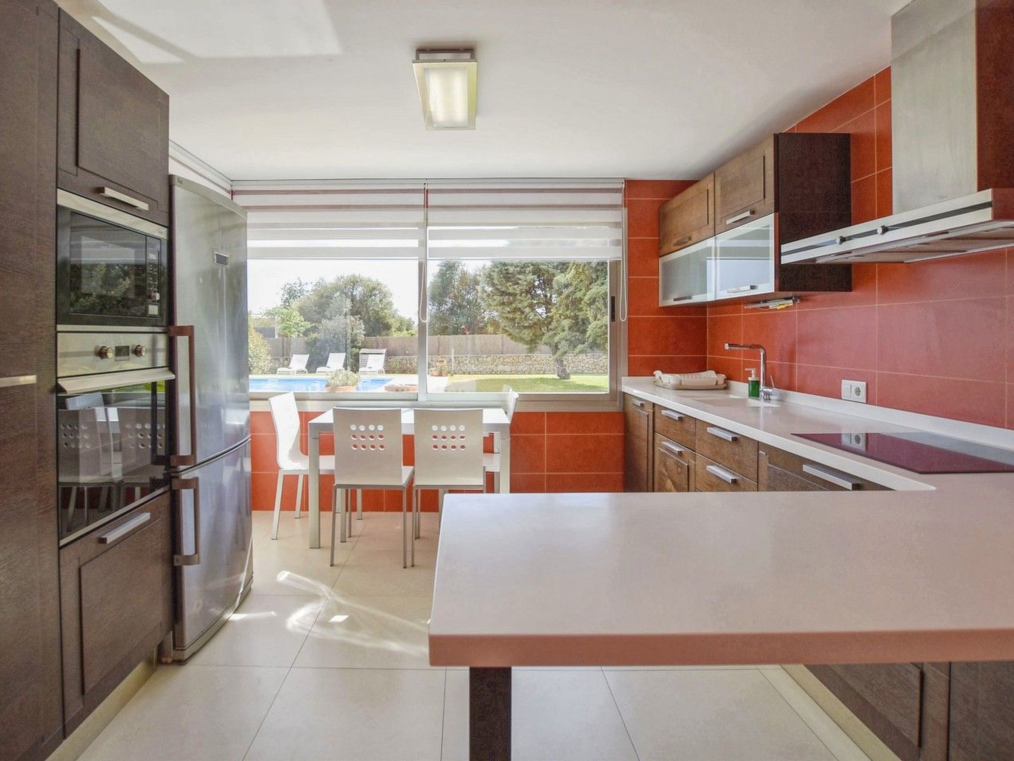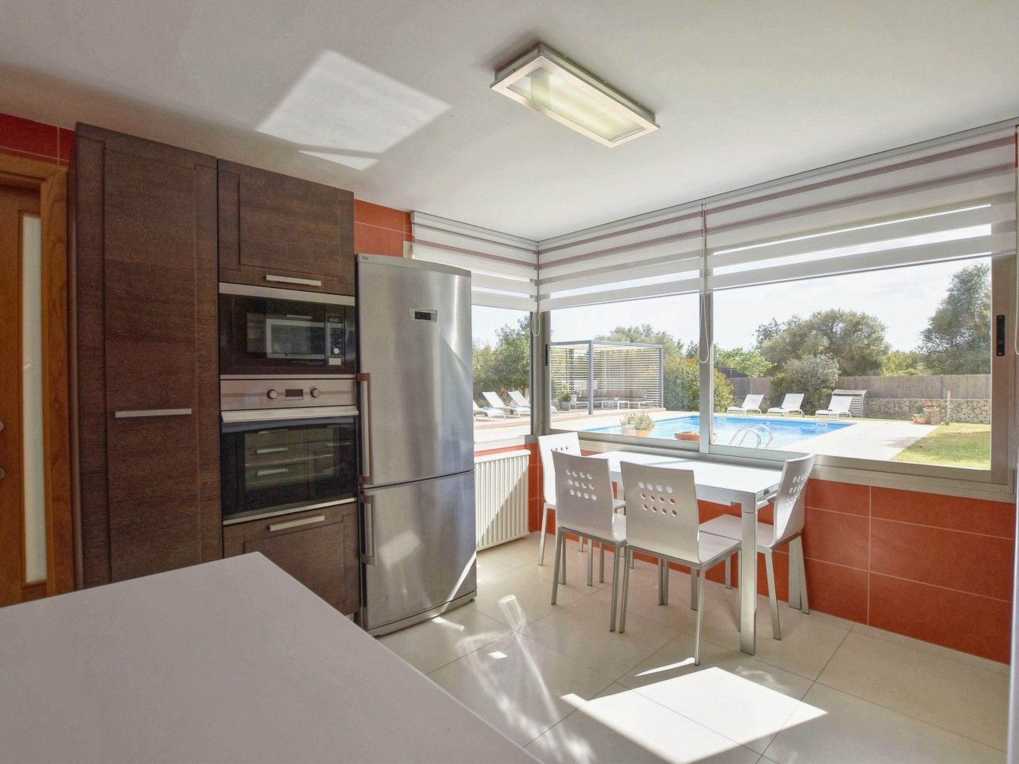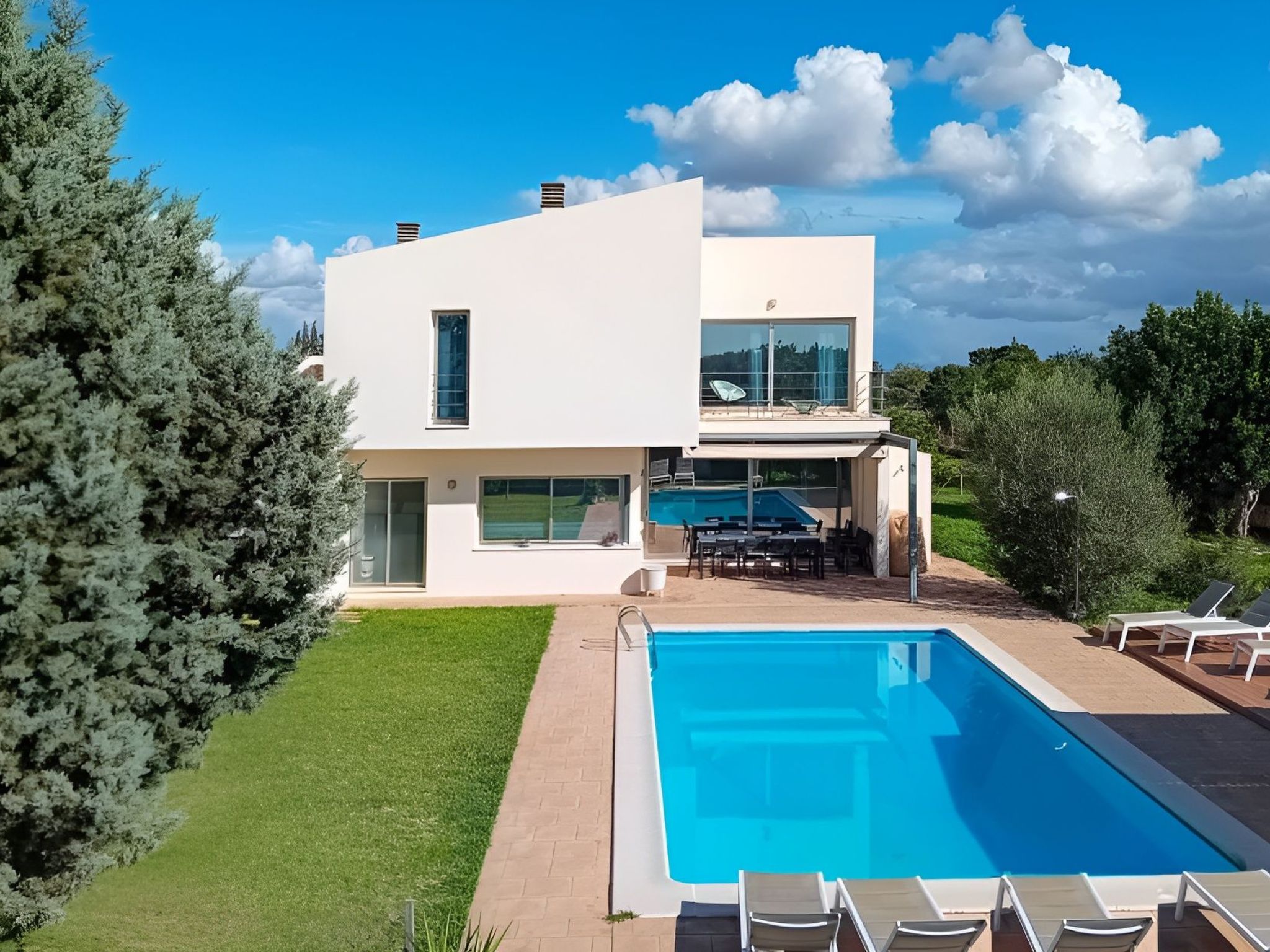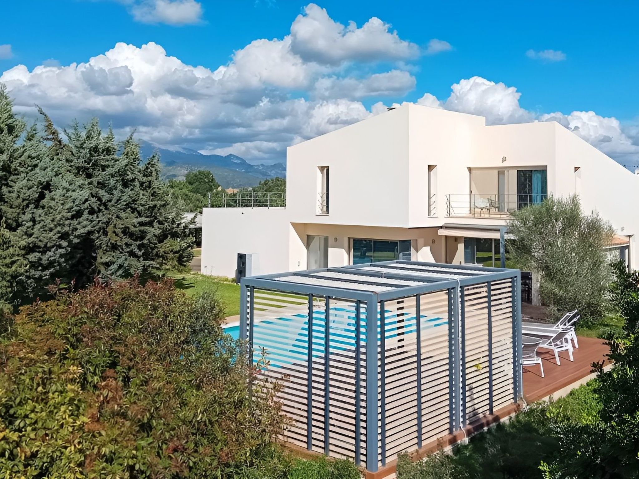 Der Außenbereich mit schattenspendender Sitzecke und Chillsofa ist wundervoll angelegt und der private 10 m x 5 m Swimming Pool ( Tiefe 1 m x 1,80 m ) ist komplett von einer großzügigen Rasenfläche umgeben. Zur weiteren Ausstattung gehören ebenfalls eine Waschmaschine, Wäschetrockner, Kinderhochstuhl und ein Babybett.