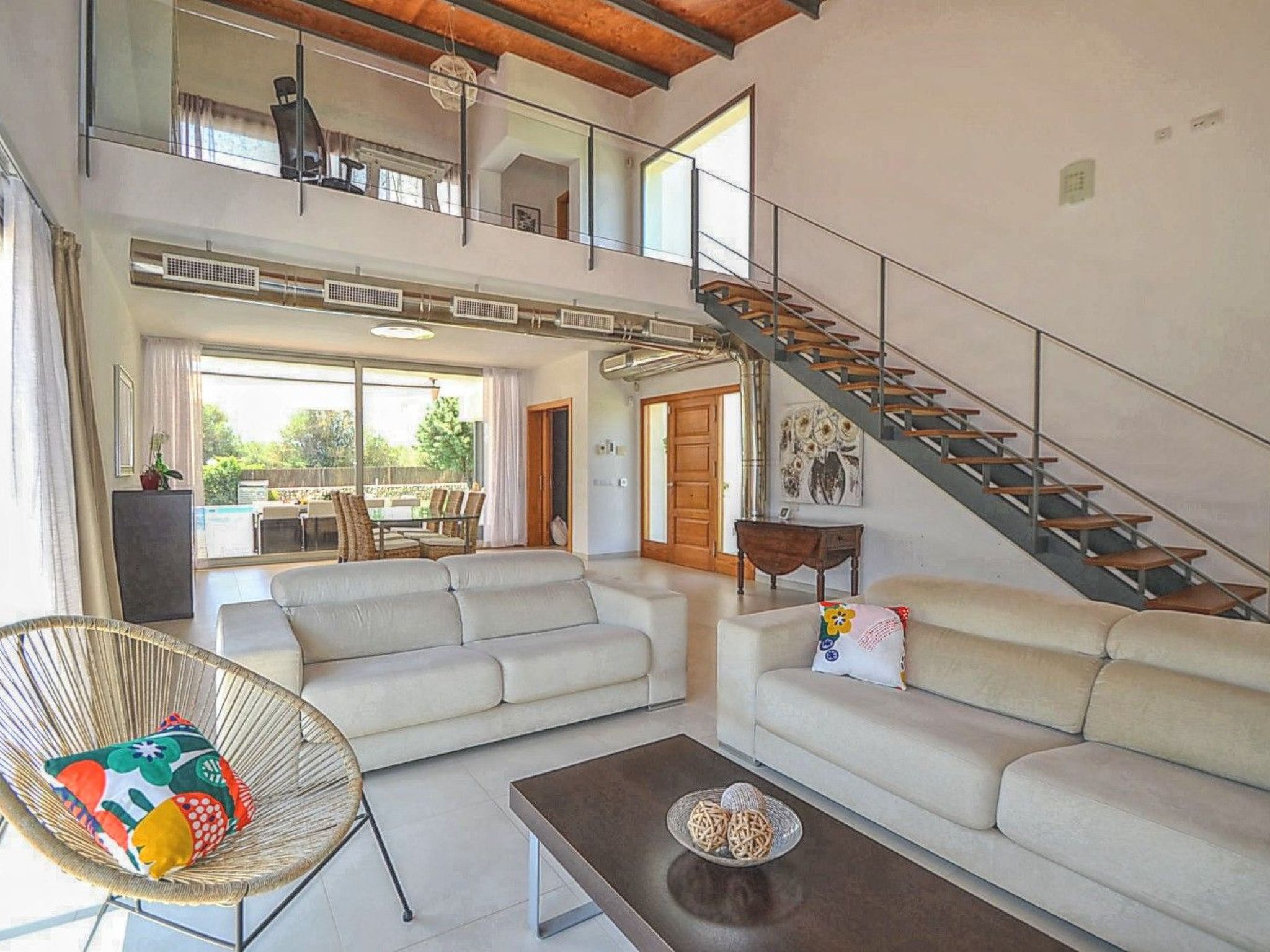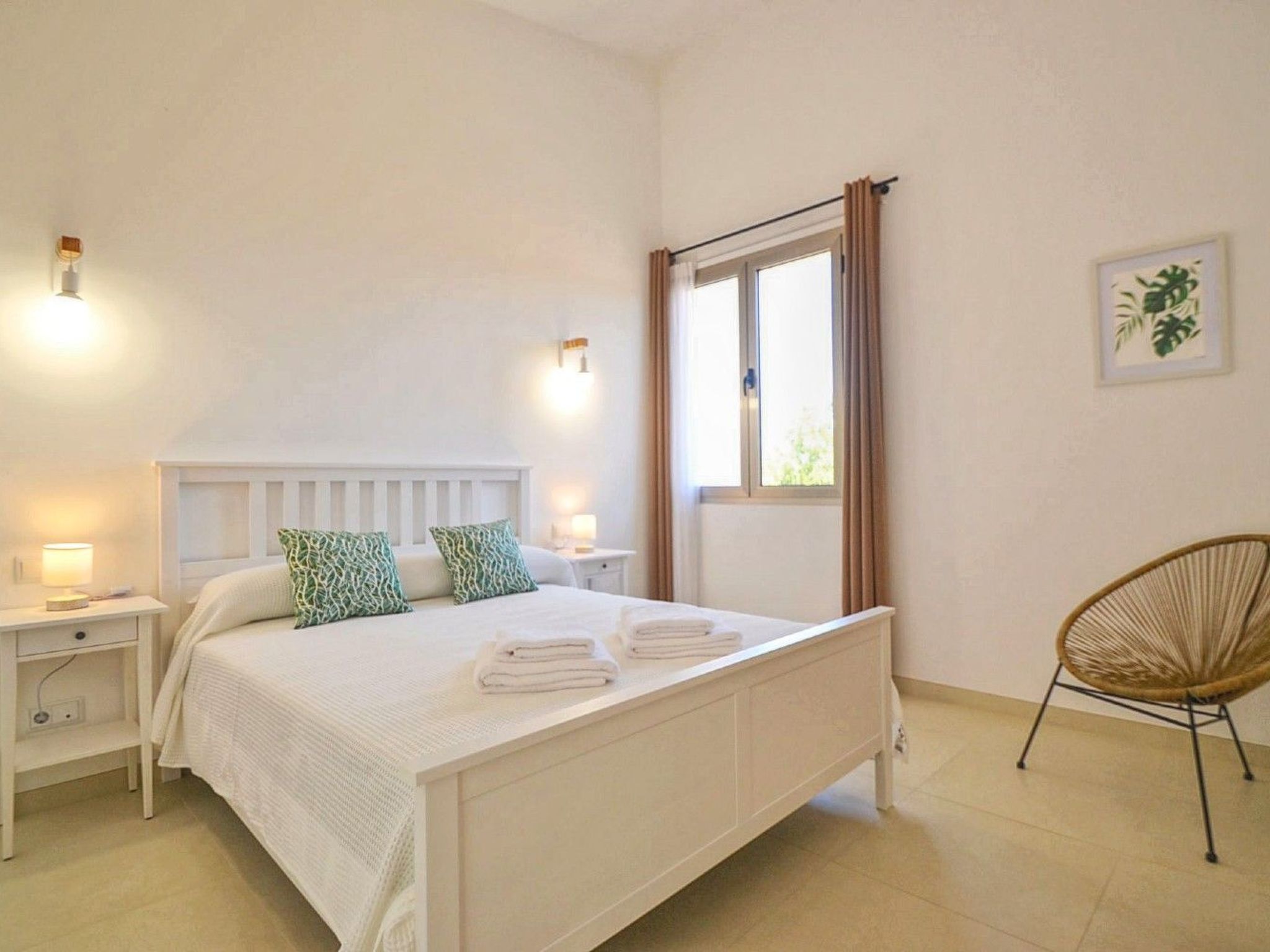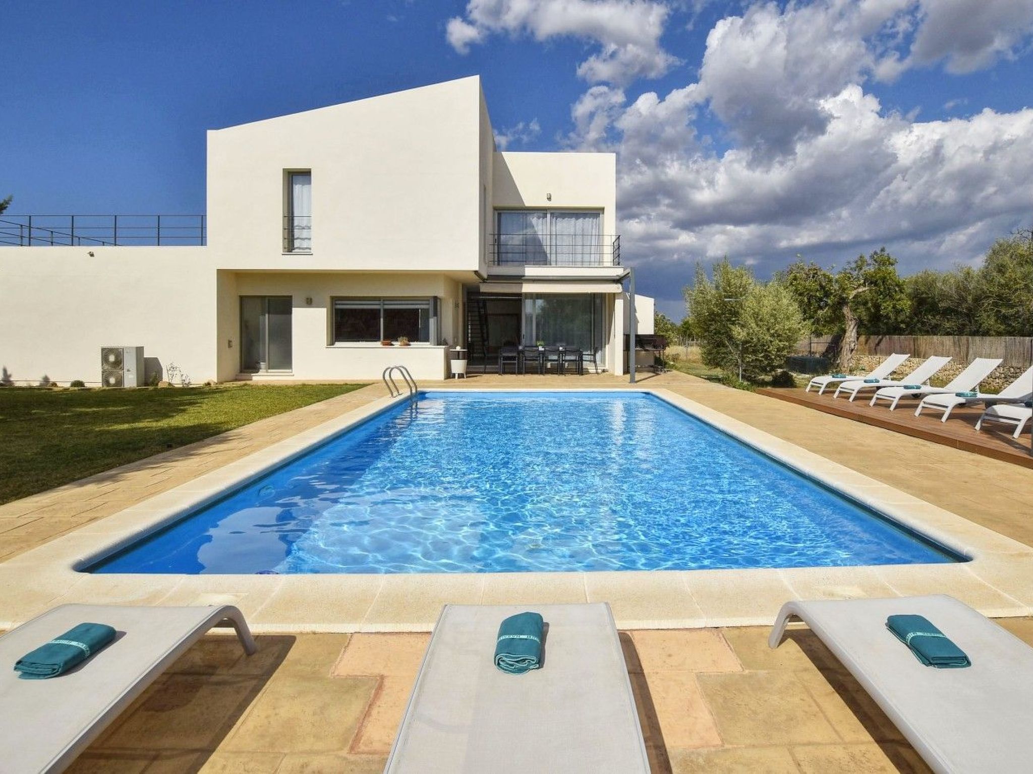 Von der Finca aus hat man einen traumhaften Ausblick auf das Tramuntana-Gebirge. Das Haus bietet auf etwa 325 m² ausreichend Platz für 10 Gäste. Komfortabel und modern eingerichtet gibt es insgesamt 5 Schlafzimmer ( 3x Doppelbet, 2x Einzelbetten ) alle mit Klimaanlage und 3 Badezimmer davon zwei EnSuite und ein Außen-WC. Das große offene lichtdurchflutete verglaste Wohn-Esszimmer mit Sat-TV und Internet WLAN hat einen schönen Blick auf die Poolterrasse. Hier liegt die hochmoderne Wohnküche mit 4 - Platten Herd, Mikrowelle, Backofen, Grill, Geschirrspüler gleich nebenan.