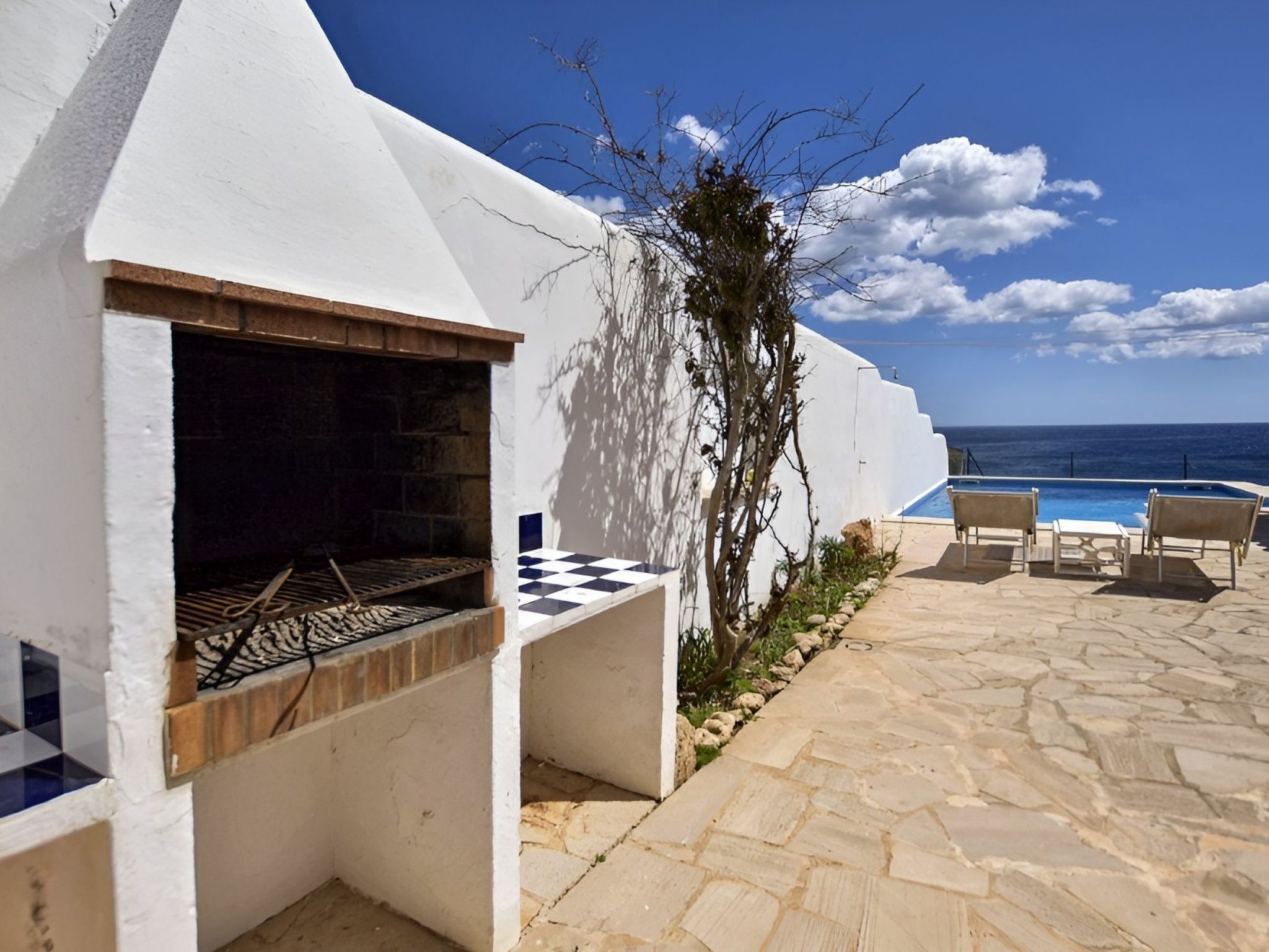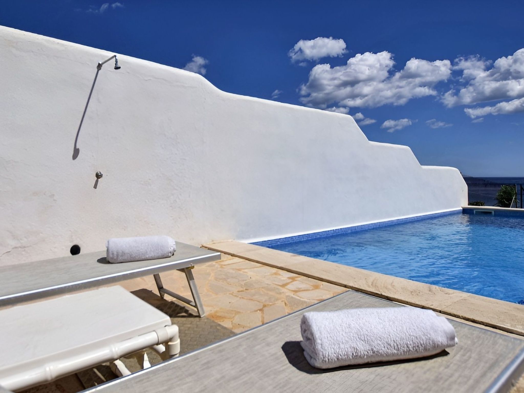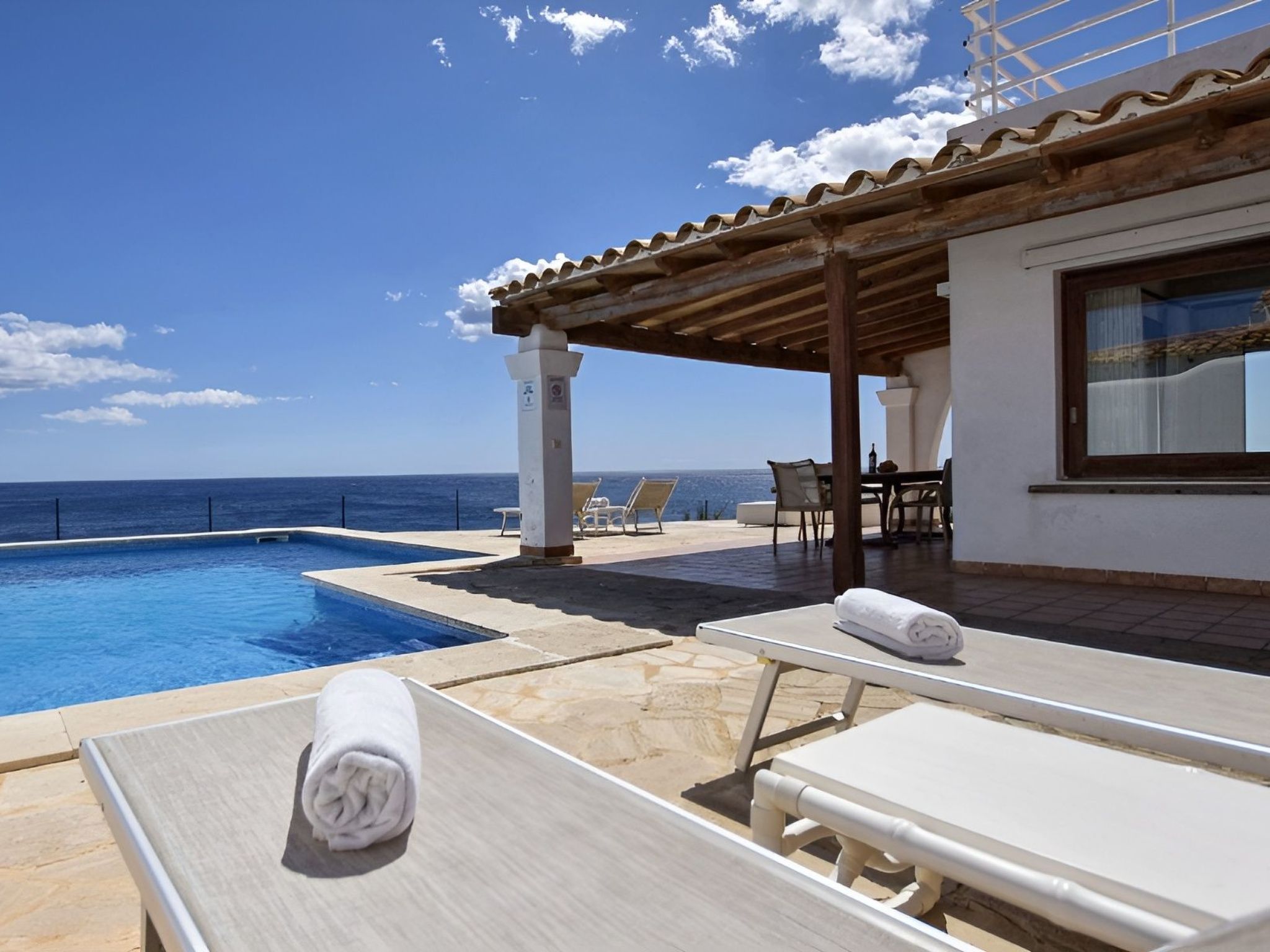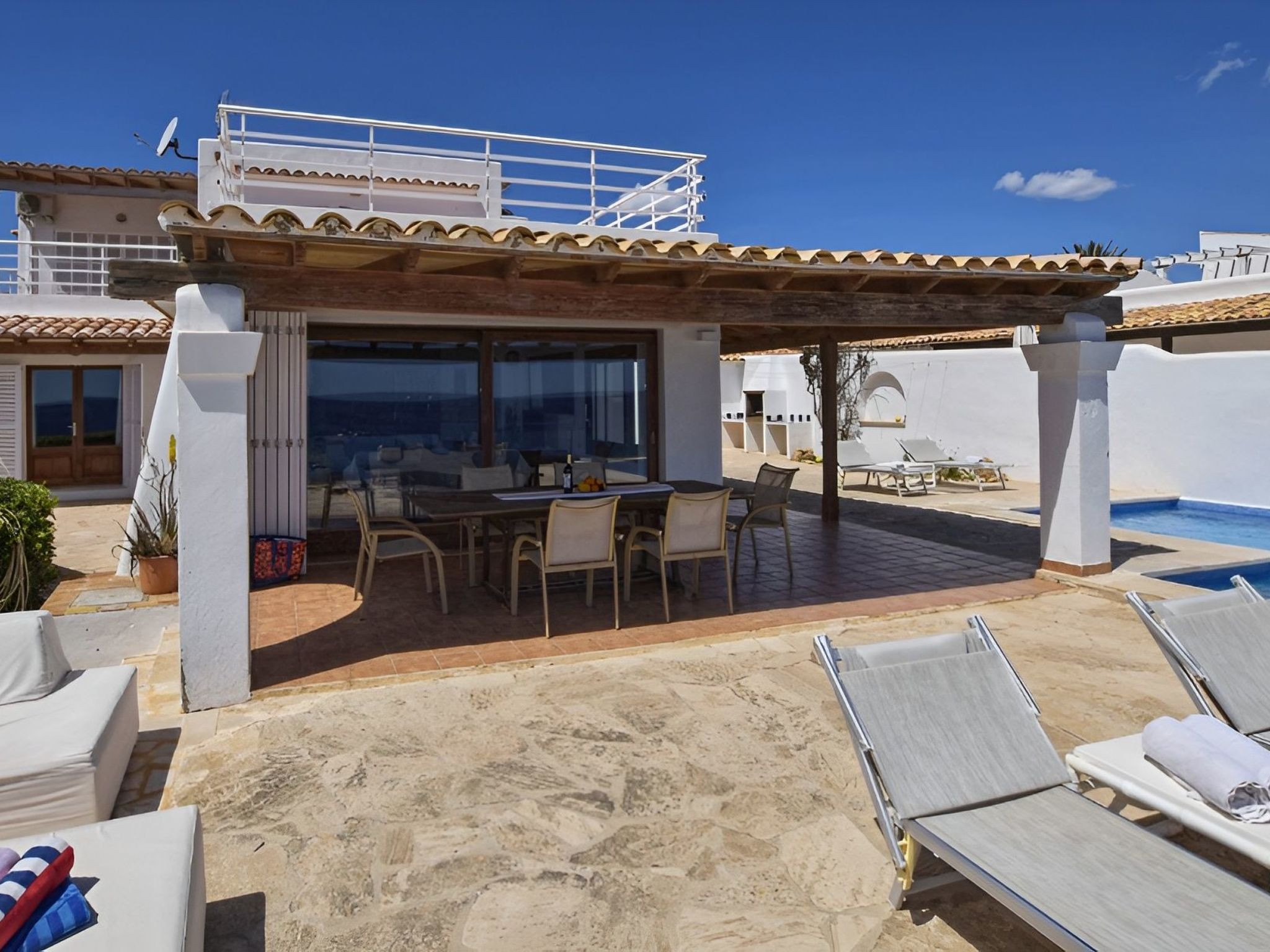 Vom Eingang aus erreichen Sie die geräumige, helle und voll ausgestattete Küche und das Wohnzimmer mit Satellitenfernsehen, von wo aus Sie ebenfalls einen fantastischen Meerblick genießen können! Das Wohnzimmer führt auf die gemütliche Terrasse mit Veranda und Esstisch. Hier auf der linken Seite finden Sie auch den 6 m x 5 m großen privaten Pool (Tiefe 0,80 m x 1,80 m, Zugang über eine Treppe) zur Abkühlung. Wenn Sie diese Terrasse erreicht haben, wissen Sie, dass der Urlaub jetzt beginnt. .... Spektakuläre Aussichten, das Meer liegt Ihnen zu Füßen!