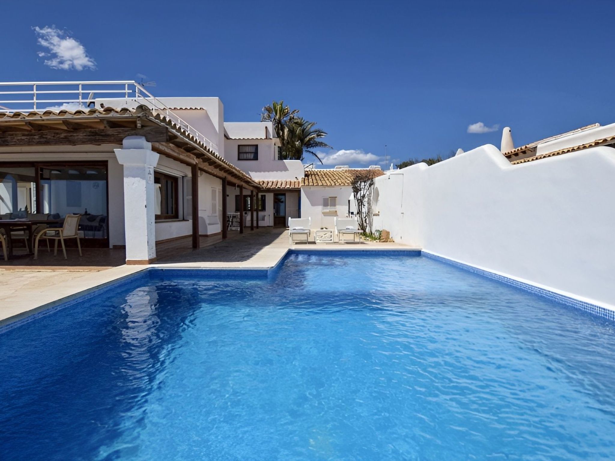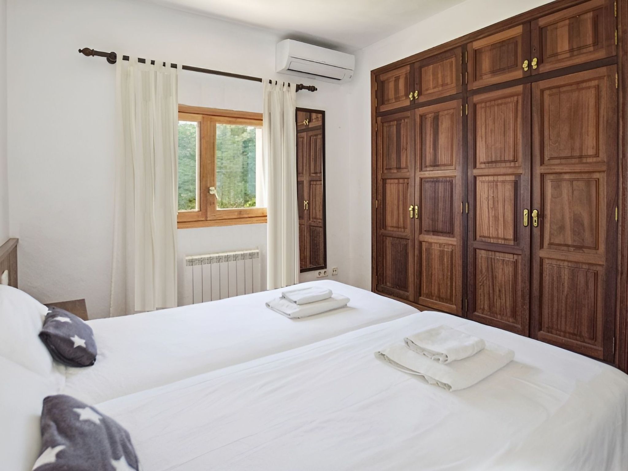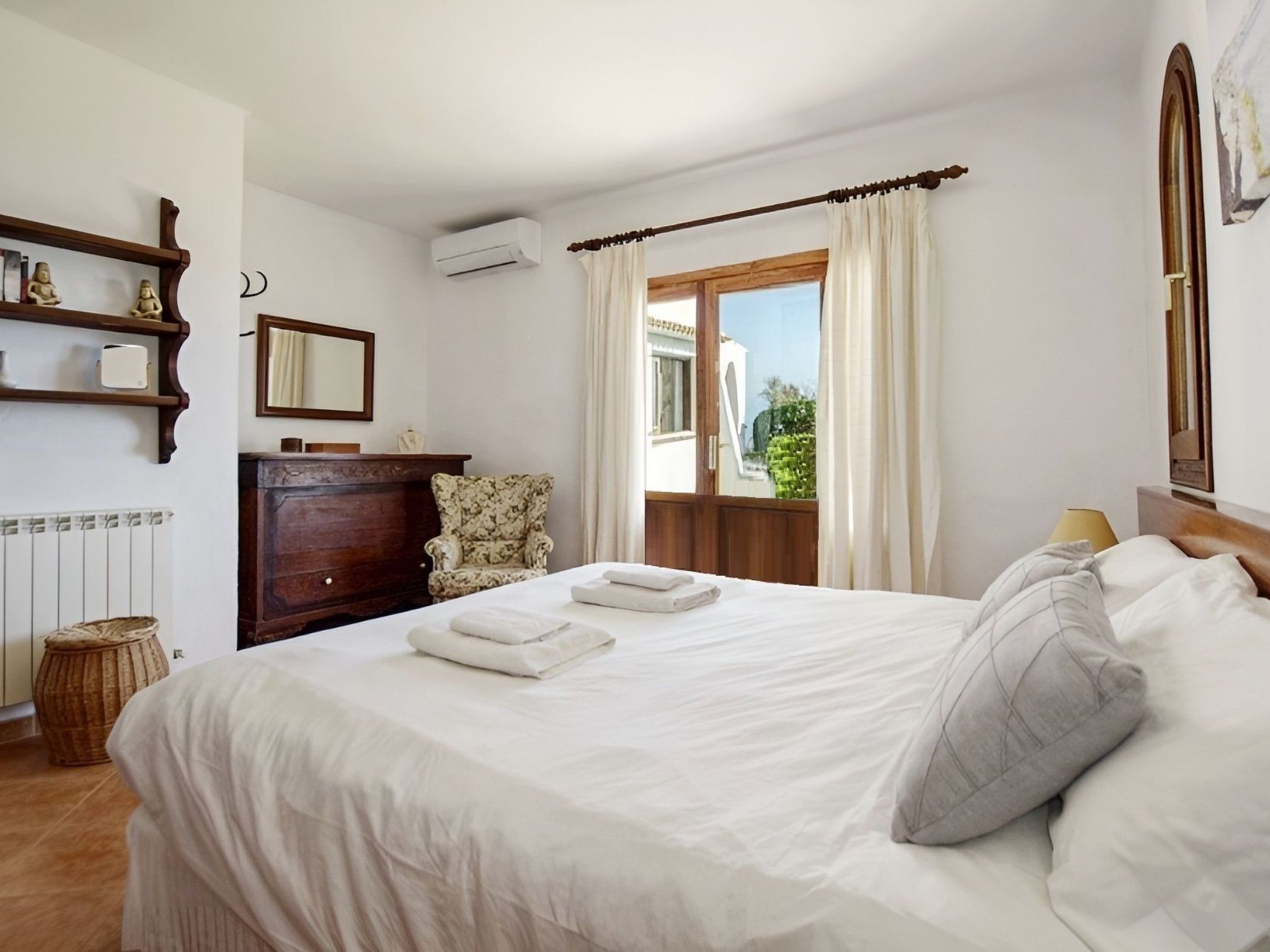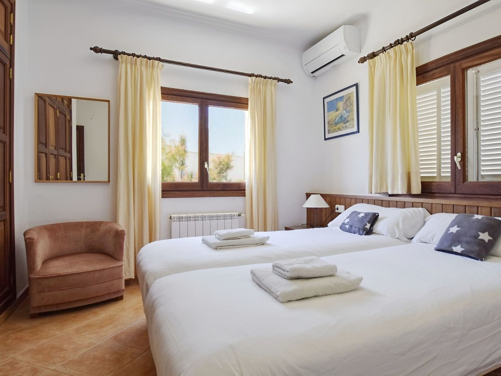 Auf 120 m² Wohnfläche bietet das Haus drei Schlafzimmer auf einer Etage (1 mit Doppelbett und 2 mit Einzelbetten) und insgesamt zwei Bäder (1 mit Dusche und 1 mit Duschbad EnSuite). Alle Schlafzimmer haben eine eigene Klimaanlage. Eines der Schlafzimmer ist die Suite mit eigenem Bad und Zugang zur Terrasse, natürlich mit Meerblick, aber von den Fenstern der anderen Schlafzimmer können Sie auch das Meer sehen.