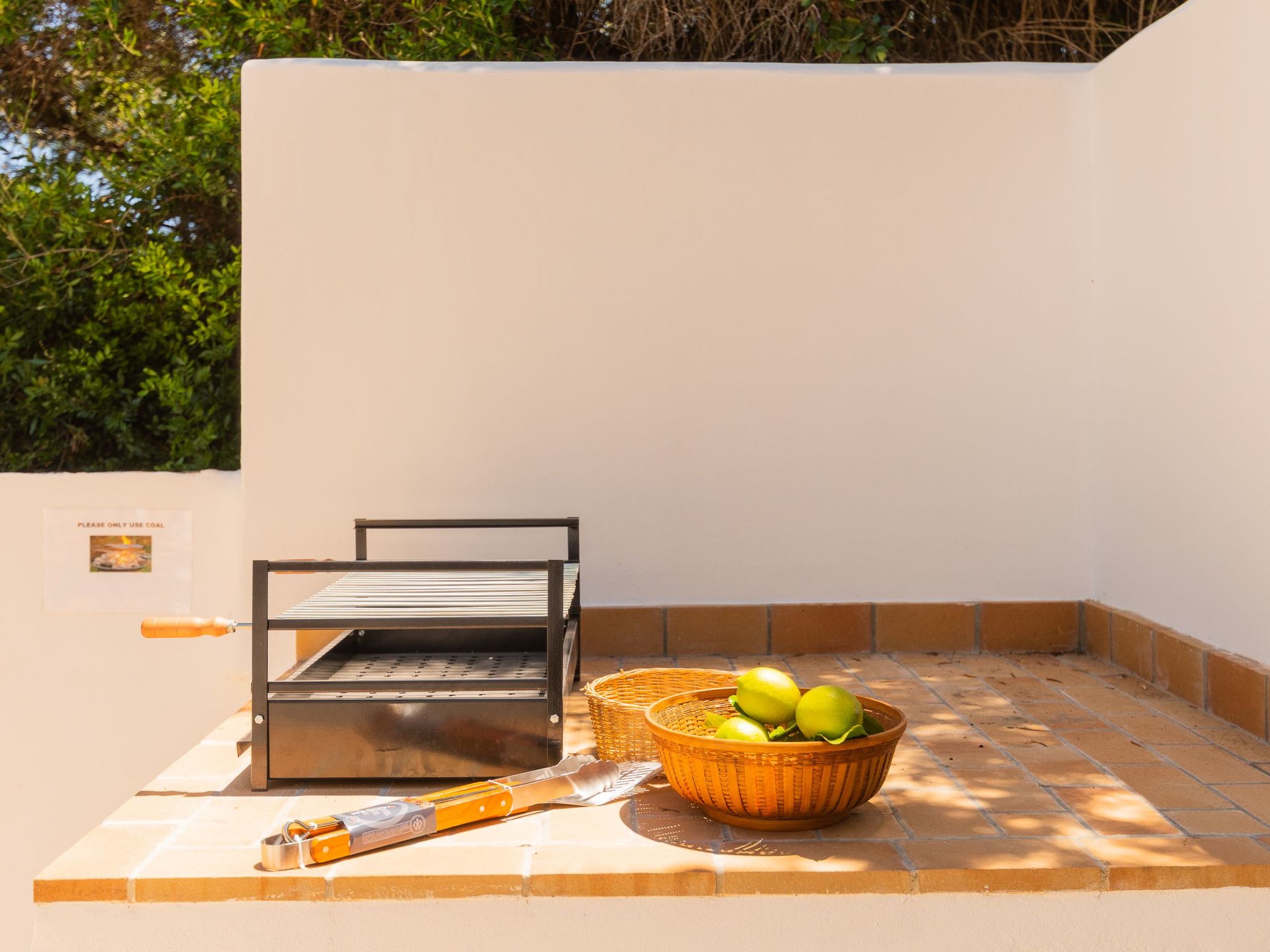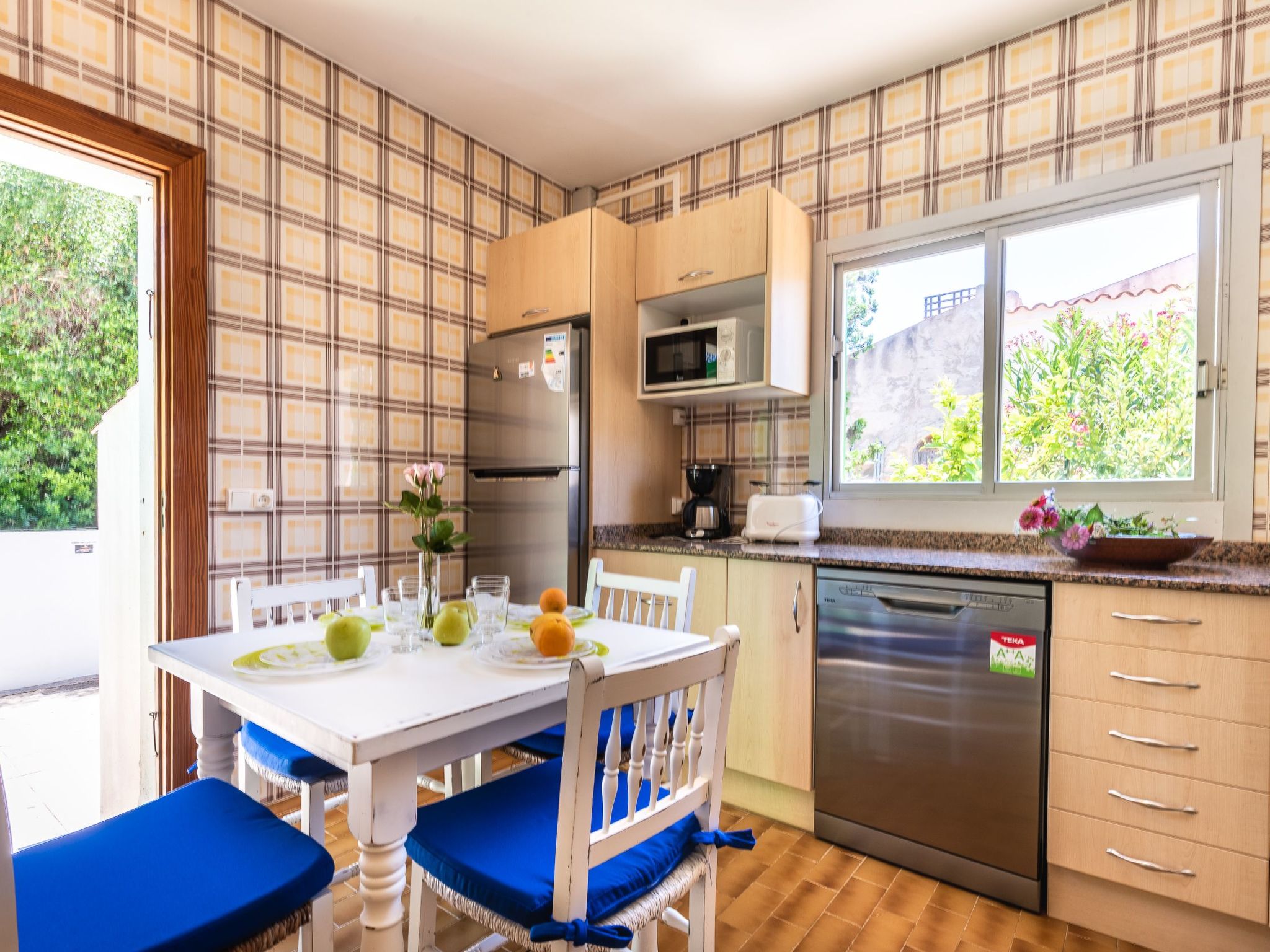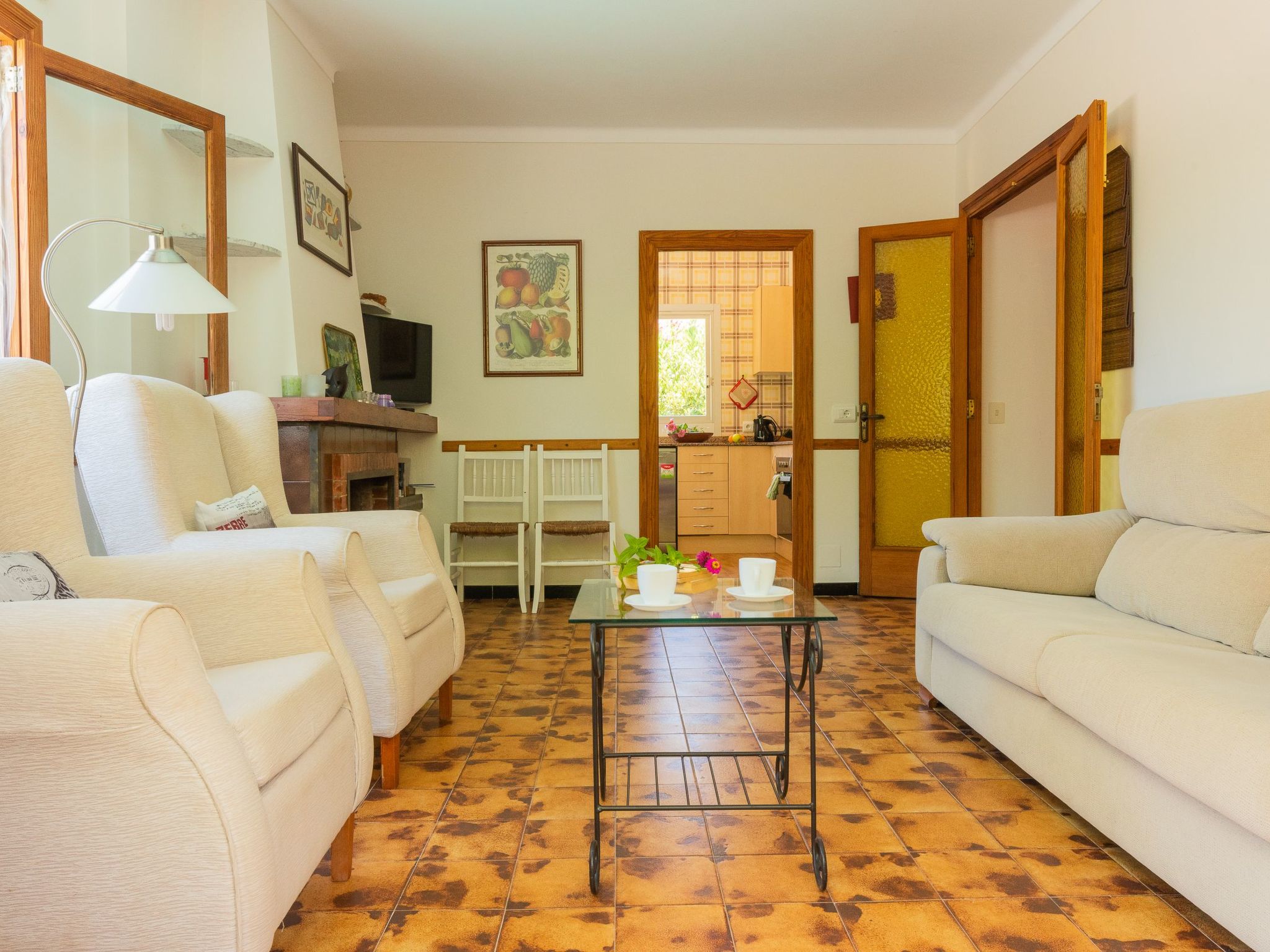 Wohnzimmer mit Sofas, Sat-TV und Kamin. Die komplett neue und voll ausgestattete Küche verfügt über Ceranfeld, 4-Platten-Herd, Elektrobackofen, Kühlschrank mit Gefrierfach, Geschirrspüler, Kaffeemaschine, Toaster und Mikrowelle. Drei Schlafzimmer: eines mit Doppelbett (150 x 190 cm) und zwei mit je zwei Betten (90 x 190 cm). Badezimmer mit Toilette. Es gibt auch eine Außendusche mit Toilette.