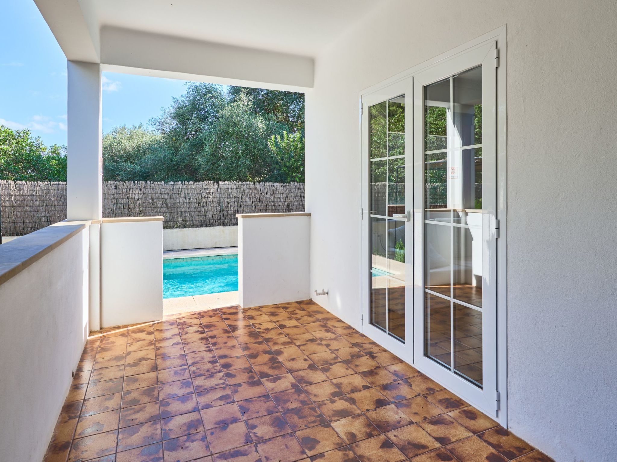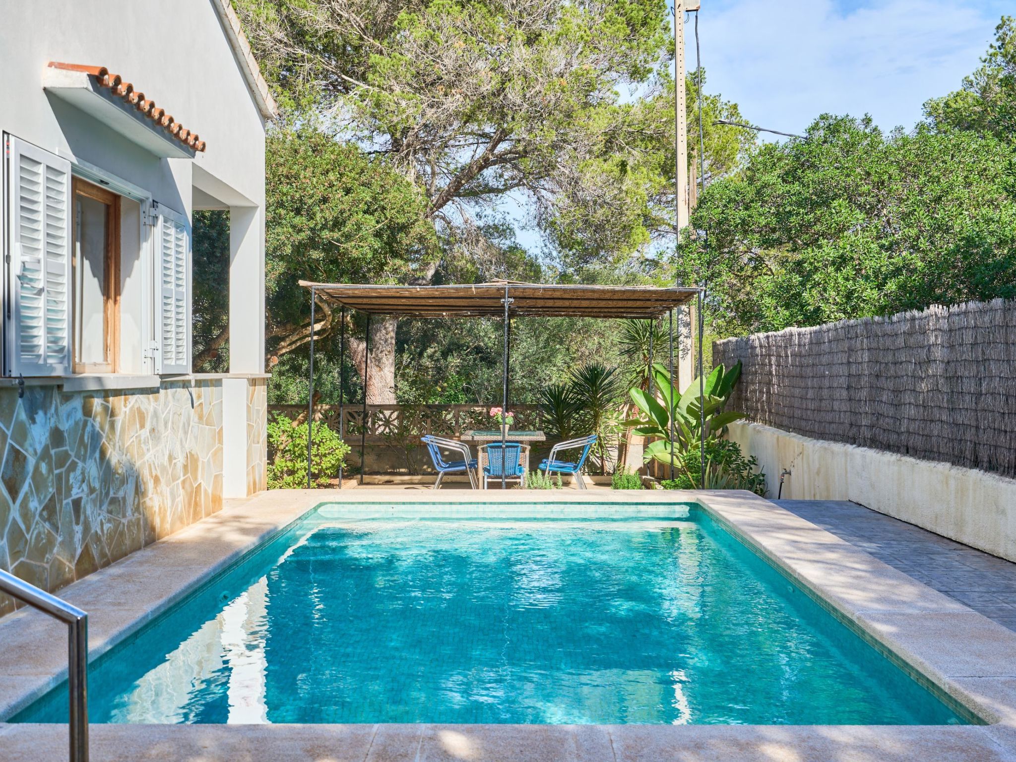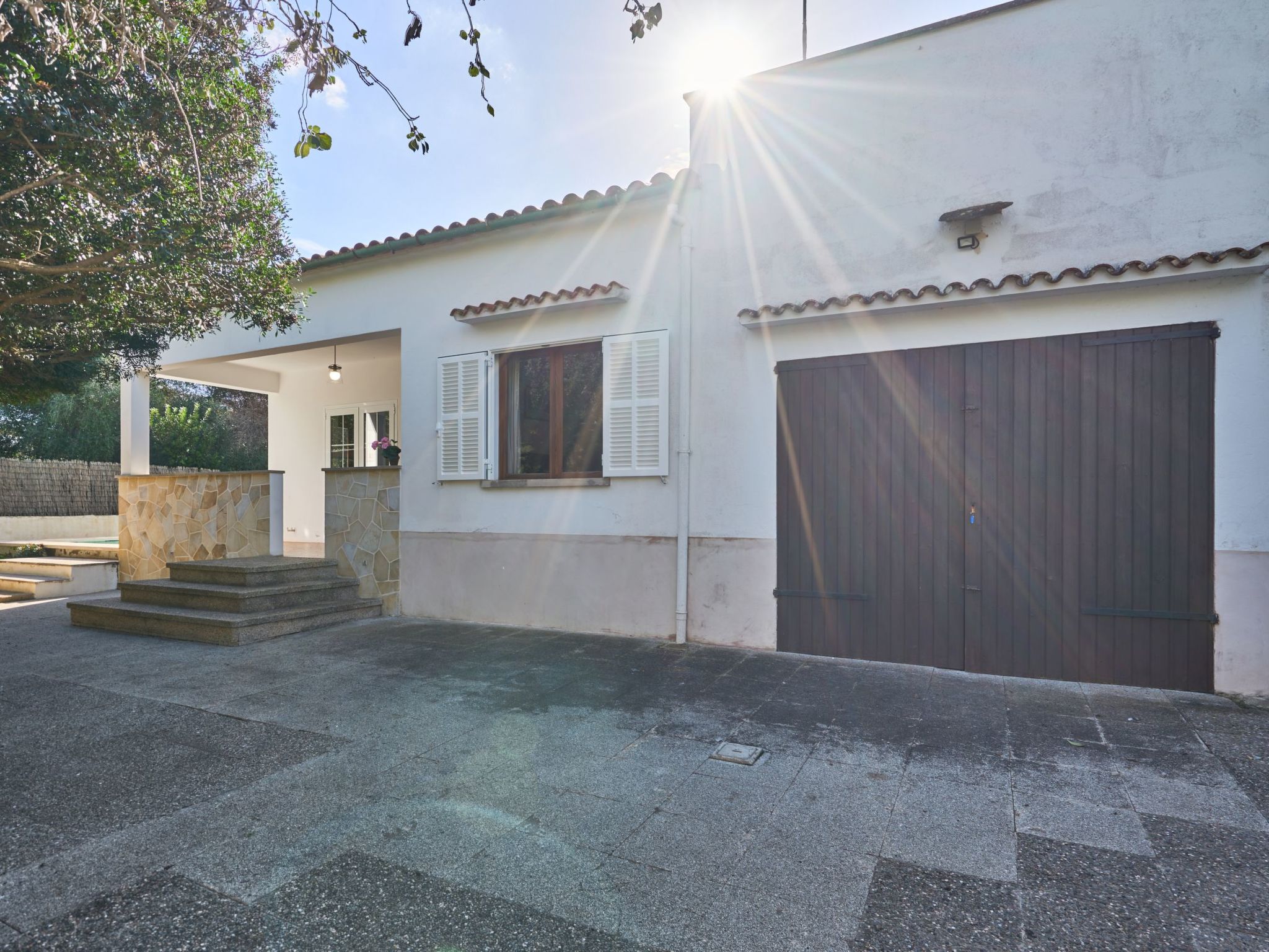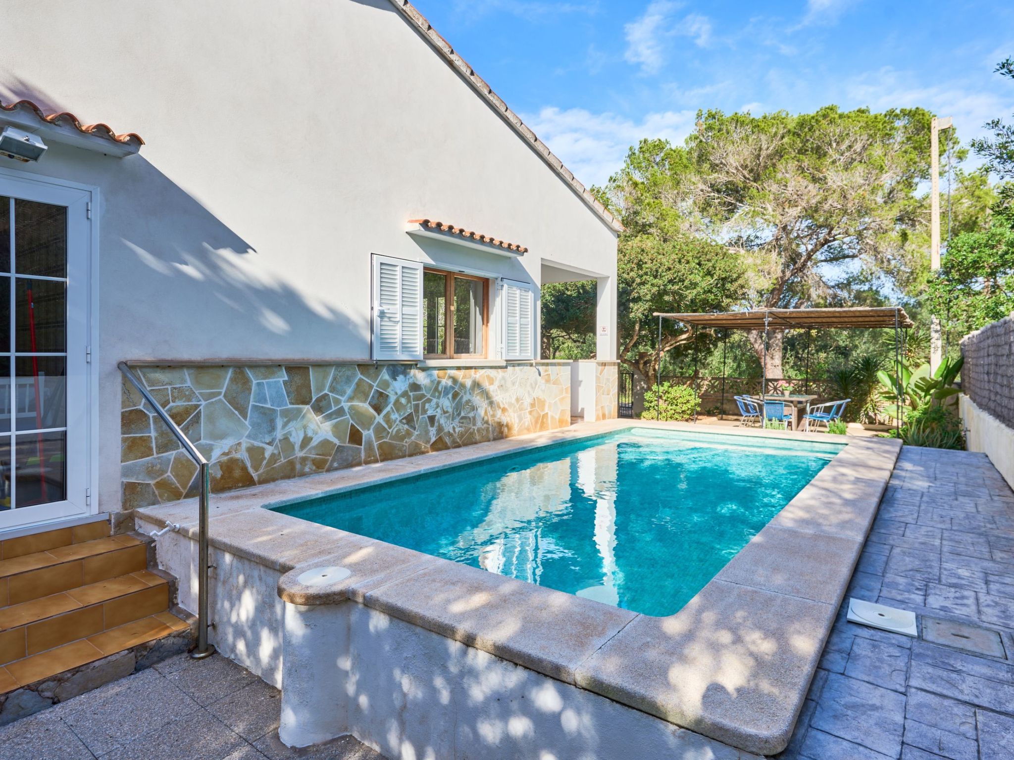 Drei Stufen führen auf die überdachte Terrasse und zum Eingang des Hauses. Das gemütliche Ferienhaus ES PINAR liegt auf einem ca. 400 m² großen, vollständig umzäunten Grundstück und bietet eine Wohnfläche von ca. 130 m²: