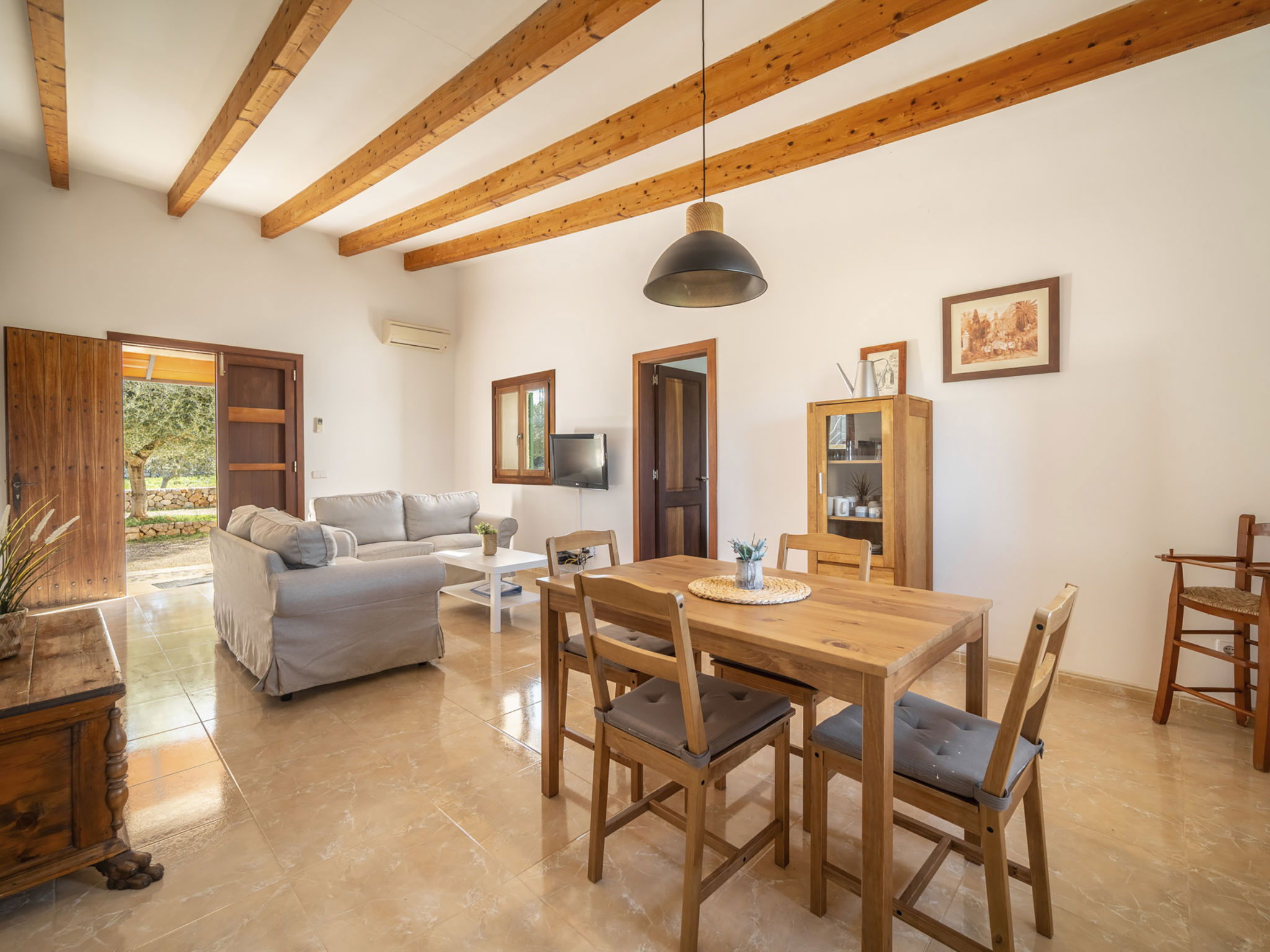 "Son Ulari Petit", 3-Zimmer-Haus 75 m2. Objekt geeignet für 4 Erwachsene. Rustikal und gemütlich eingerichtet: offenes Wohn-/Esszimmer mit Esstisch, Sat-TV, Digital-TV, Flachbildschirm und Ventilator. Ausgang zum Gartensitzplatz, zum Schwimmbad. 2 Doppelzimmer, jedes Zimmer mit 2 Betten (90 cm, Länge 200 cm), Klimaanlage und Warmluftheizung. Küche (Backofen, Geschirrspüler, 4 Glaskeramikplatten, Toaster, Wasserkocher, Mikrowelle, Tiefkühler, elektrische Kaffeemaschine). Dusche/WC. Terrasse 10 m2, Terrasse 15 m2, überdacht, Gartensitzplatz. Terrassenmöbel, Gartengrill, Liegestühle (4). Sicht auf das Schwimmbad, den Garten und die Landschaft. Zur Verfügung: Waschmaschine, Wäschetrockner, Bügeleisen, Kinderhochstuhl, Babybett bis 2 Jahre, Haartrockner. Internet (WLAN, gratis). Bitte beachten: geeignet für Familien. Nichtraucher-Haus. Maximal 1 Haustier/Hund erlaubt. ETV/16269