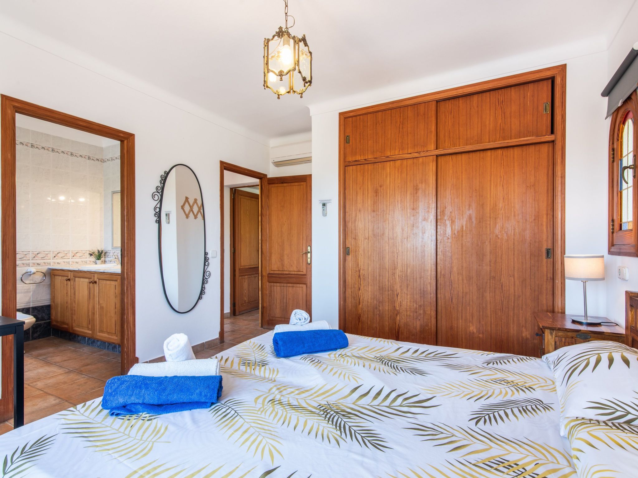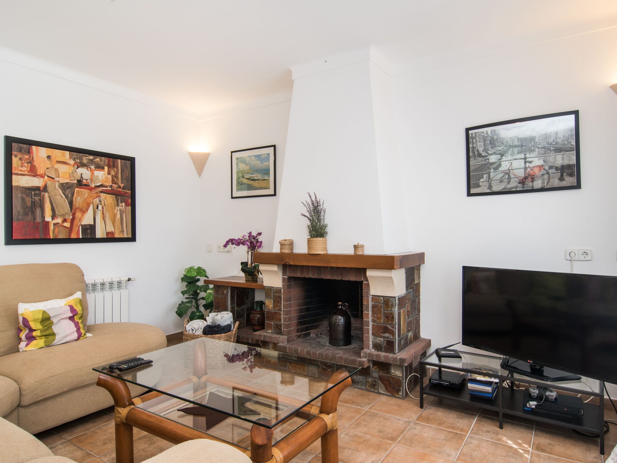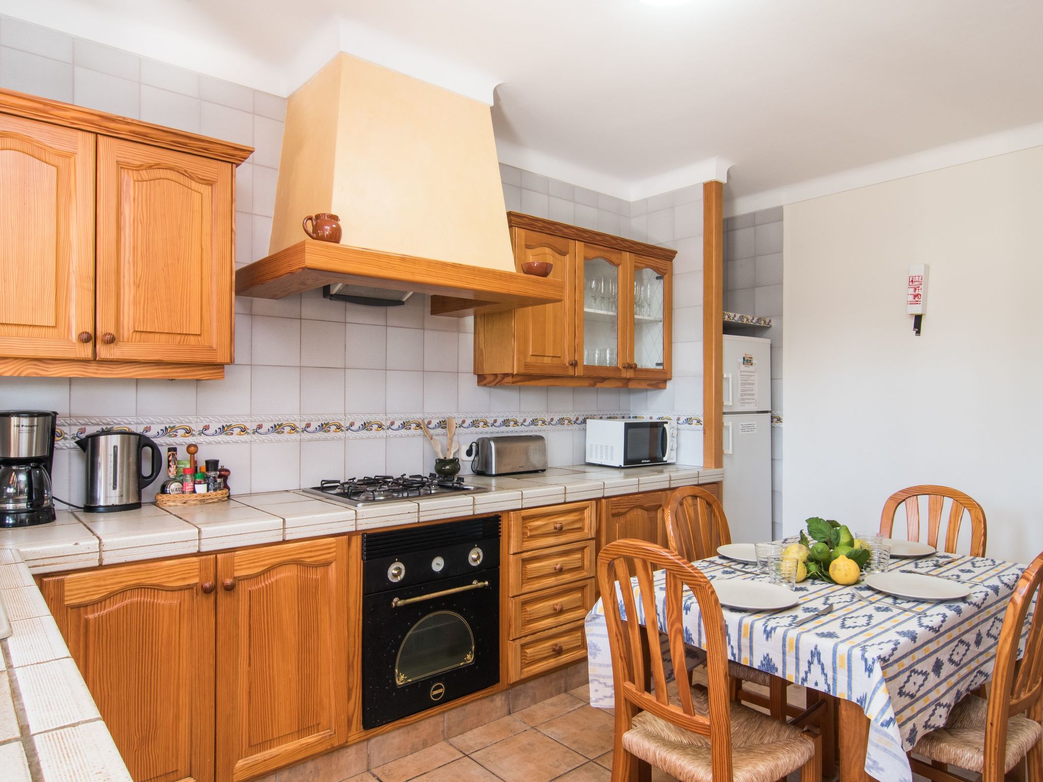 Das Haus hat eine Wohnfläche von ca. 170 m², die sich auf zwei Etage verteilen, und kann bis zu 6 Personen problemlos unterbringen. Im Erdgeschoss gibt es die Diele, die Küche, welche komplett ausgestattet ist (Herd, Kühlschrank, Geschirrspüler, Teekanne, Toaster, Mikrowelle,...), ein kleines Bad mit WC, Dusche und einer Waschmaschine. Desweiteren befindet sich hier noch das Esszimmer und der Wohnbereich mit TV, dvd, Bücher, Couchgarnitur, Kamin,...In der ersten Etage befinden sich die 3 Schlafzimmer, zwei sind mit je 2 Einzelbetten (0,90m) ausgestattet; das dritte besitzt ein Doppelbett mit 1,50m Breite und ein direktes Badezimmer (Badewanne, Bidet, WC,...). In allen Schlafzimmern gibt es Klimaanlage. In der ersten Etage gibt es auch noch ein weiteres Badezimmer mit Badewanne, WC und Bidet. Alle Zimmer haben Blick nach außen.