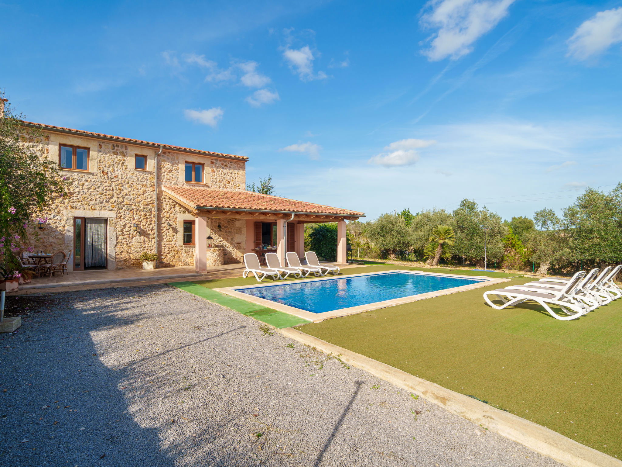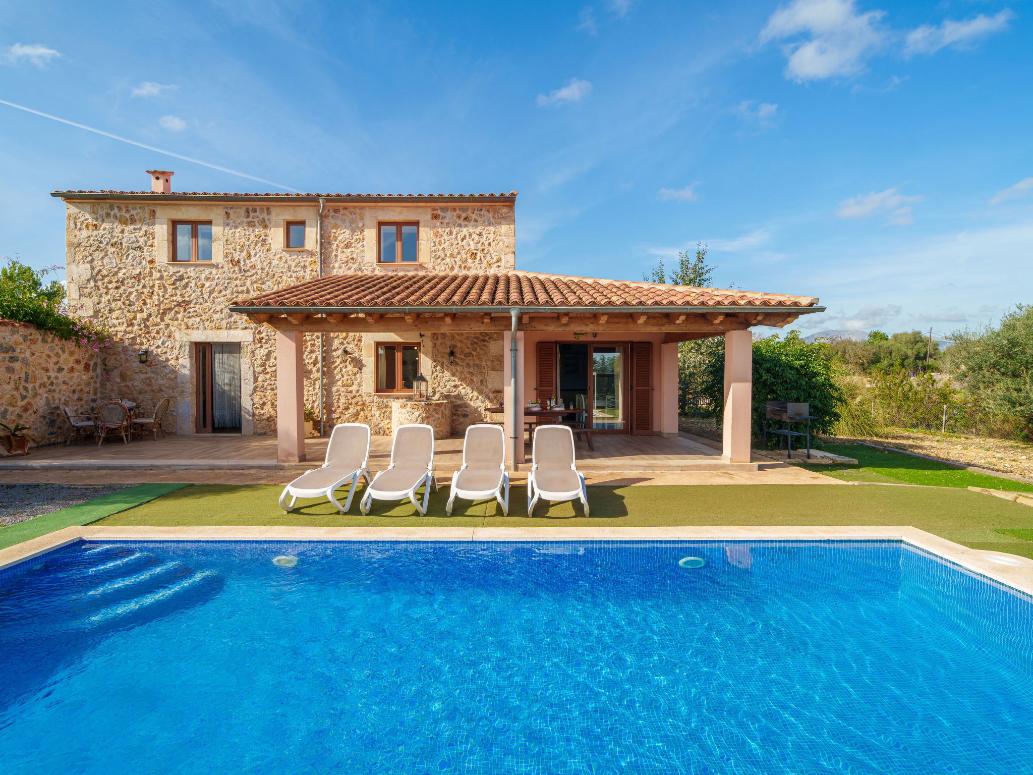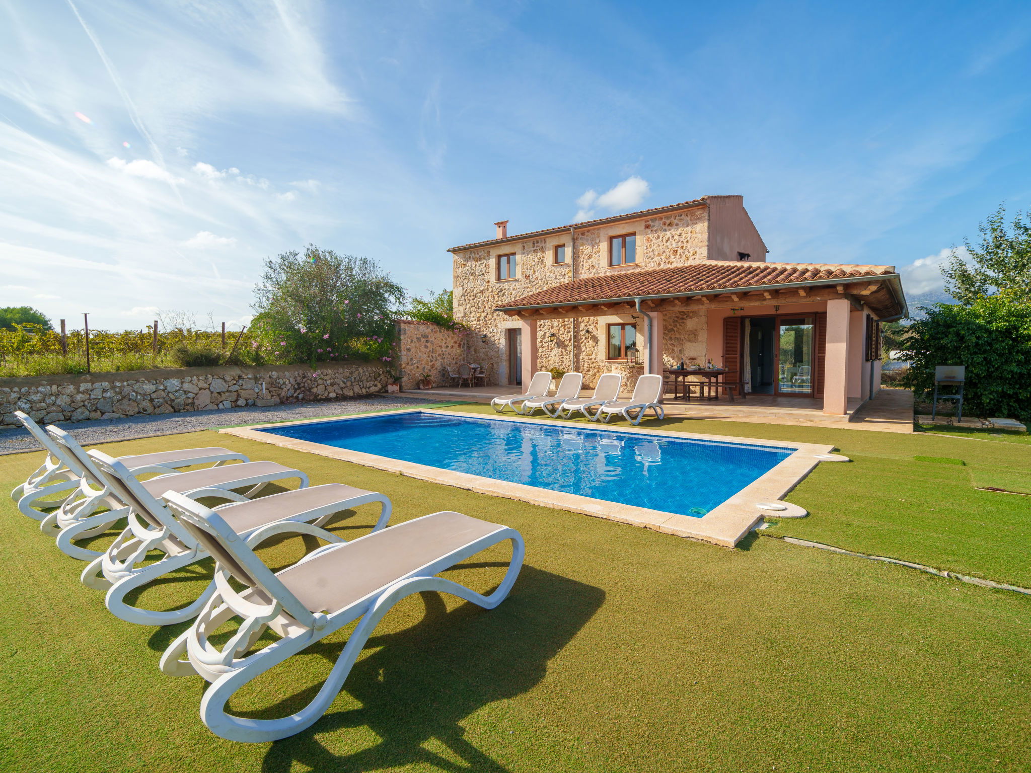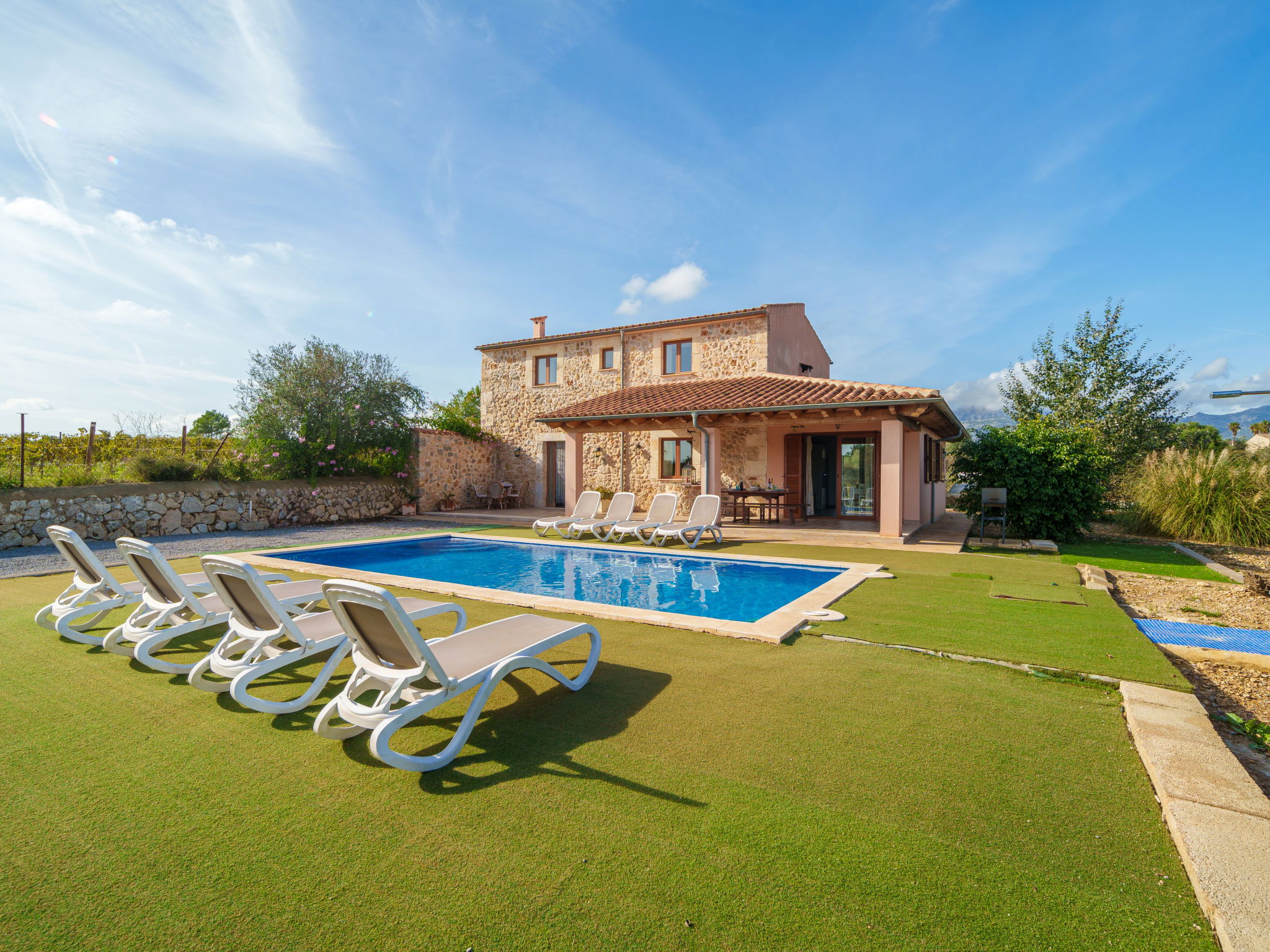 2 km von Inca: Sehr grosse, schöne, komfortable Finca "Can Blancos", auf 2 Stockwerken, renoviert. Ausserhalb des Ortes, sonnige Lage, 2 km vom Waldrand, 25 km vom Meer, im Grünen. Zur Alleinbenutzung: naturbelassenes Grundstück (eingezäunt), grosser, schöner Garten mit Pflanzen und Bäumen, Schwimmbad eckig (7 x 4 m, saisonale Verfügbarkeit: 01.Jan. - 31.Dez.). Aussendusche, Tischtennis, Sitzplatz, Laube, Pergola, Gartenmöbel, Grill. Im Hause: Internetzugang, Wireless LAN, Einstellraum für Fahrräder, Klimaanlage, Waschmaschine. Parkplatz (überdacht) beim Haus auf dem Grundstück. Einkaufsgeschäft 2.5 km, Supermarkt 1.5 km, Einkaufszentrum 15 km, Restaurant 2 km, Bar 1.5 km, Bäckerei 1.5 km, Zentrum zu Fuss in 20 Minuten erreichbar, Bushaltestelle 1.8 km, Bahnstation 2.7 km, Sandstrand 25 km, Felsstrand 28 km. Golfplatz (18 Loch) 29 km, Tennis 2.5 km. Nahe gelegene Sehenswürdigkeiten: Puig de Santa Magdalena, Museo del Calzado, Monasterio de Lluc, saclasta.com. Bitte beachten: geeignet für Familien, geeignet für Senioren. Objekt geeignet für 8 Erwachsene. Der Besitzer akzeptiert keine Jugendgruppen. Be- und Entladen am Ferienhaus möglich. Tiere in der Umgebung.