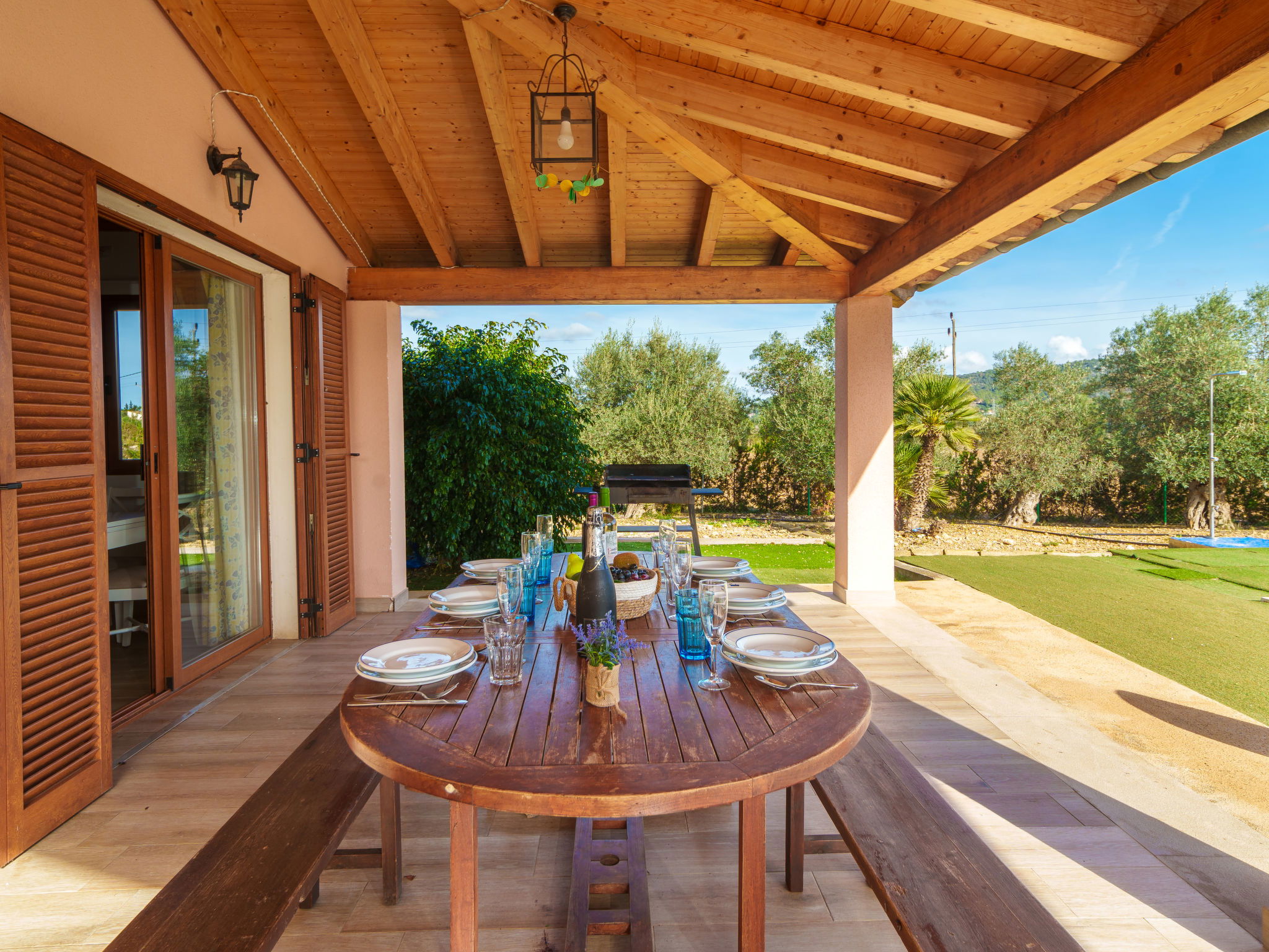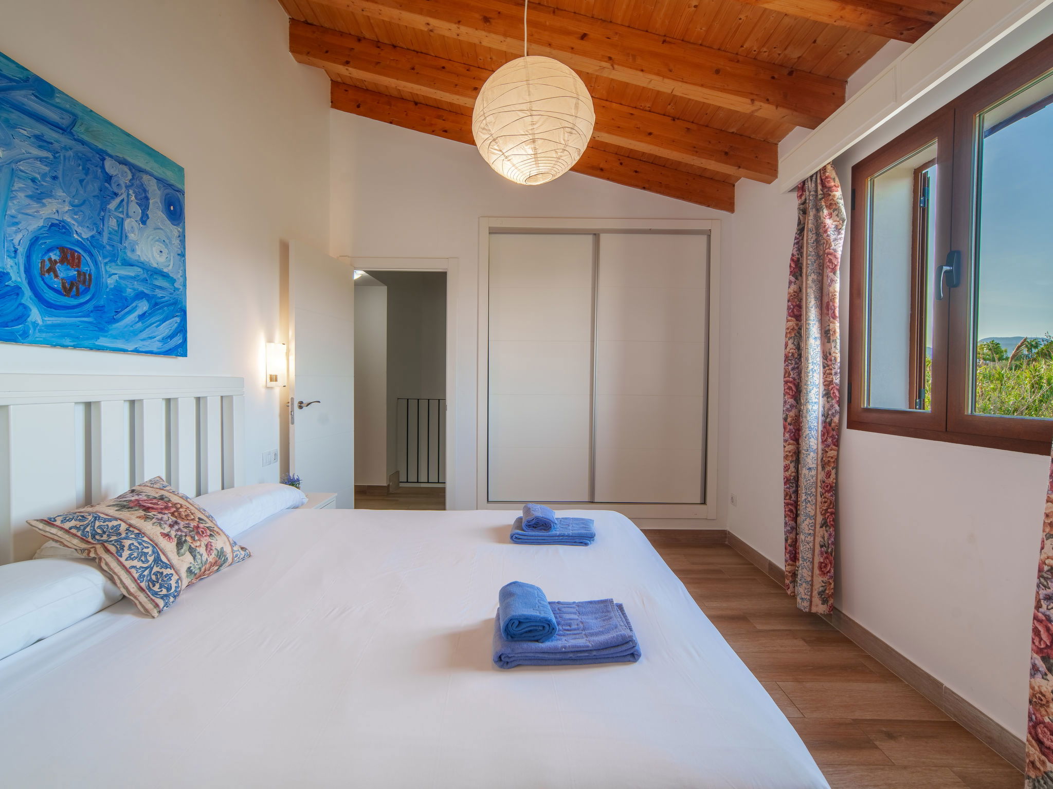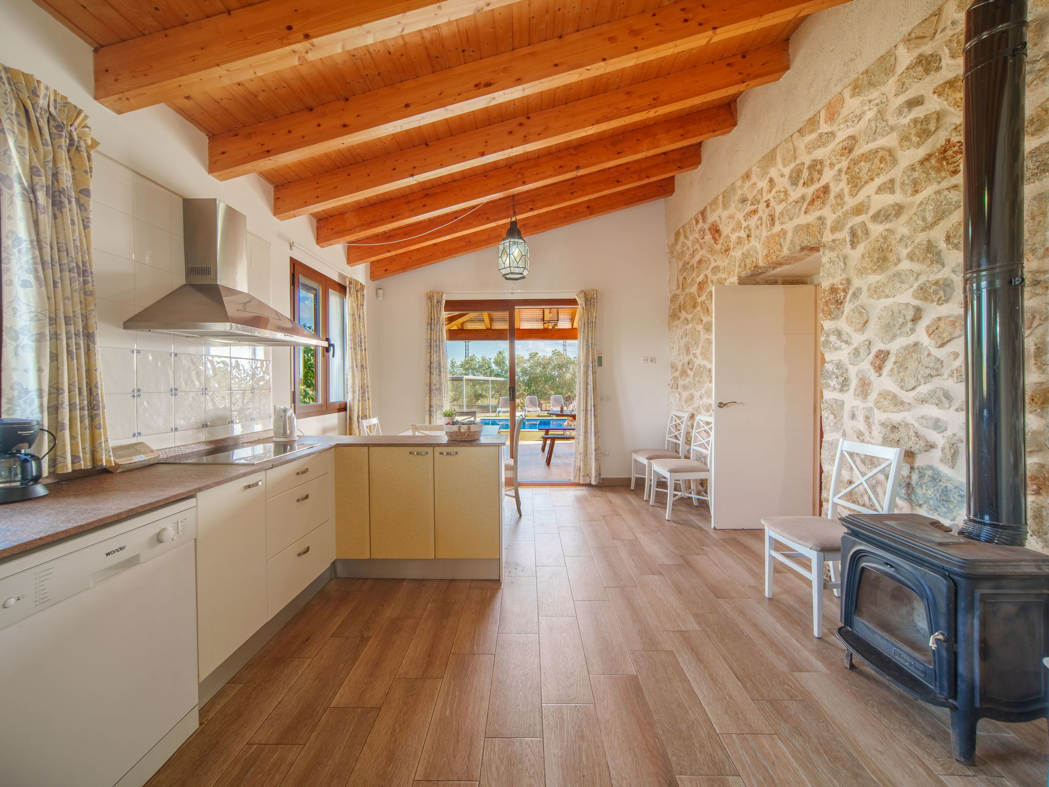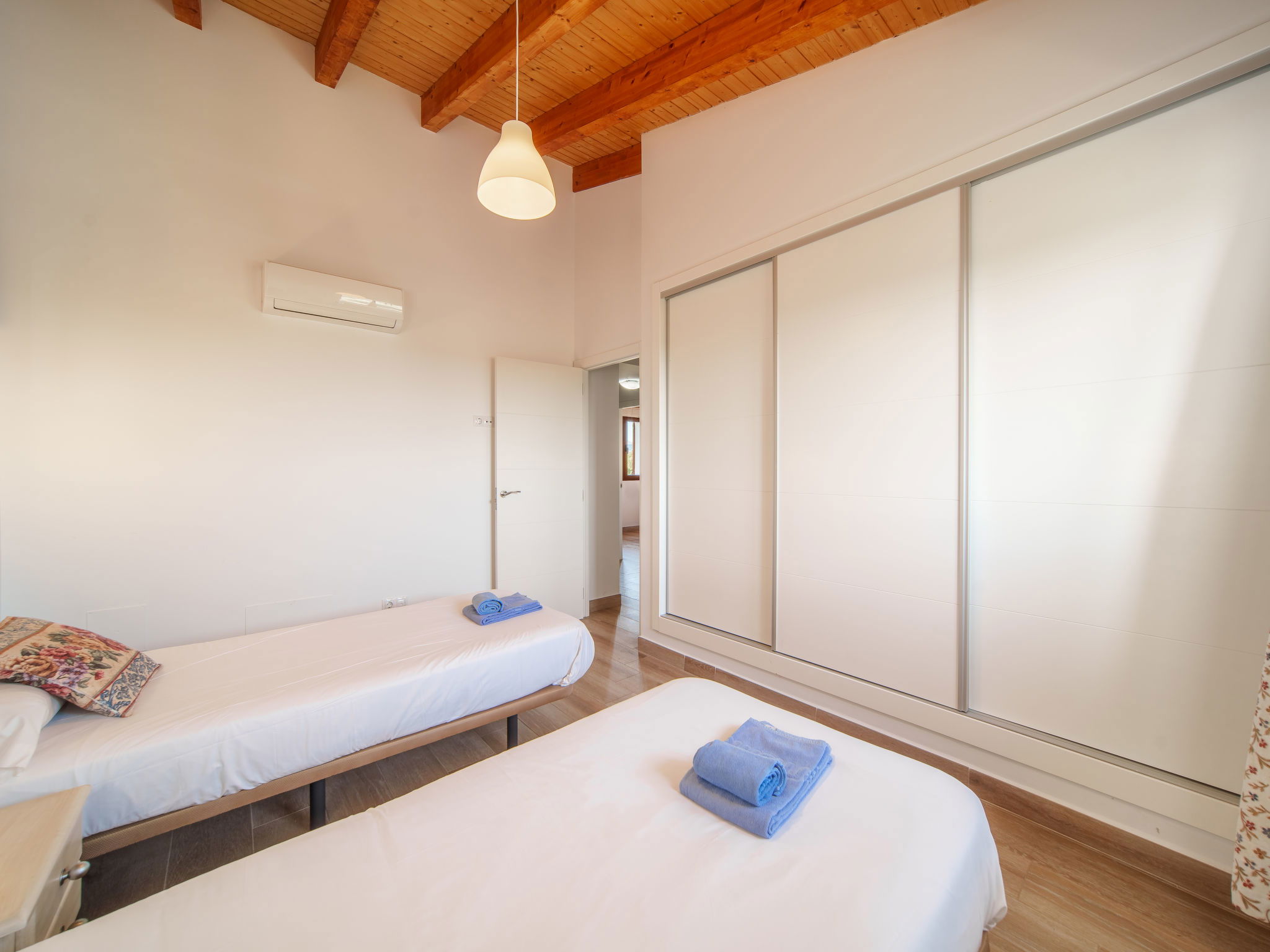 "Can Blancos", 5-Zimmer-Villa 180 m2 auf 2 Stockwerken. Objekt geeignet für 8 Erwachsene. Geräumig und hell, sehr komfortabel und gemütlich eingerichtet: grosses Wohn-/Esszimmer mit Panoramafenster mit offenem Kamin (nur Deko), Esstisch, Sat-TV, Digital-TV, Flachbildschirm, Klimaanlage und Warmluftheizung. Ausgang zum Gartensitzplatz, zum Schwimmbad. 1 Doppelzimmer mit 2 Betten (90 cm), Klimaanlage und Warmluftheizung. Wohnküche (Backofen, Geschirrspüler, 3 Glaskeramikplatten, Toaster, Wasserkocher, Mikrowelle, Tiefkühler, elektrische Kaffeemaschine) mit Bar, Esstisch. Ausgang zum Gartensitzplatz, zum Schwimmbad. Bad/Dusche/WC. Obergeschoss: 2 grosse Doppelzimmer mit Panoramafenster, jedes Zimmer mit 1 franz. Bett, Klimaanlage und Warmluftheizung. 1 grosses Doppelzimmer mit Panoramafenster mit 2 Betten (90 cm), Klimaanlage und Warmluftheizung. Bad/Dusche/WC. Grosser Gartensitzplatz, Laube. Terrassenmöbel, Gartengrill, Liegestühle, Loggia, Abstellkammer. Sehr schöne Sicht auf die Berge und die Landschaft. Zur Verfügung: Waschmaschine, Bügeleisen, Kinderhochstuhl, Babybett bis 2 Jahre, Haartrockner. Internet (WLAN, gratis). Parkplatz (überdacht, eingezäunt). Geeignet für Familien. ETV10551