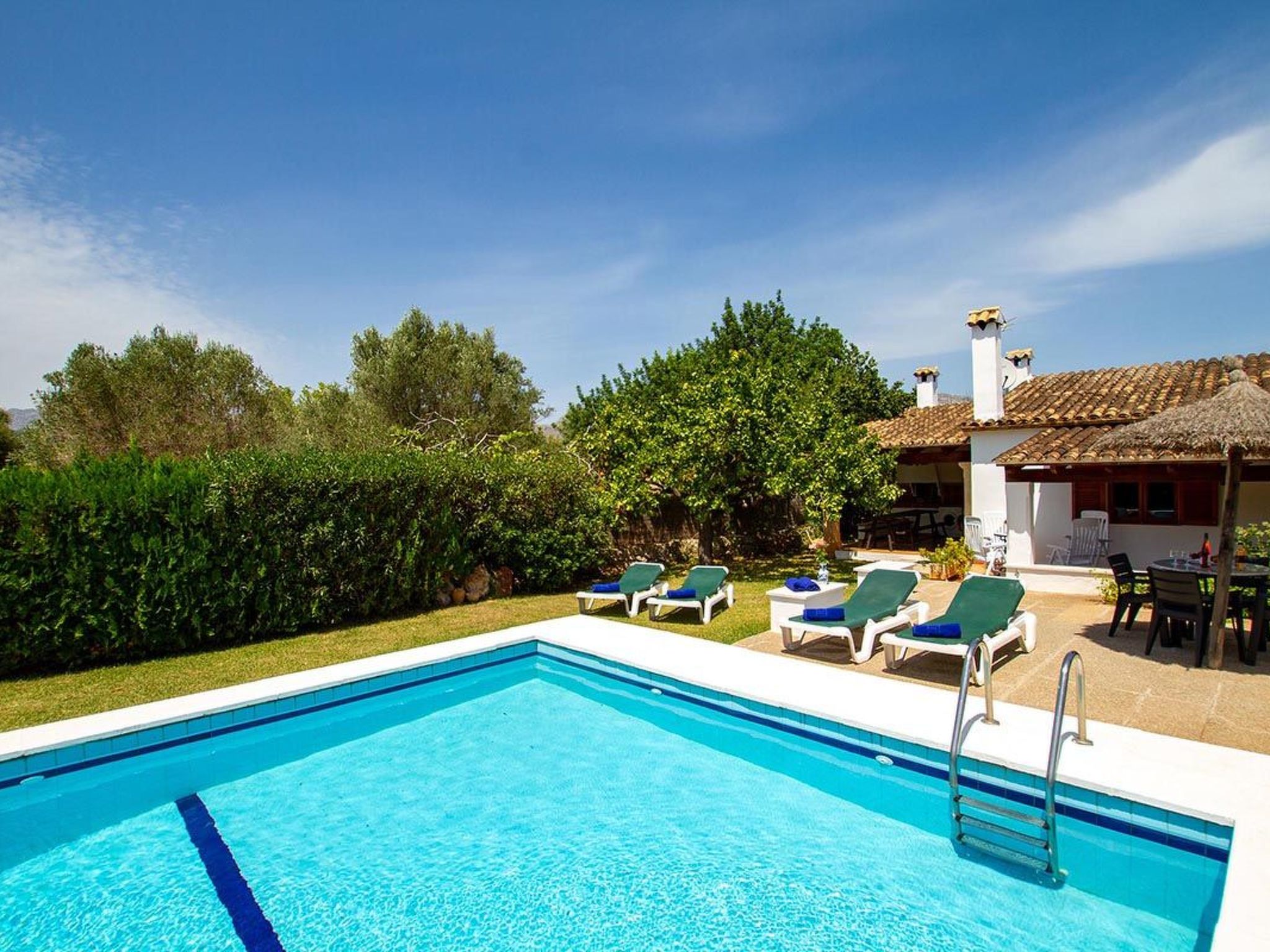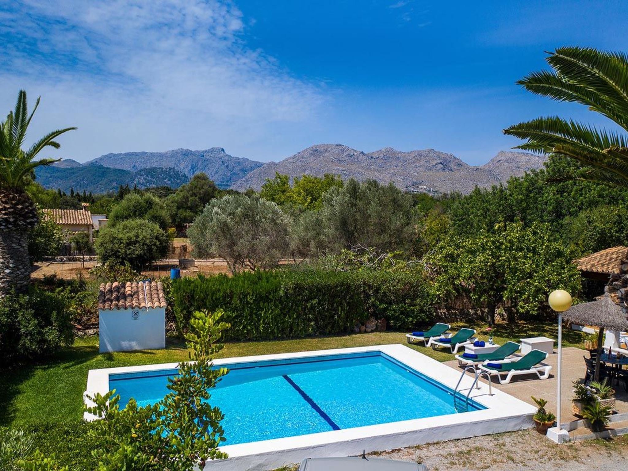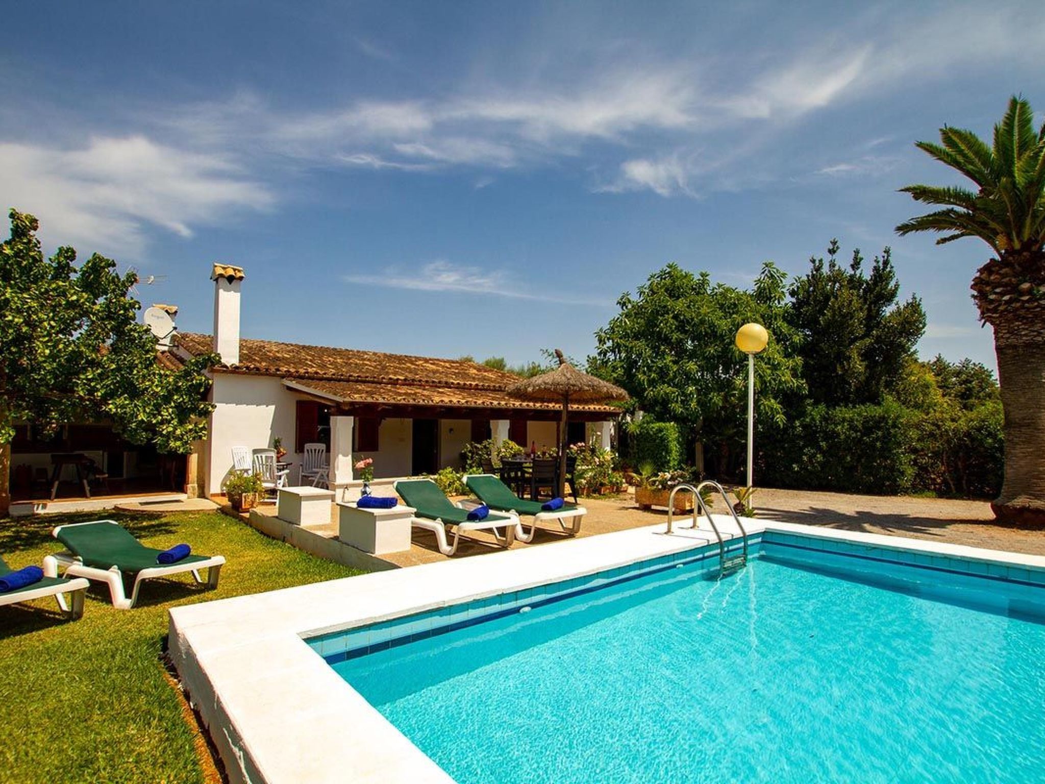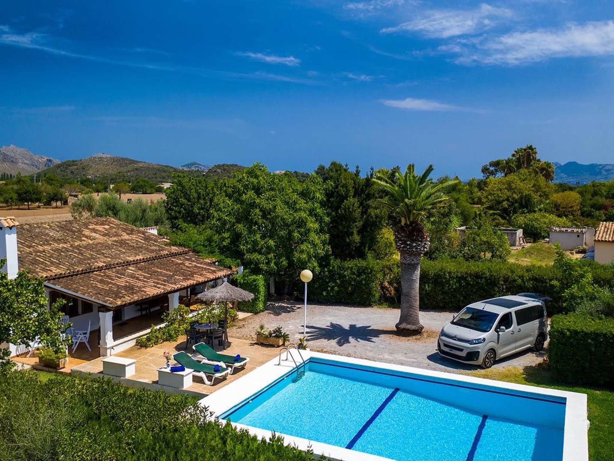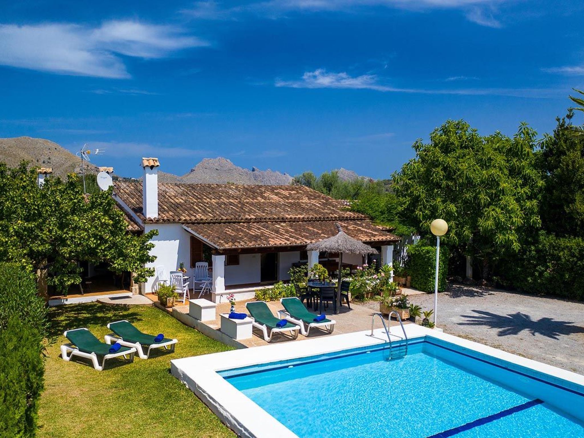Charmante Villa ideal für Paare oder kleine Familien, die einen erholsamen Urlaub wollen. Die Villa hat viele authentische, traditionelle Merkmale und bietet einen Blick auf den Hügel Puig de Maria. Im Außenbereich ist der private Swimmingpool von einem Garten mit Rasen umgeben, der viel Platz zum Sonnenbaden bietet. Mediterrane Sträucher und Palmen verschönern diesen Teil der Villa.