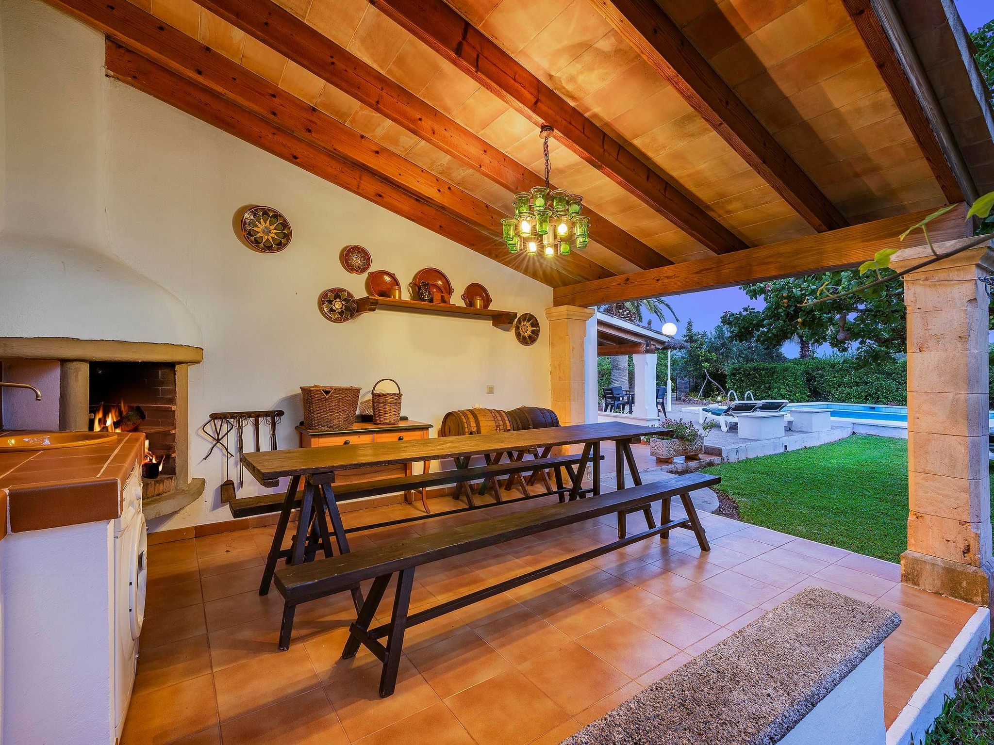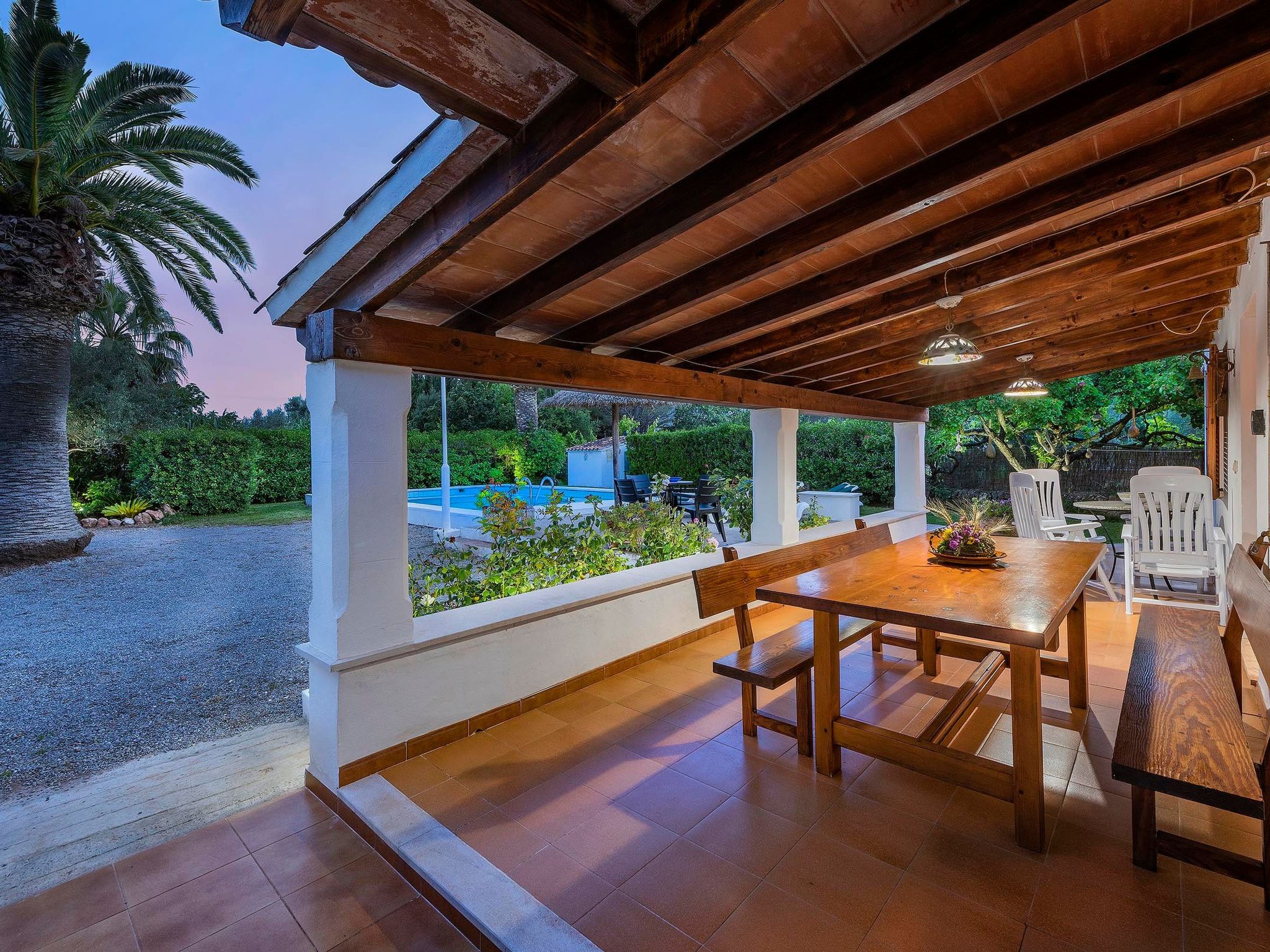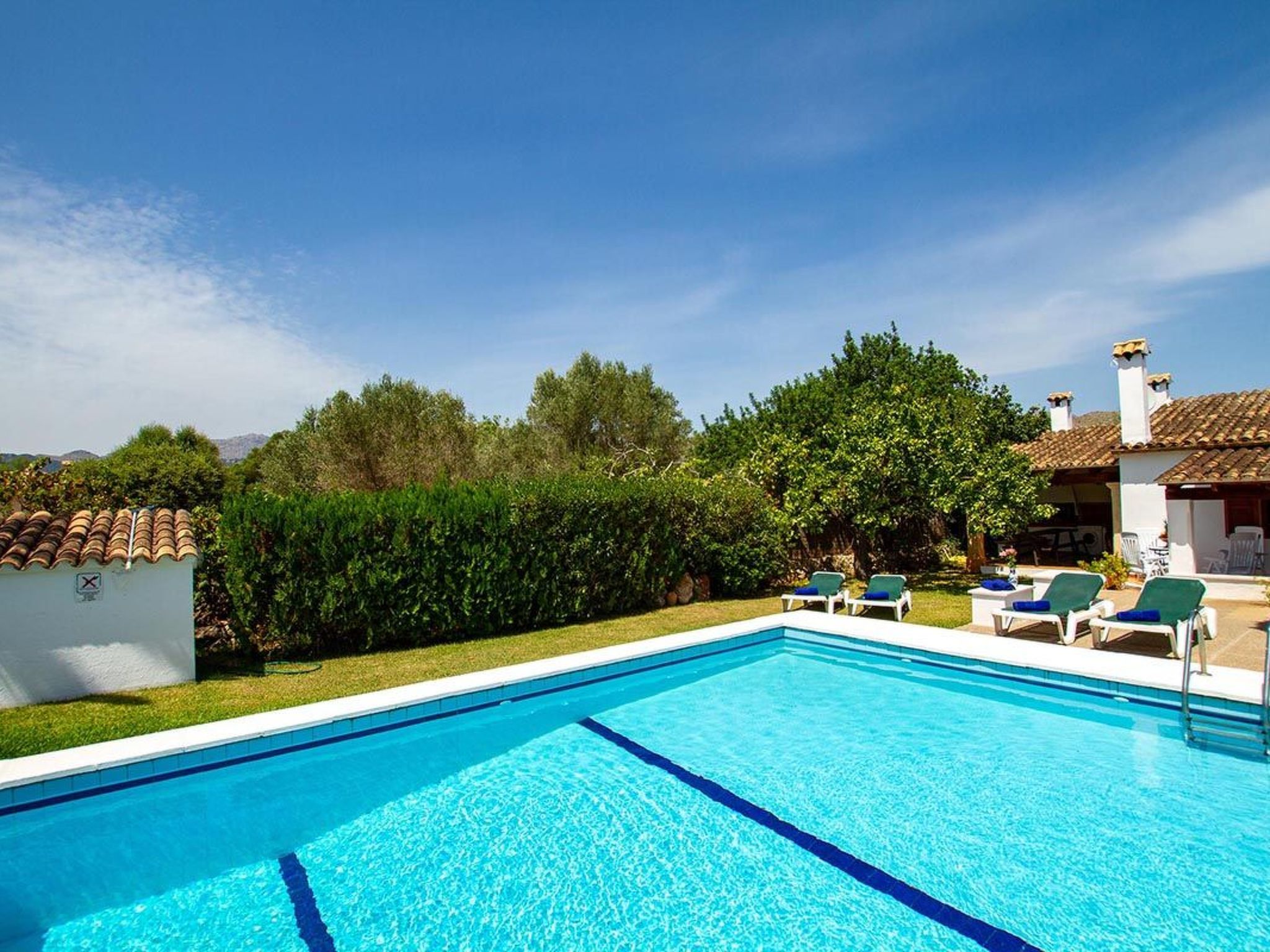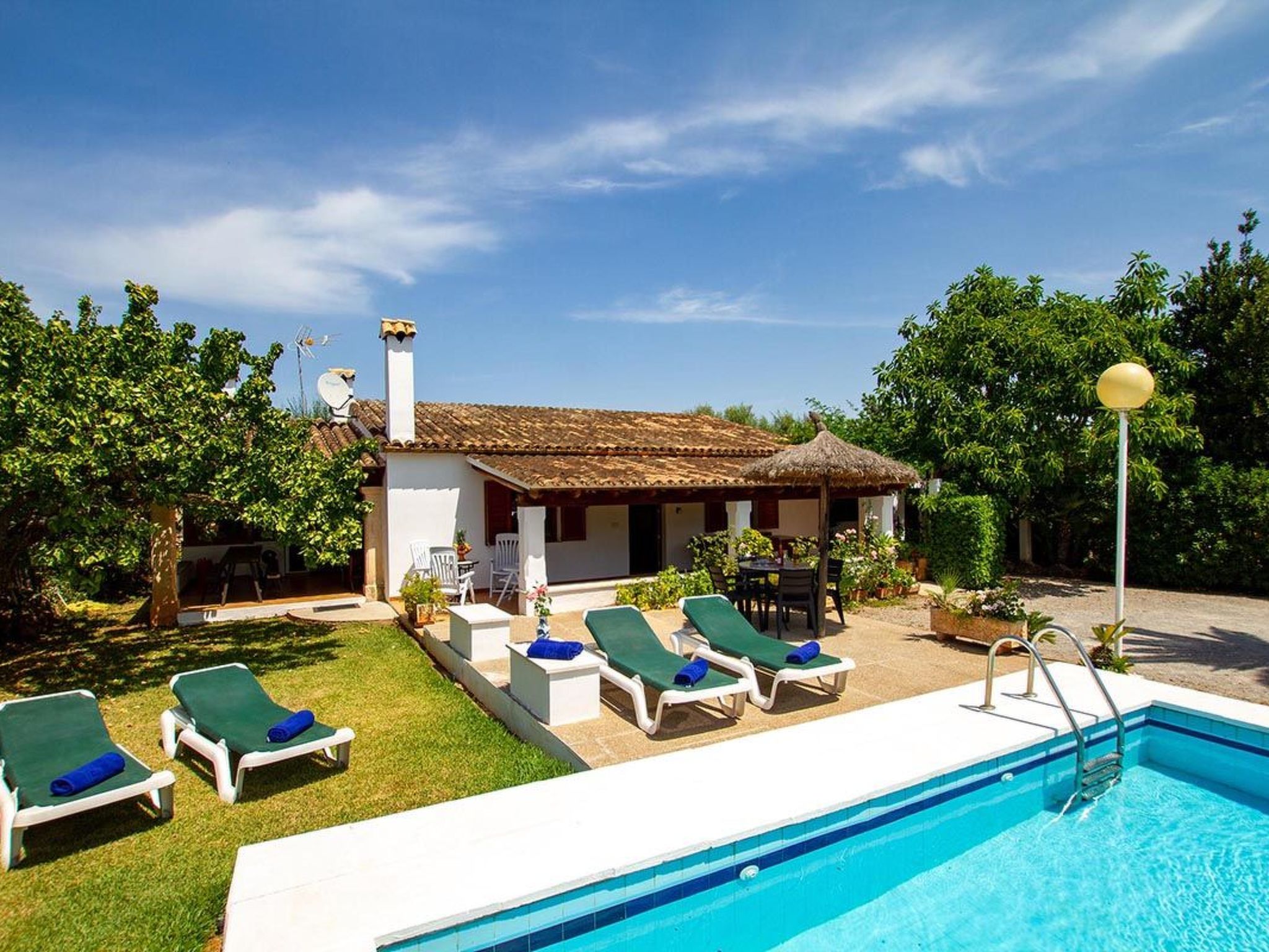 Charmante Villa ideal für Paare oder kleine Familien, die einen erholsamen Urlaub wollen. Die Villa hat viele authentische, traditionelle Merkmale und bietet einen Blick auf den Hügel Puig de Maria. Im Außenbereich ist der private Swimmingpool von einem Garten mit Rasen umgeben, der viel Platz zum Sonnenbaden bietet. Mediterrane Sträucher und Palmen verschönern diesen Teil der Villa.