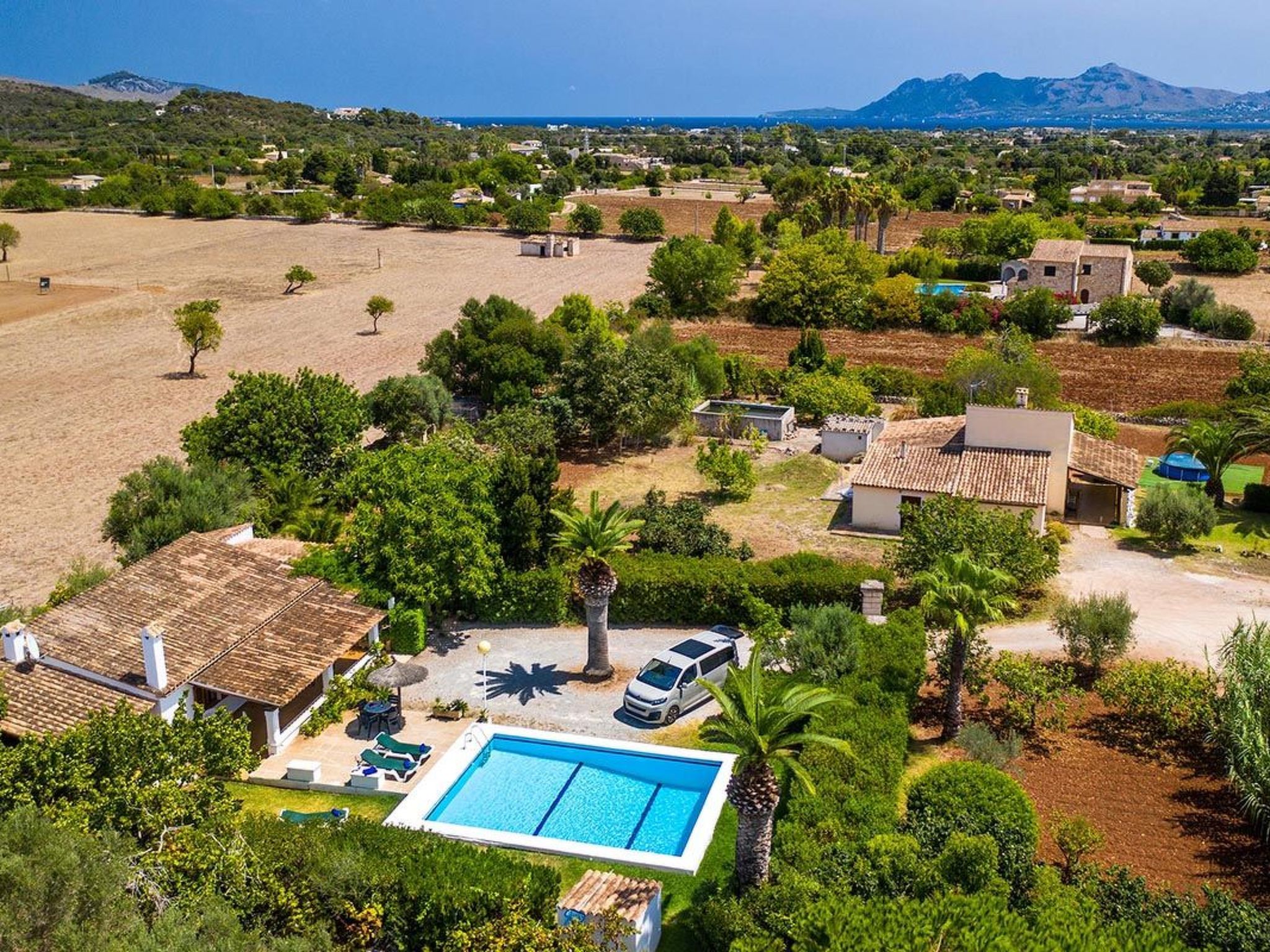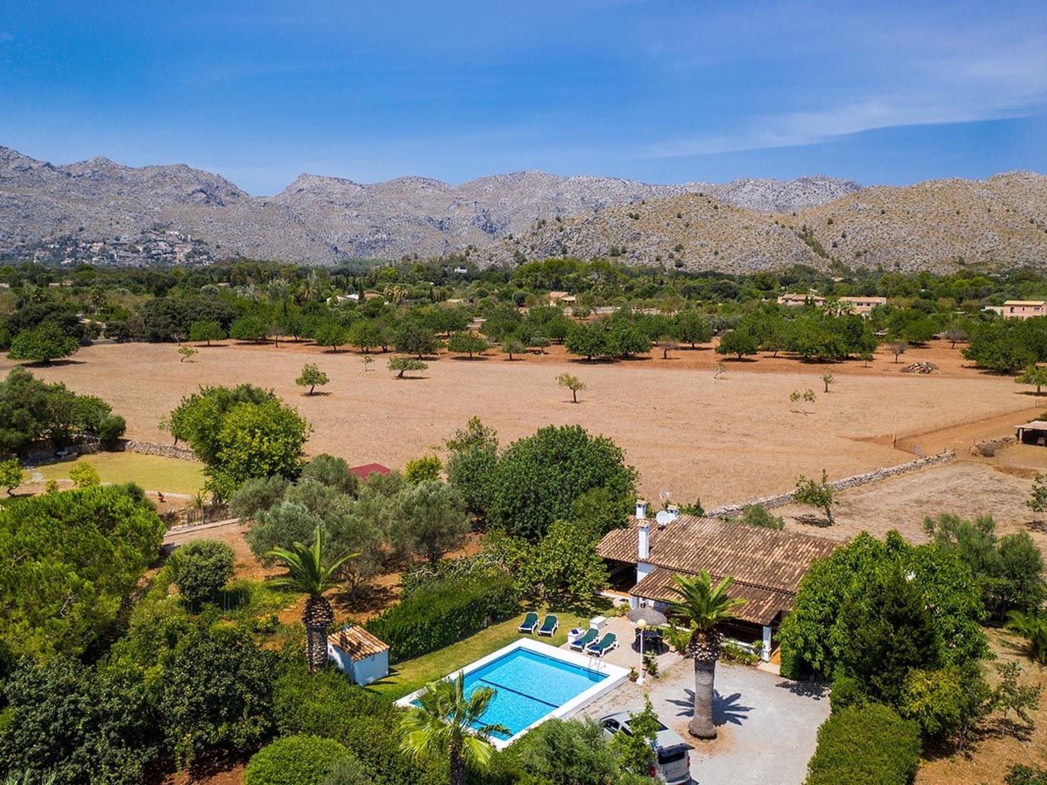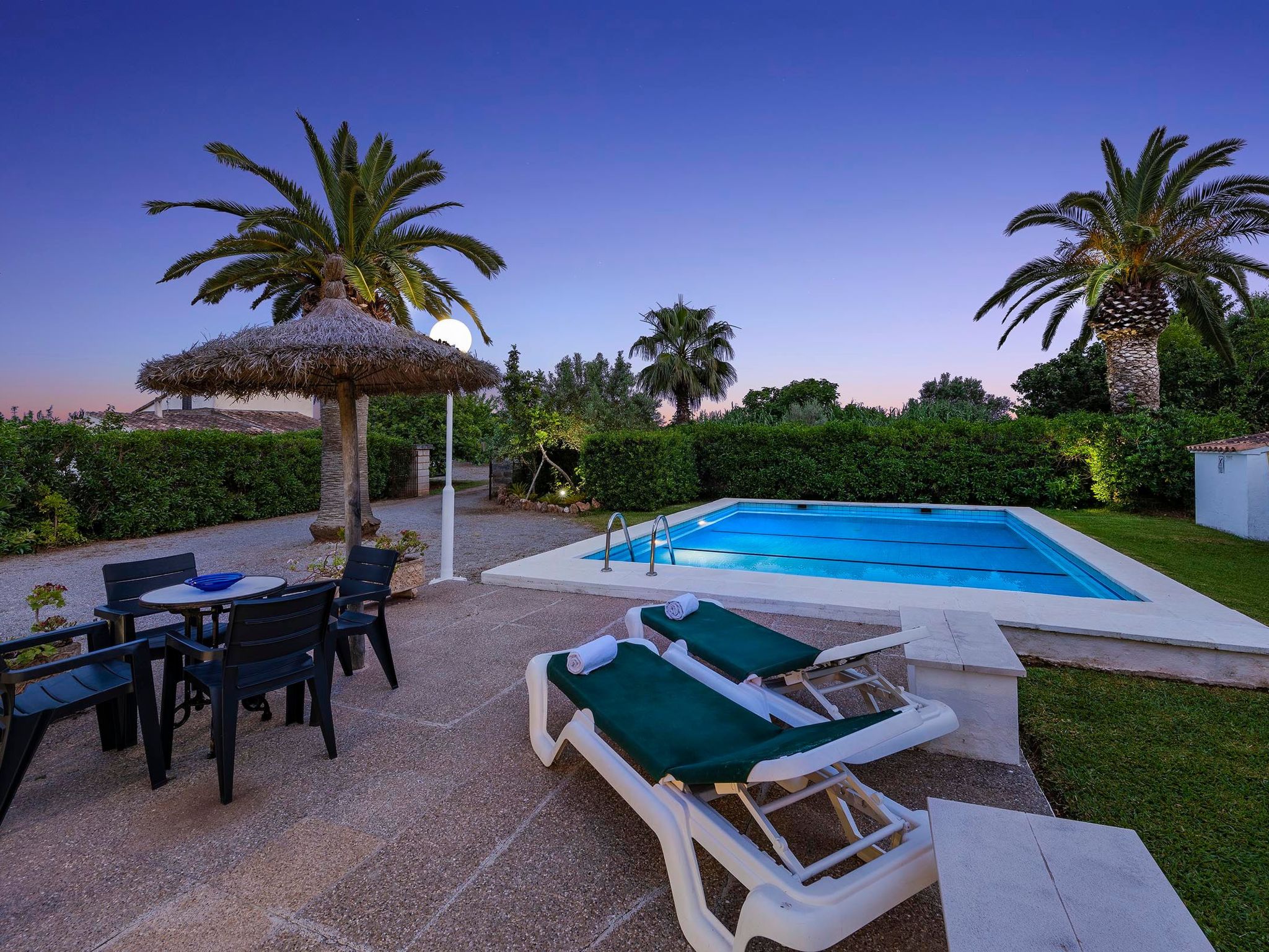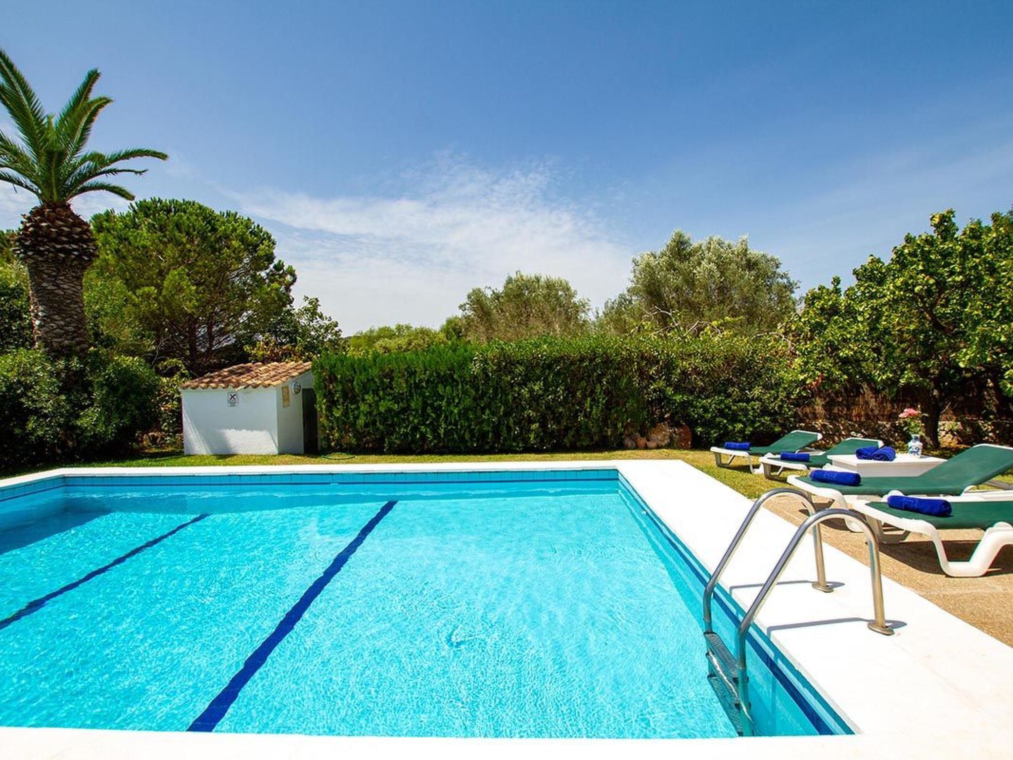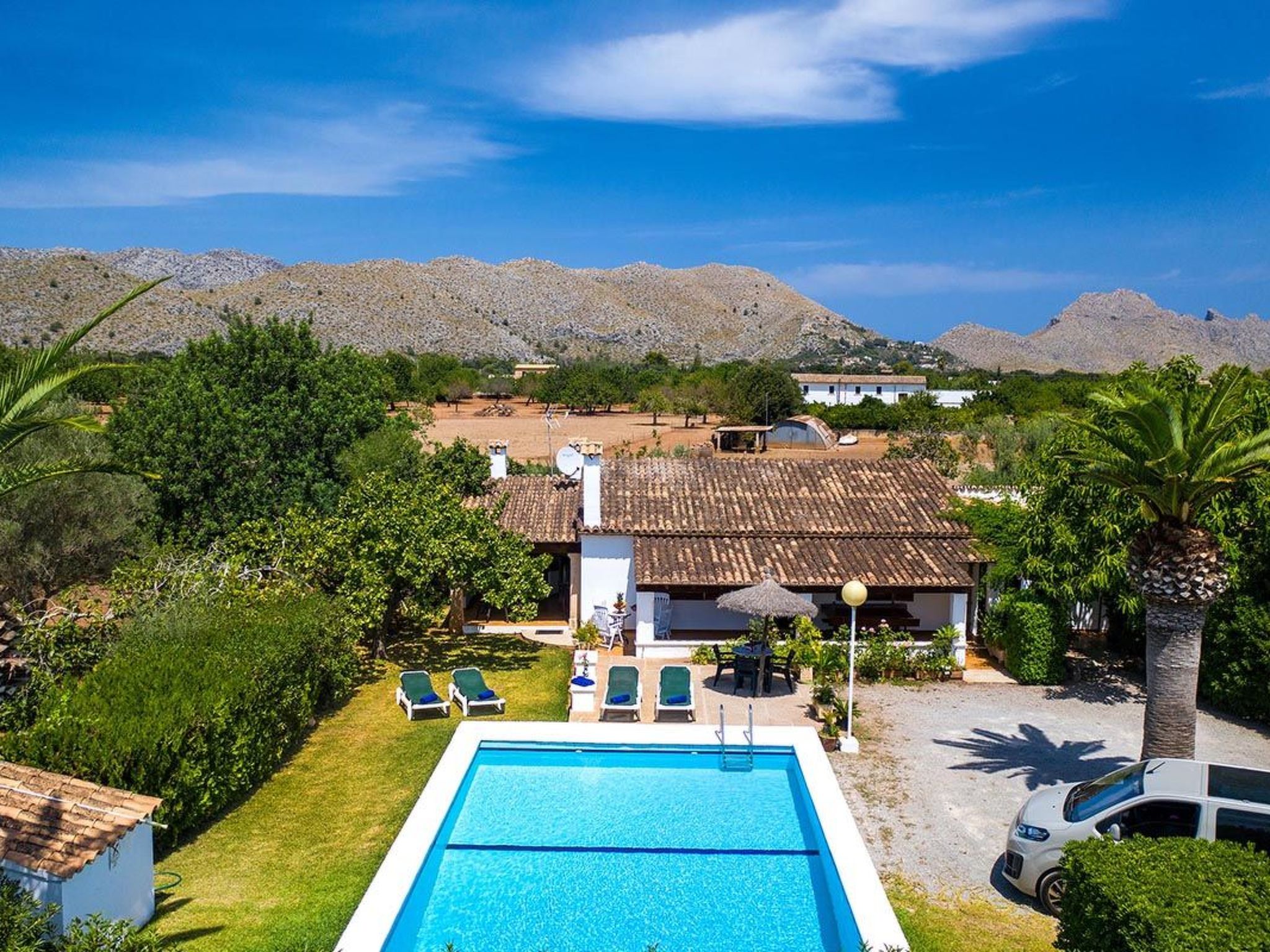 Charmante Villa ideal für Paare oder kleine Familien, die einen erholsamen Urlaub wollen. Die Villa hat viele authentische, traditionelle Merkmale und bietet einen Blick auf den Hügel Puig de Maria. Im Außenbereich ist der private Swimmingpool von einem Garten mit Rasen umgeben, der viel Platz zum Sonnenbaden bietet. Mediterrane Sträucher und Palmen verschönern diesen Teil der Villa.