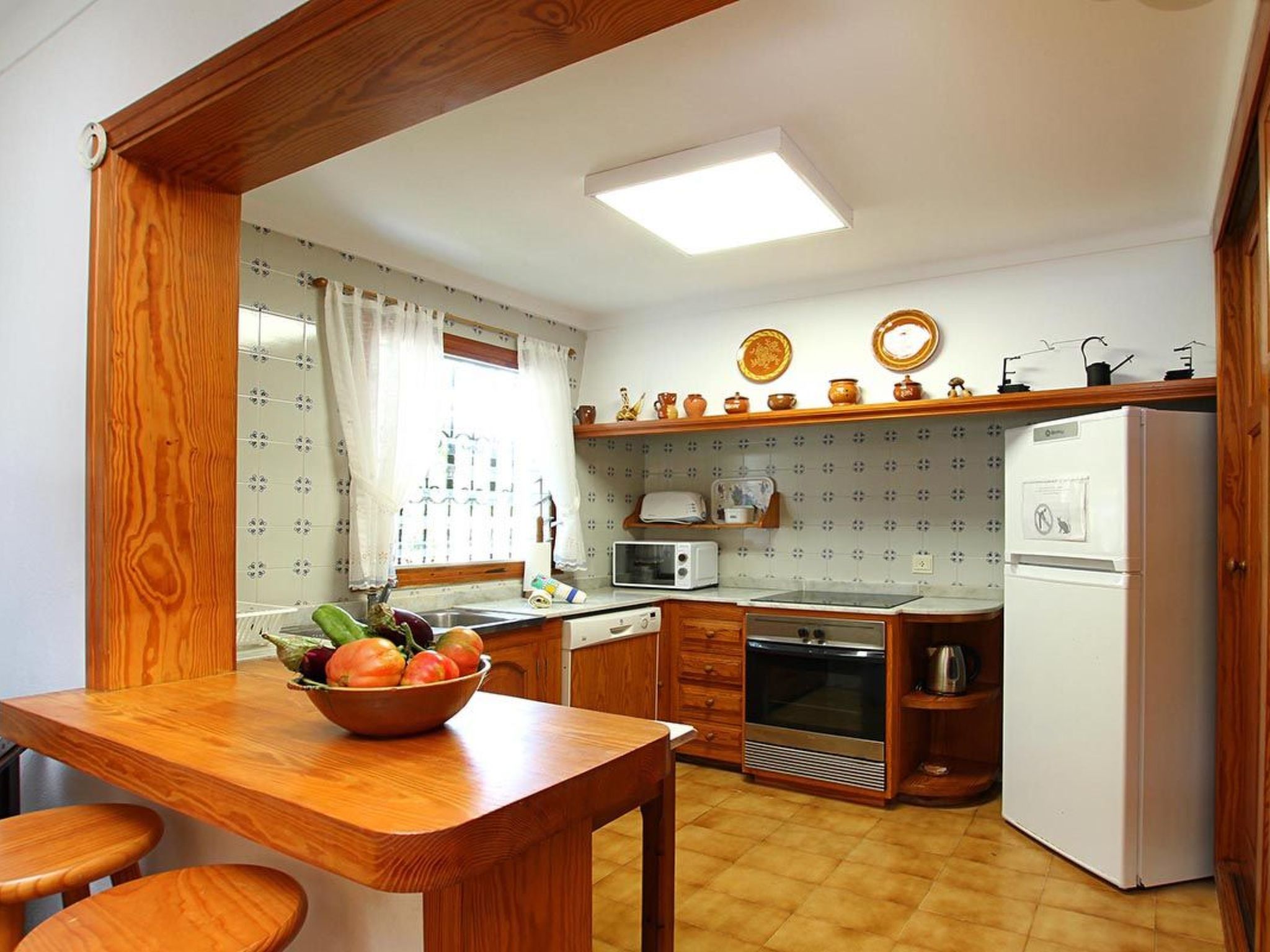 Das Wohnzimmer ist gemütlich und traditionell eingerichtet und verfügt über einen Holzkamin (nur zu Zierzwecken). Die Küche ist offen gestaltet und komplett ausgestattet. Vom Wohnzimmer aus führt ein Flur zu den Schlafzimmern, einem Doppel- und zwei Einzelzimmern, die sich zwei Bäder teilen. Die große Terrasse an der Vorderseite der Villa ist ein großartiger Ort, um sich zu entspannen und der Mittagshitze zu entkommen, mit Blick auf den fabelhaften Poolbereich mit dem großen Materialgrill auf der einen Seite. Das Anwesen verfügt über 3 Schlafzimmer (alle mit A/C) und 2 Badezimmer.