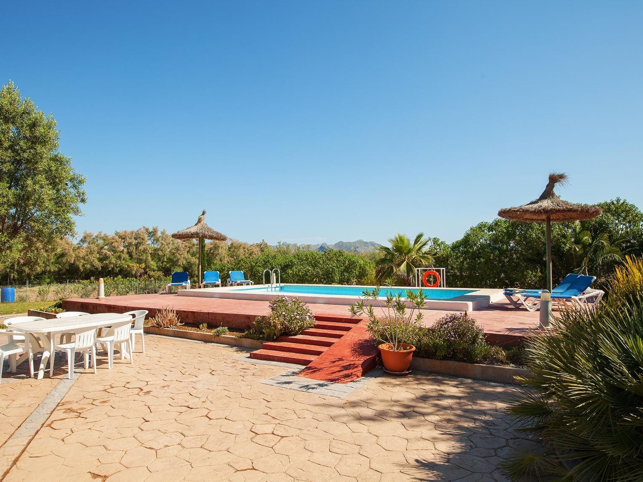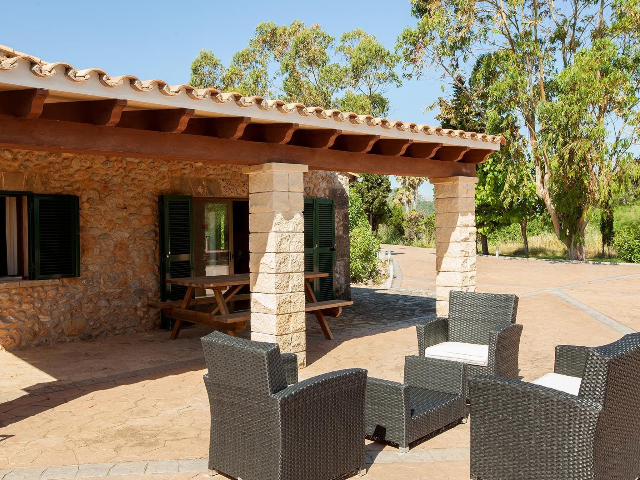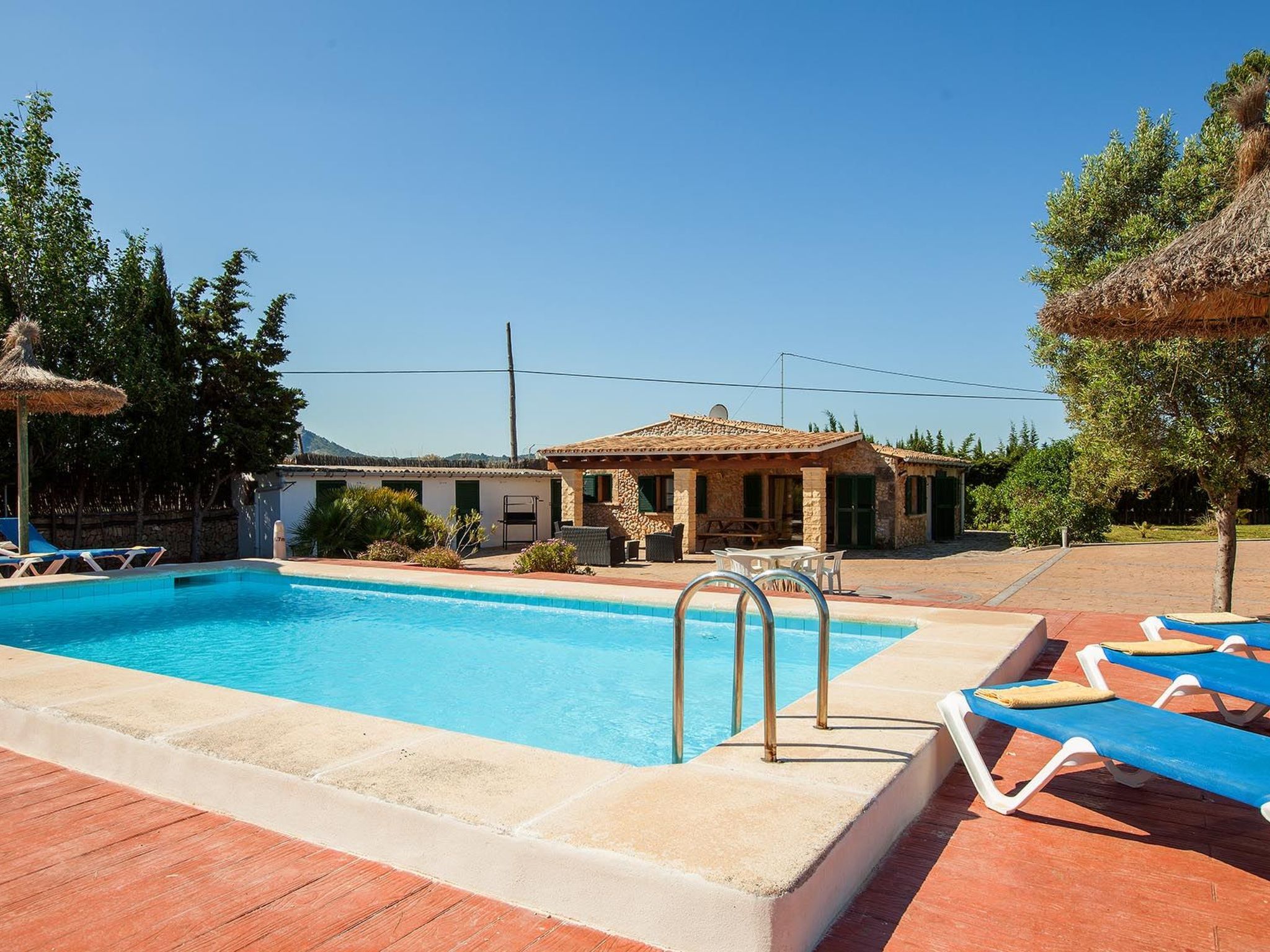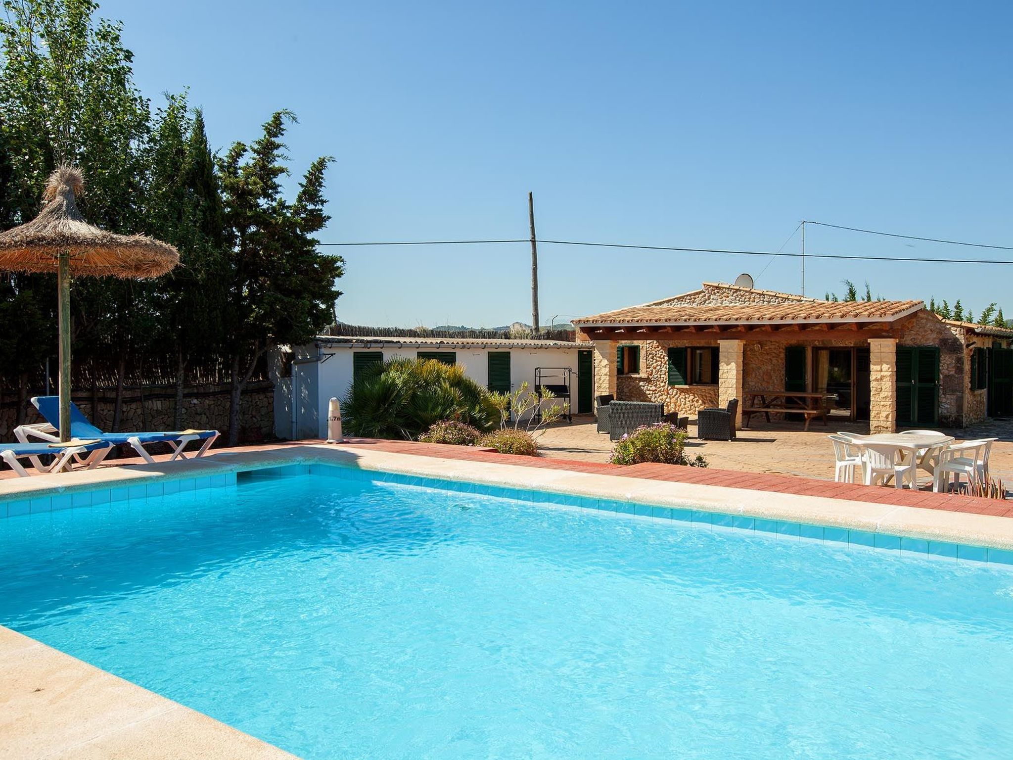 Im Außenbereich zeigt sich das Anwesen in seiner ganzen Pracht mit einem weitläufigen Garten zur alleinigen Nutzung, in dem Ruhe und natürliche Schönheit aufeinander treffen. Der private Swimmingpool ist der perfekte Ort, um sich abzukühlen und die mallorquinische Sonne zu genießen, während die Terrasse den idealen Rahmen für Mahlzeiten im Freien oder einfach zum Entspannen bietet. Für Grillfans steht ein mobiler Grill bereit, um köstliche Mahlzeiten in der Privatsphäre dieser schönen Umgebung zuzubereiten.