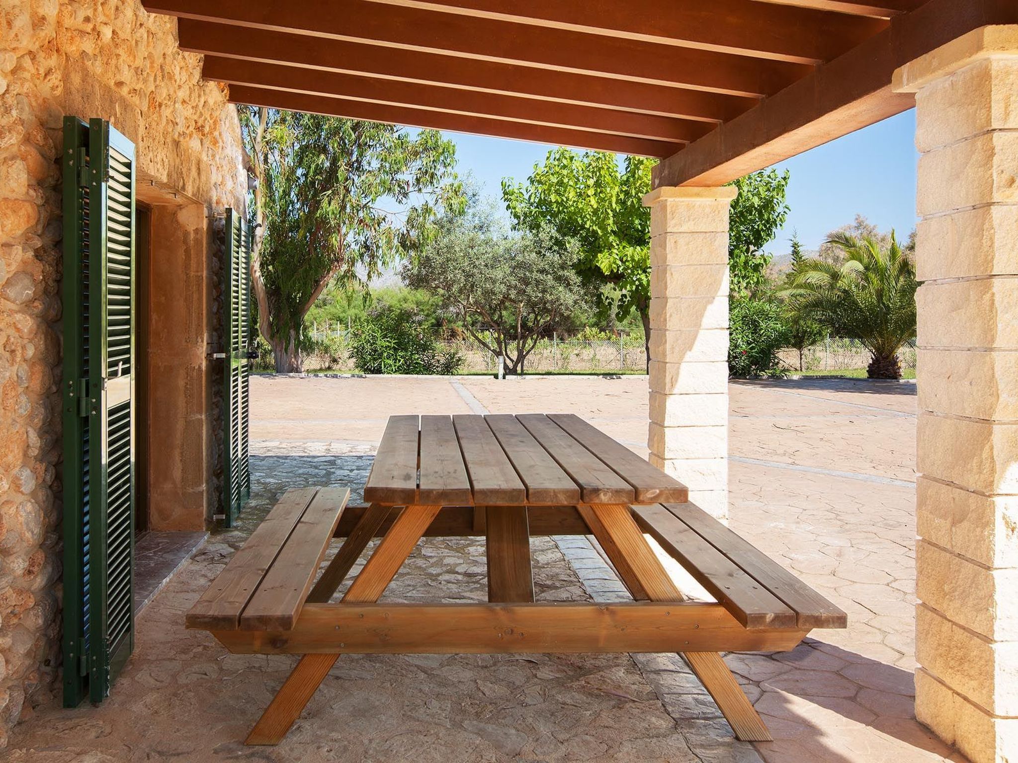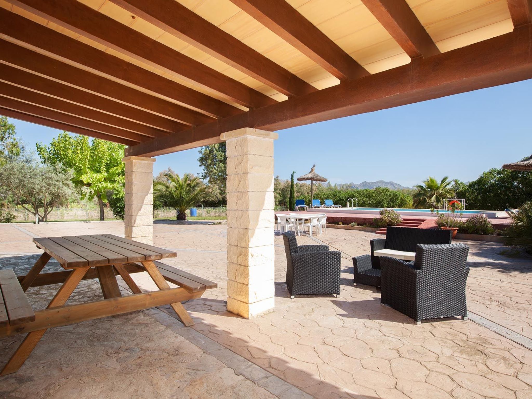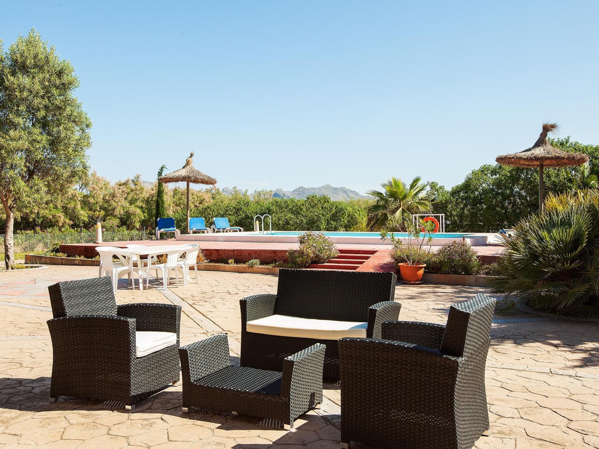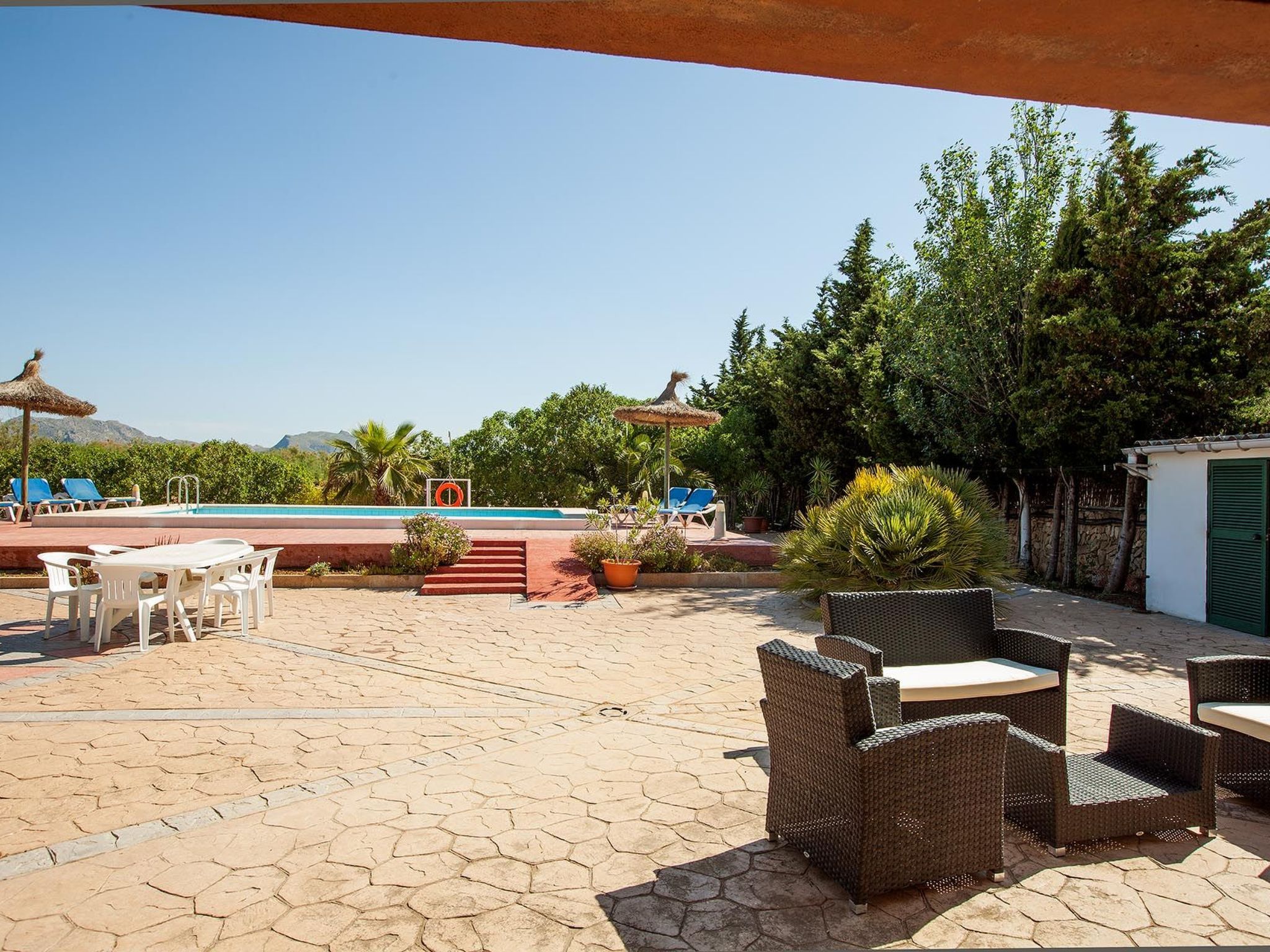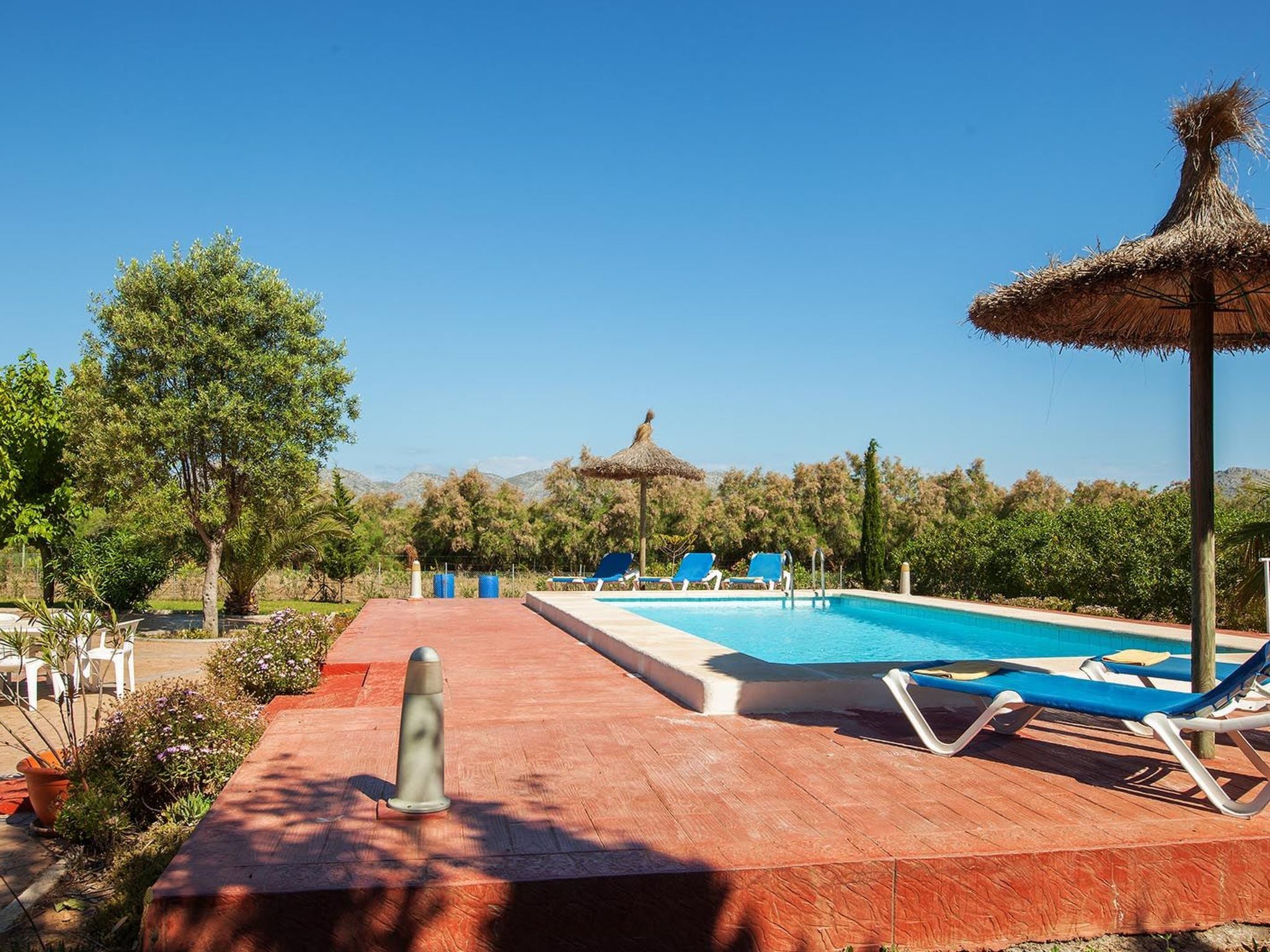 Im Außenbereich zeigt sich das Anwesen in seiner ganzen Pracht mit einem weitläufigen Garten zur alleinigen Nutzung, in dem Ruhe und natürliche Schönheit aufeinander treffen. Der private Swimmingpool ist der perfekte Ort, um sich abzukühlen und die mallorquinische Sonne zu genießen, während die Terrasse den idealen Rahmen für Mahlzeiten im Freien oder einfach zum Entspannen bietet. Für Grillfans steht ein mobiler Grill bereit, um köstliche Mahlzeiten in der Privatsphäre dieser schönen Umgebung zuzubereiten.