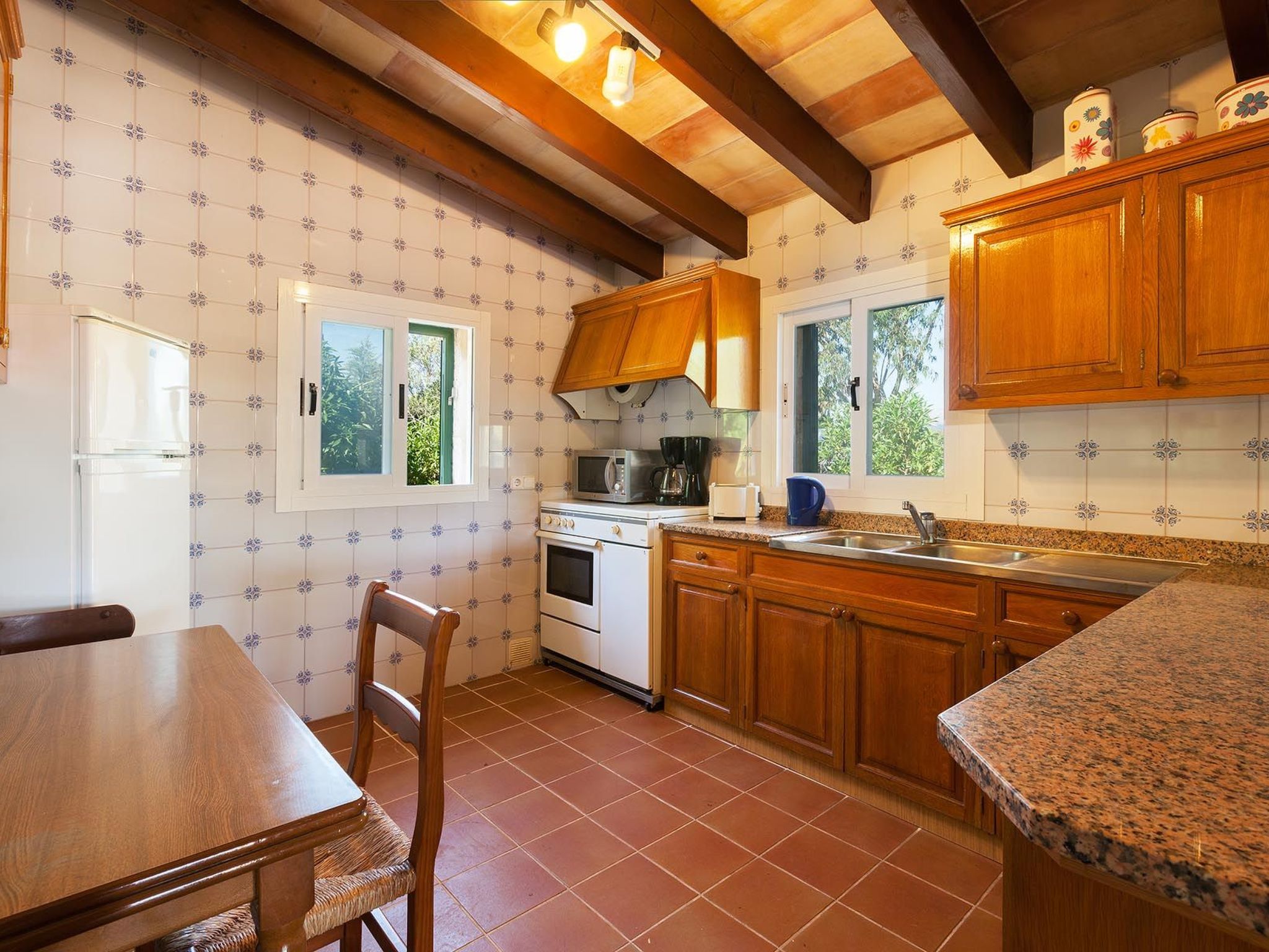 Im Inneren des Hauses befinden sich drei klimatisierte Doppelschlafzimmer, die bis zu sechs Personen einen angenehmen Aufenthalt garantieren. Zwei Bäder, eines mit Badewanne für diejenigen, die ein entspannendes Bad nehmen möchten, und das andere mit Dusche, sorgen für Komfort und Bequemlichkeit für alle Gäste. Eine Waschmaschine zur alleinigen Nutzung und ein voll ausgestatteter Gasherd mit Wasserkocher vervollständigen die Funktionalität dieses Feriendomizils.