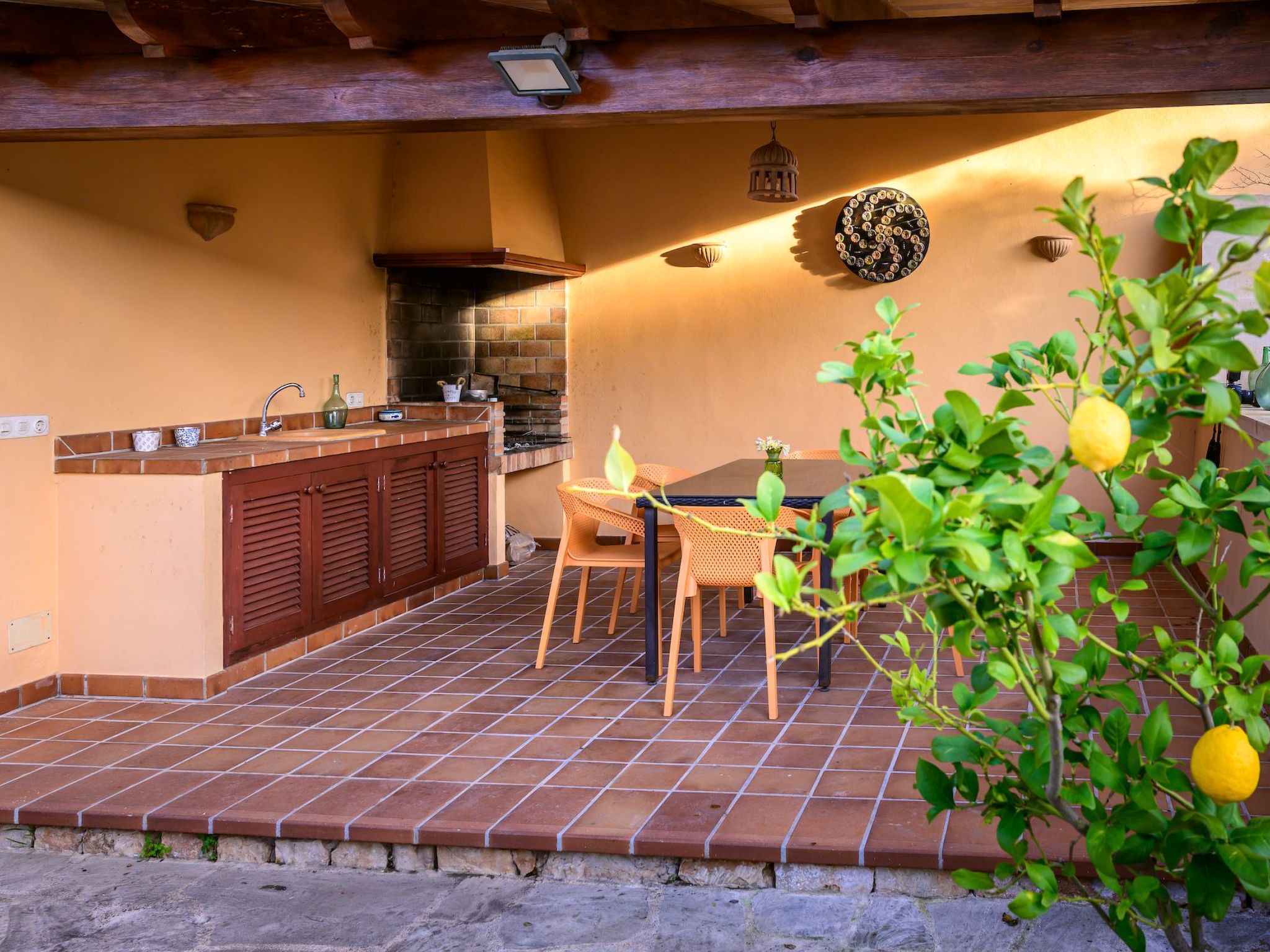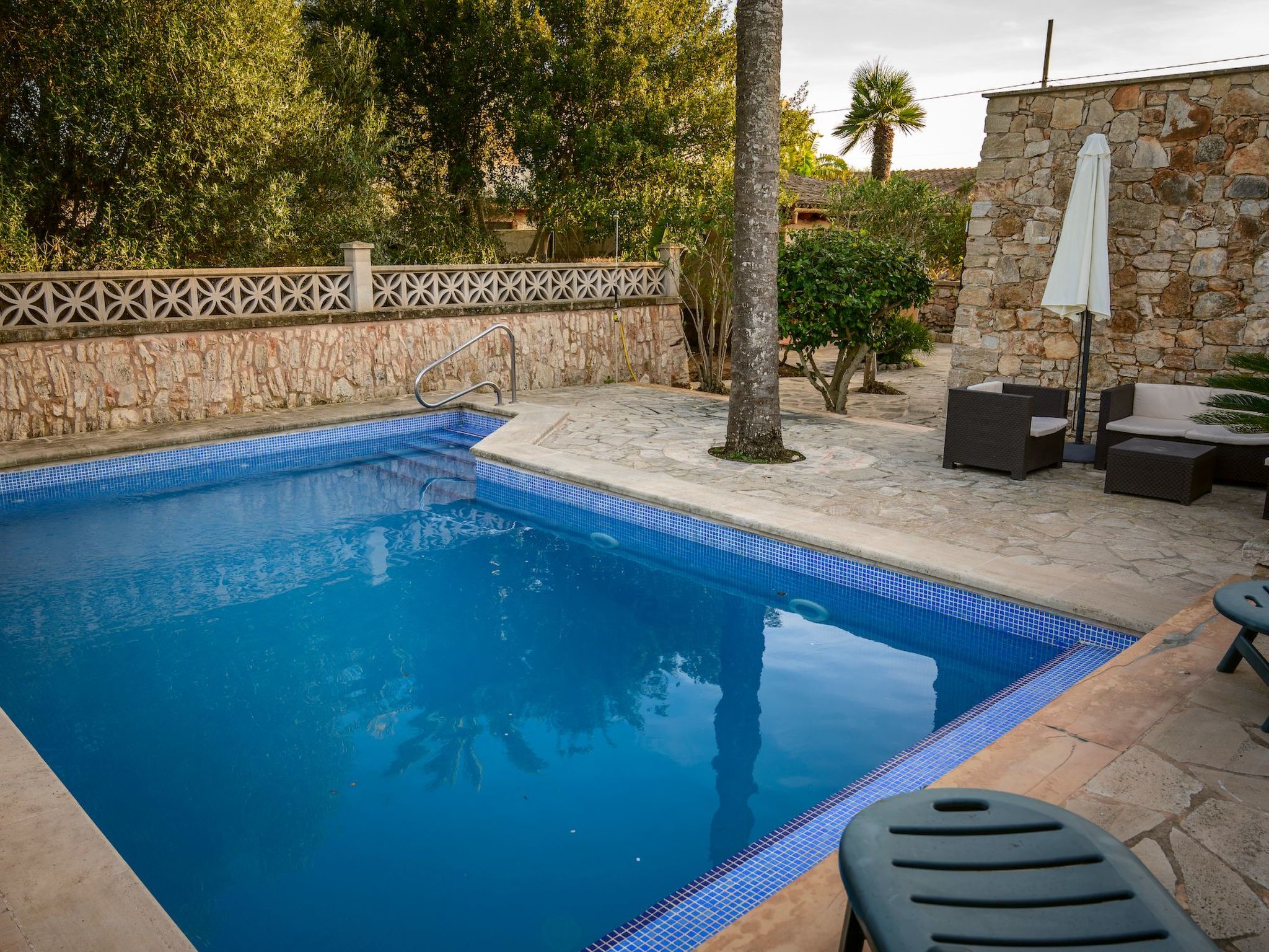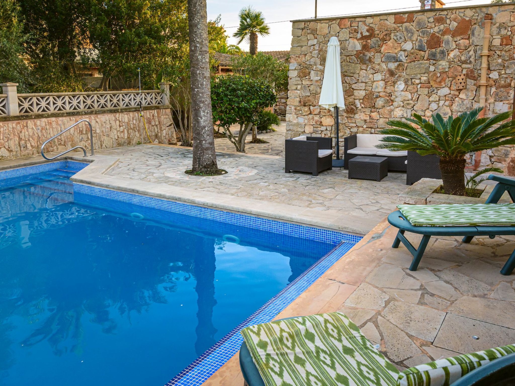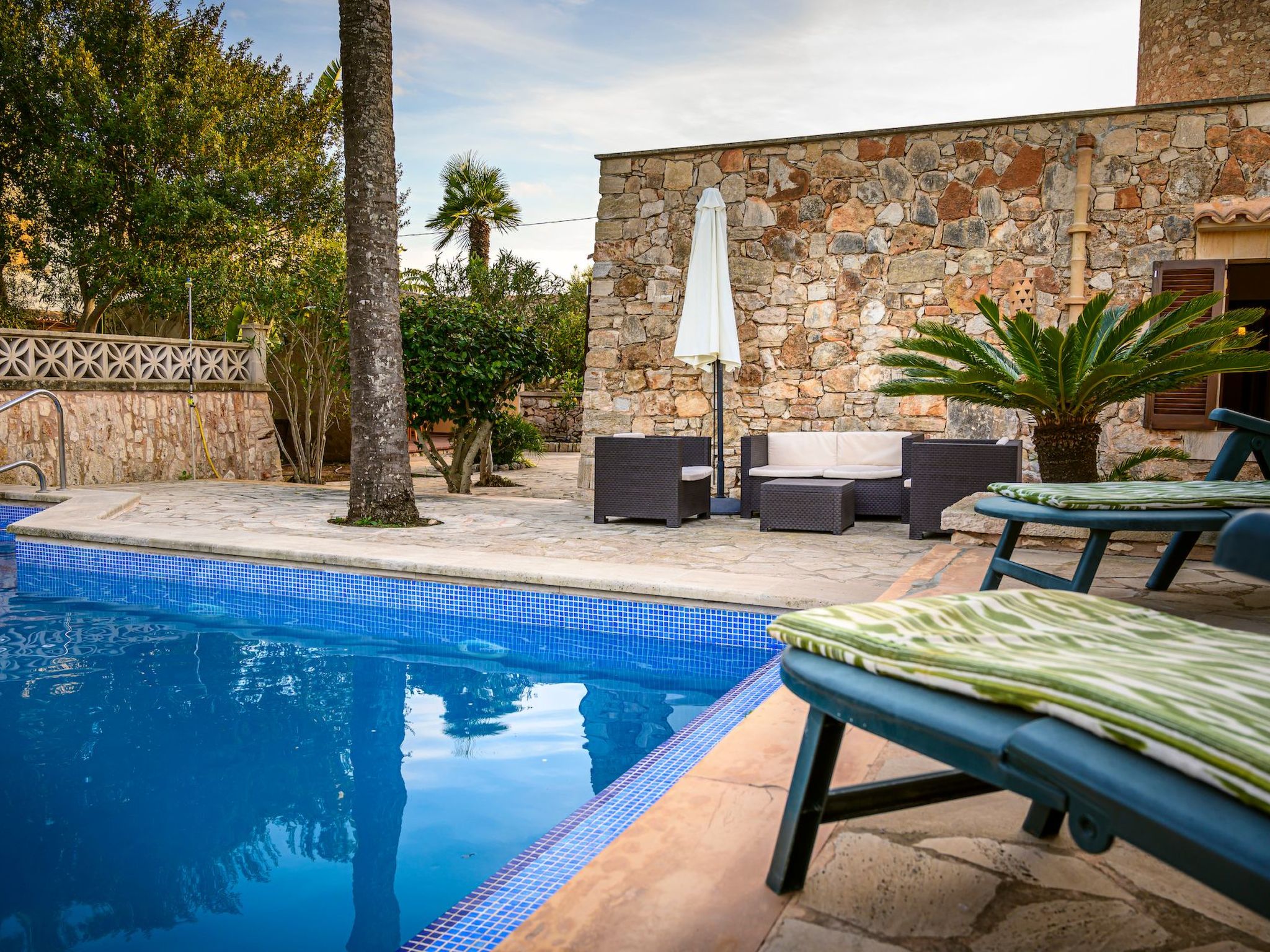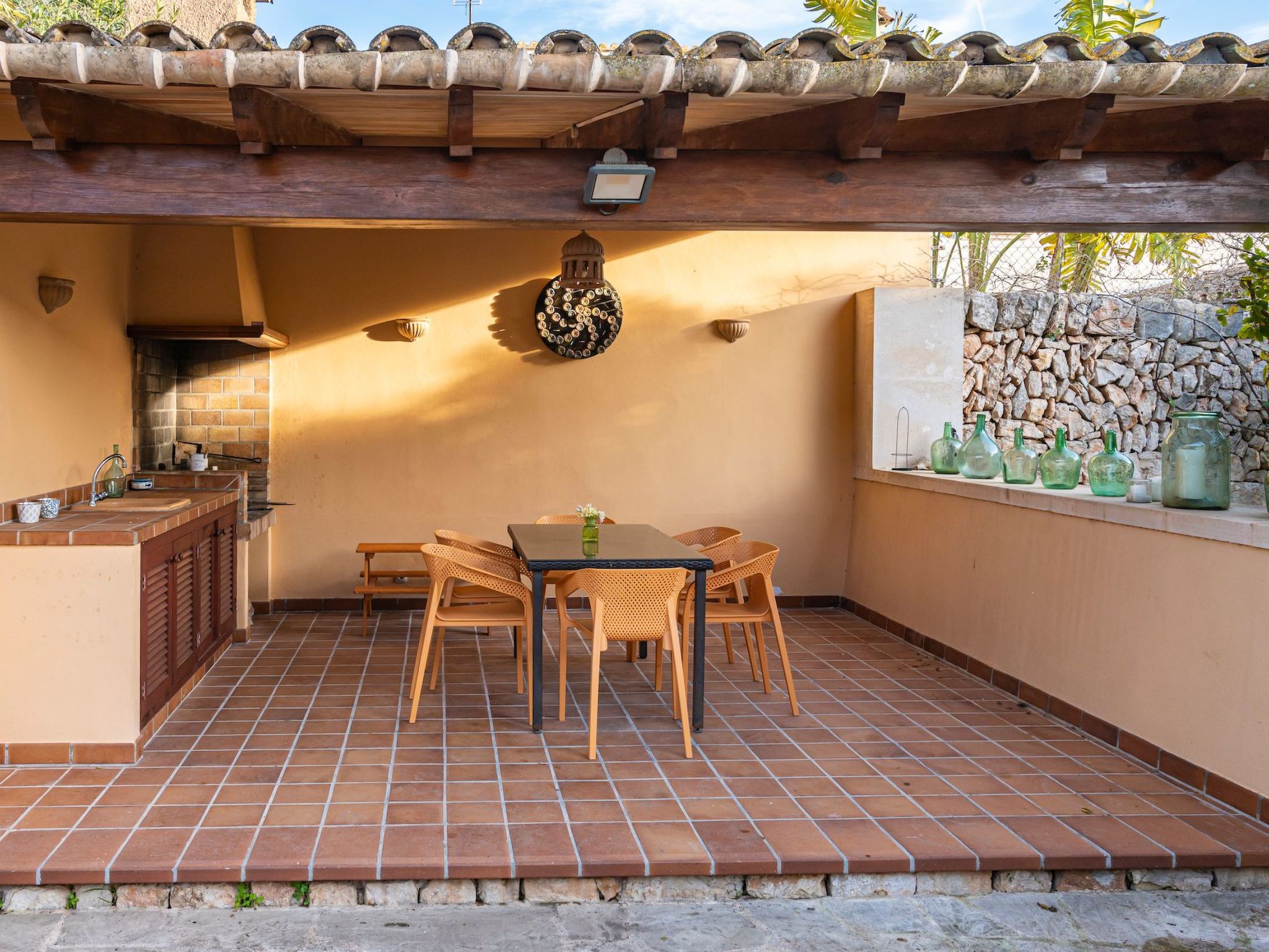 Der Außenbereich des Hauses ist eine wahre Oase der Entspannung. Der private Swimmingpool mit blauen Mosaiken und einem Wasserfall aus Naturstein ist ein Highlight und bietet einen perfekten Rückzugsort für sonnige Tage. Die Außenküche mit Grill und Essbereich im Freien lädt zu unvergesslichen Abenden unter dem mallorquinischen Sternenhimmel ein. Außerdem bietet die Terrasse mit Blick auf den Pool den perfekten Rahmen für ruhige Momente an der frischen Luft.