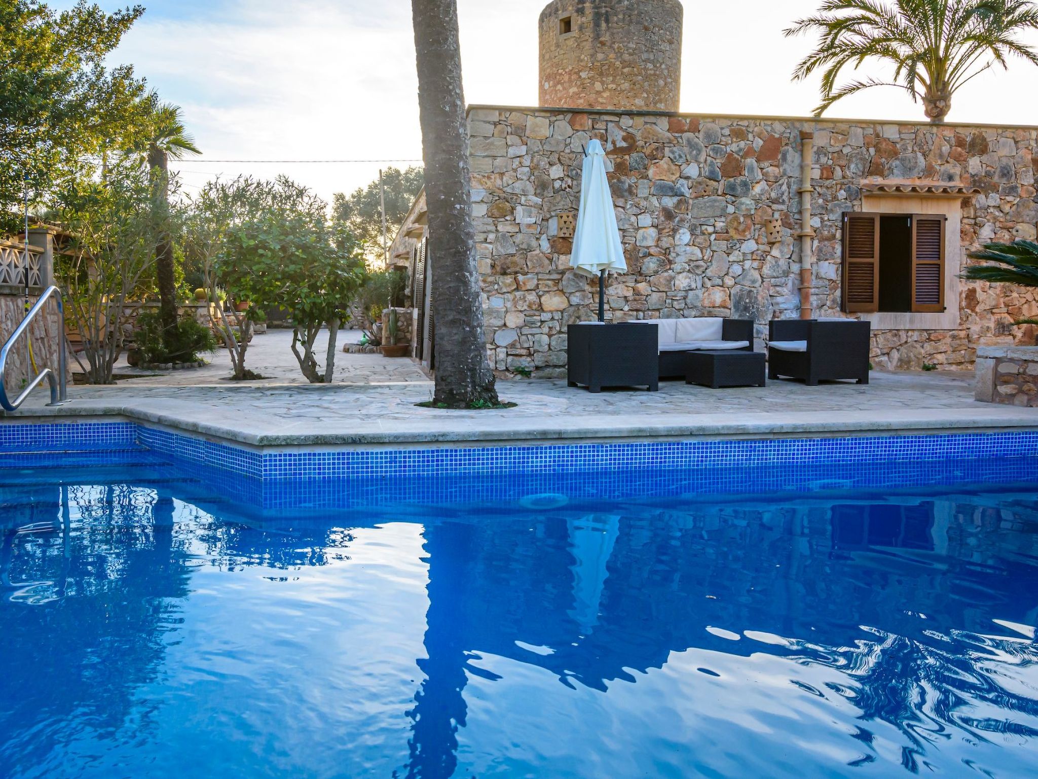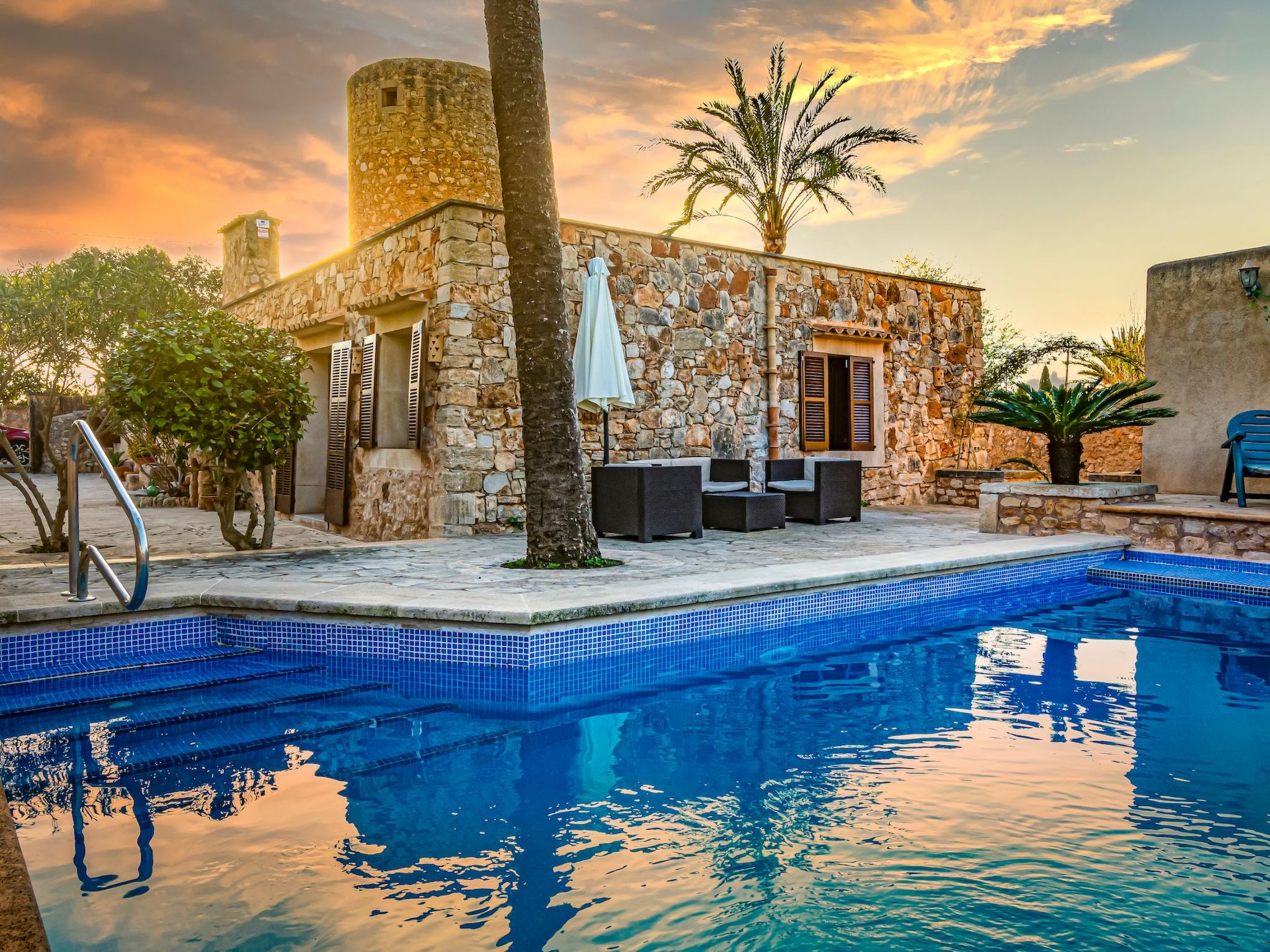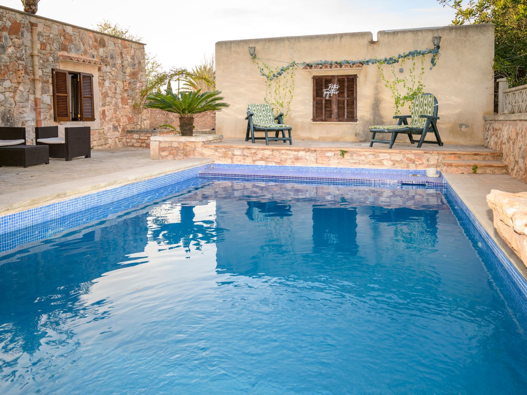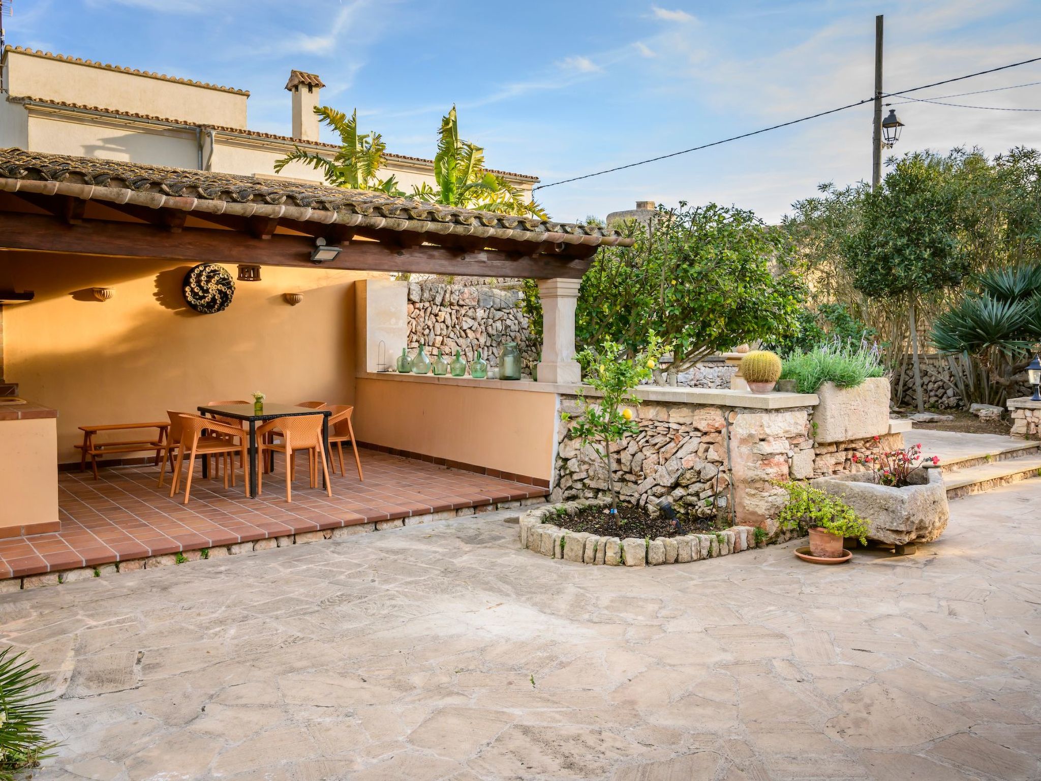 Der Außenbereich des Hauses ist eine wahre Oase der Entspannung. Der private Swimmingpool mit blauen Mosaiken und einem Wasserfall aus Naturstein ist ein Highlight und bietet einen perfekten Rückzugsort für sonnige Tage. Die Außenküche mit Grill und Essbereich im Freien lädt zu unvergesslichen Abenden unter dem mallorquinischen Sternenhimmel ein. Außerdem bietet die Terrasse mit Blick auf den Pool den perfekten Rahmen für ruhige Momente an der frischen Luft.