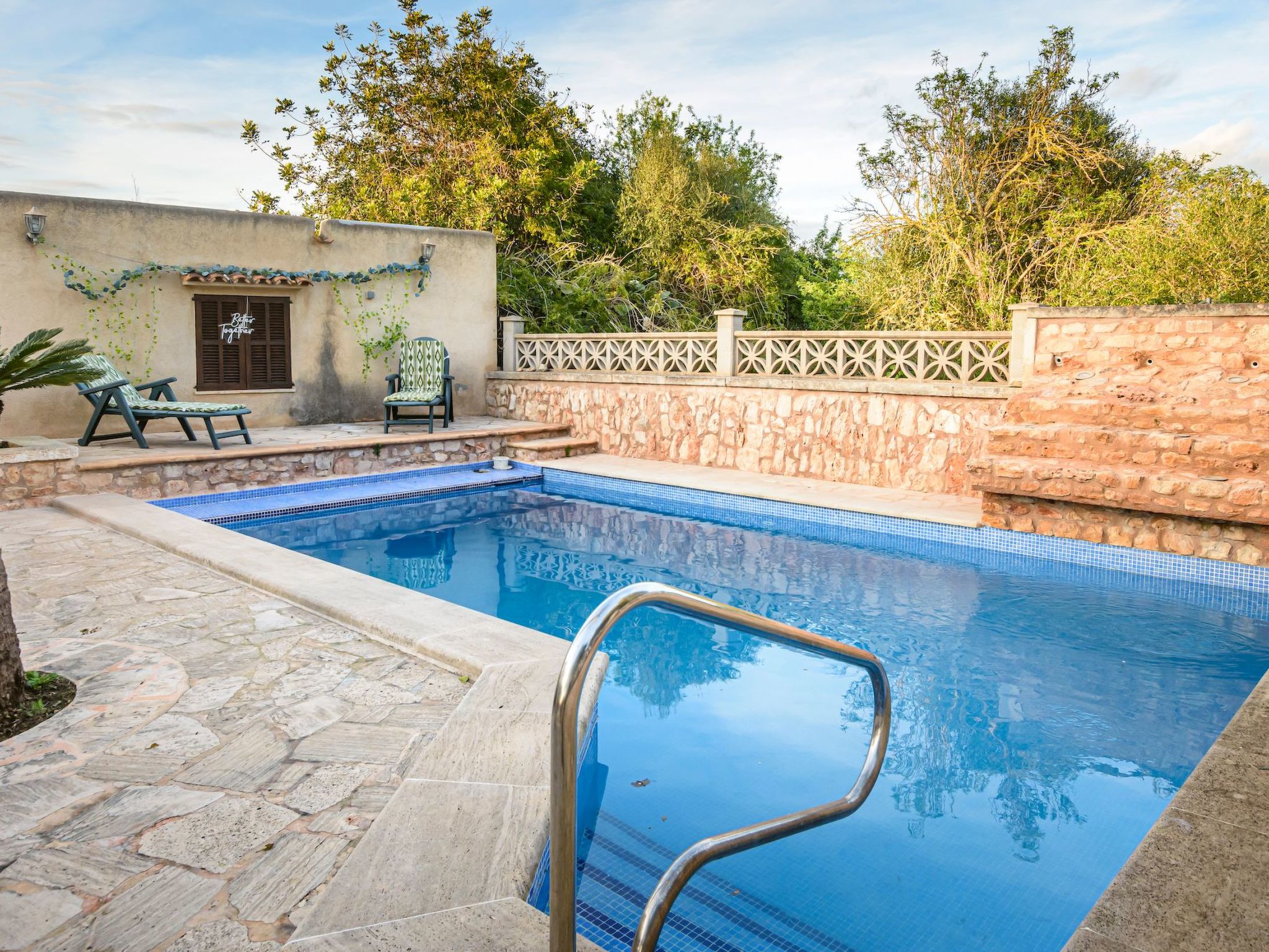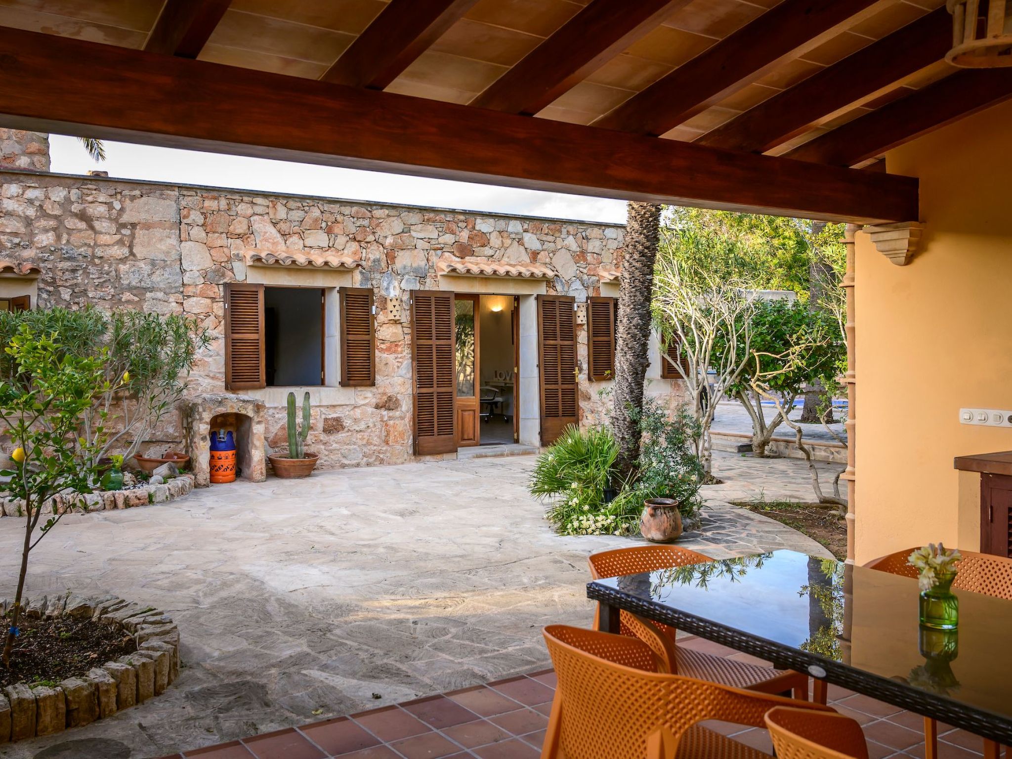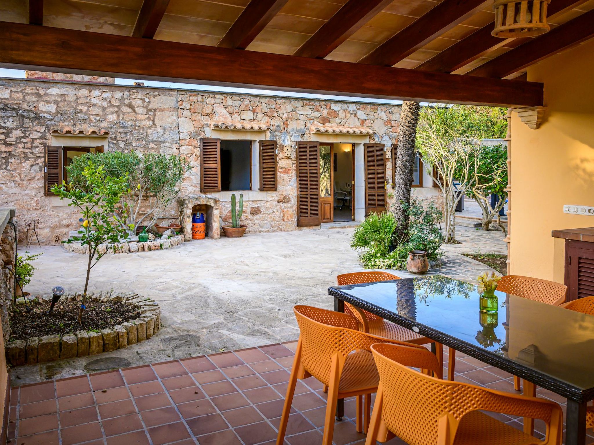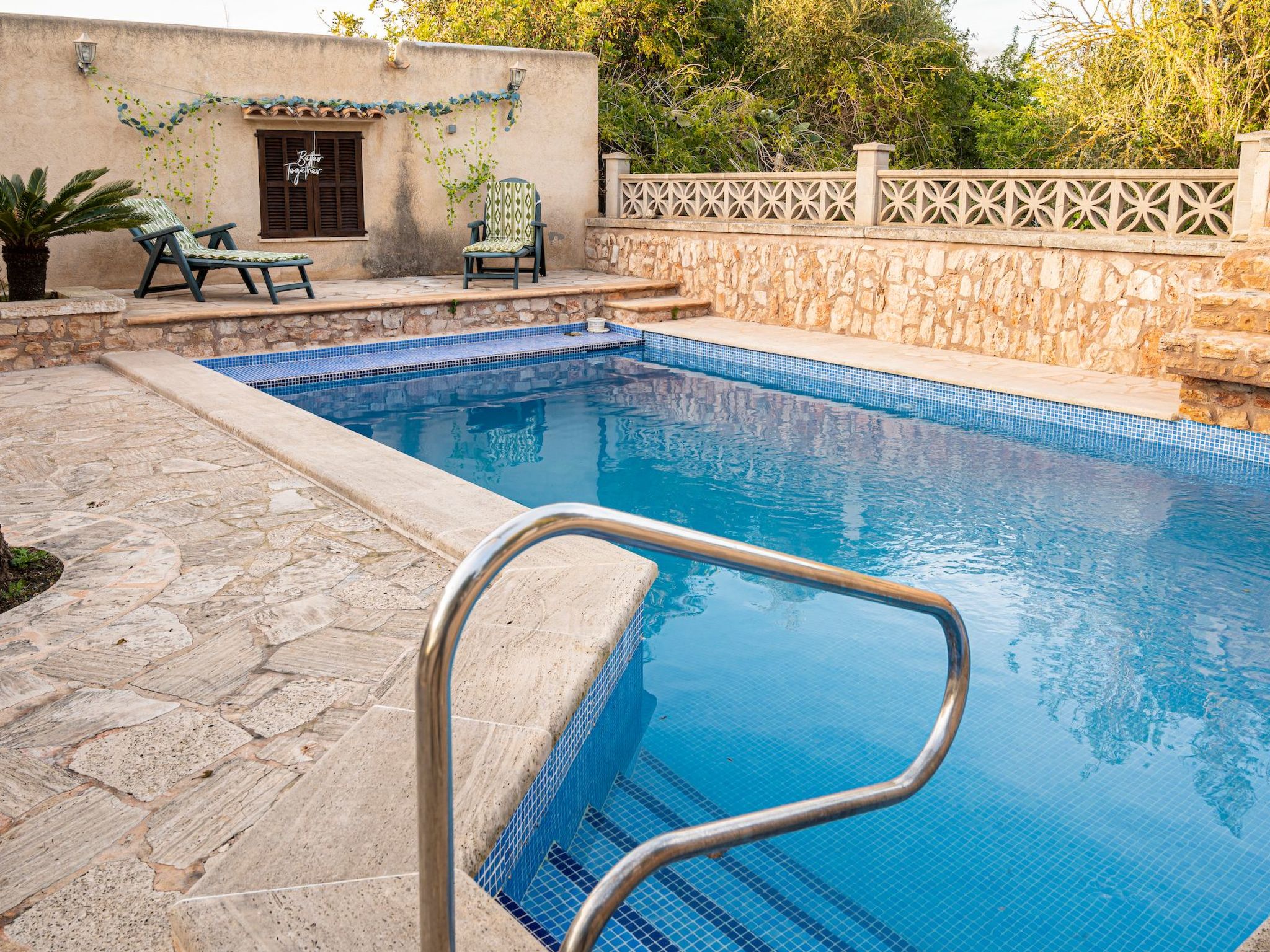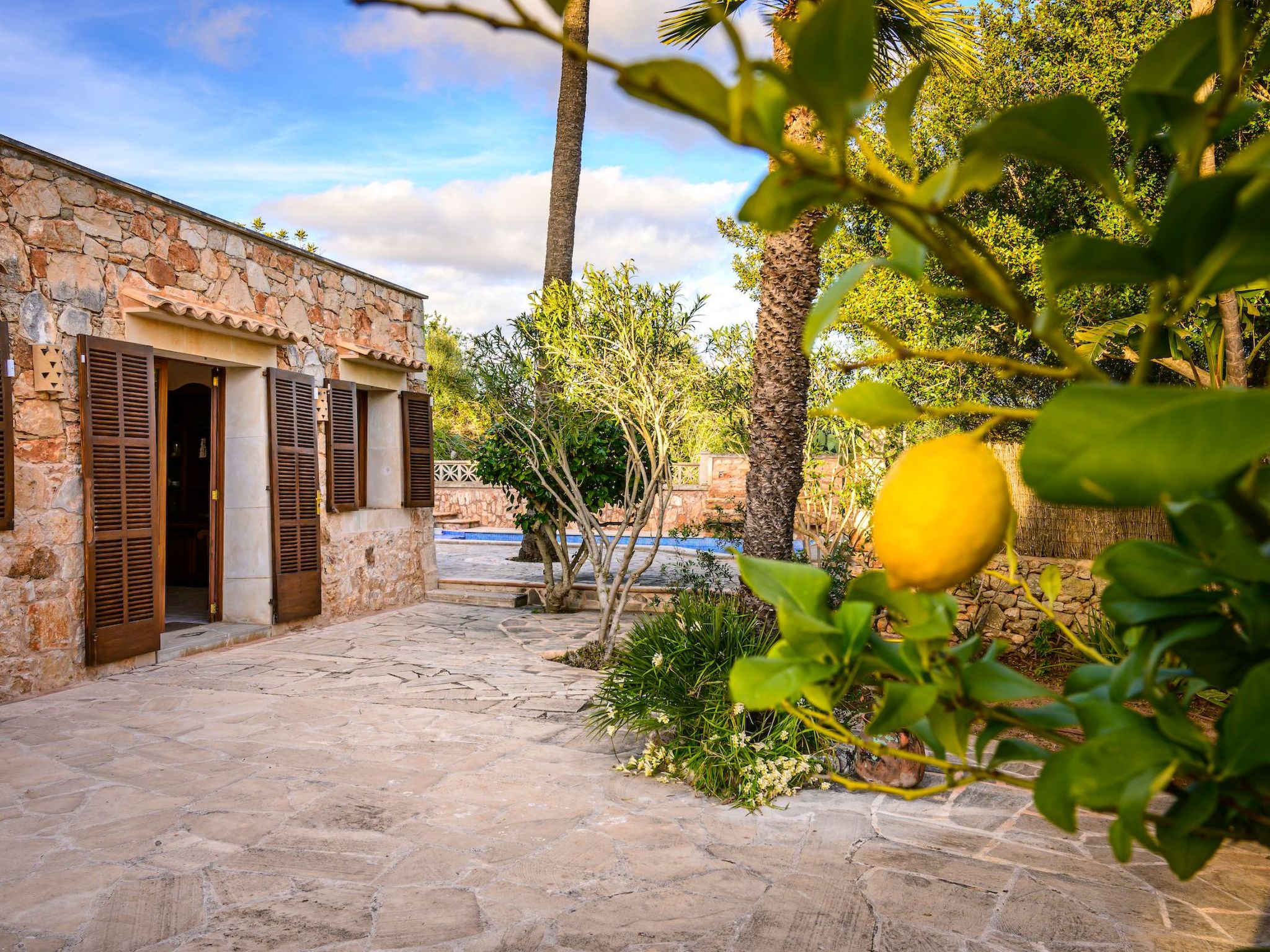 Der Außenbereich des Hauses ist eine wahre Oase der Entspannung. Der private Swimmingpool mit blauen Mosaiken und einem Wasserfall aus Naturstein ist ein Highlight und bietet einen perfekten Rückzugsort für sonnige Tage. Die Außenküche mit Grill und Essbereich im Freien lädt zu unvergesslichen Abenden unter dem mallorquinischen Sternenhimmel ein. Außerdem bietet die Terrasse mit Blick auf den Pool den perfekten Rahmen für ruhige Momente an der frischen Luft.