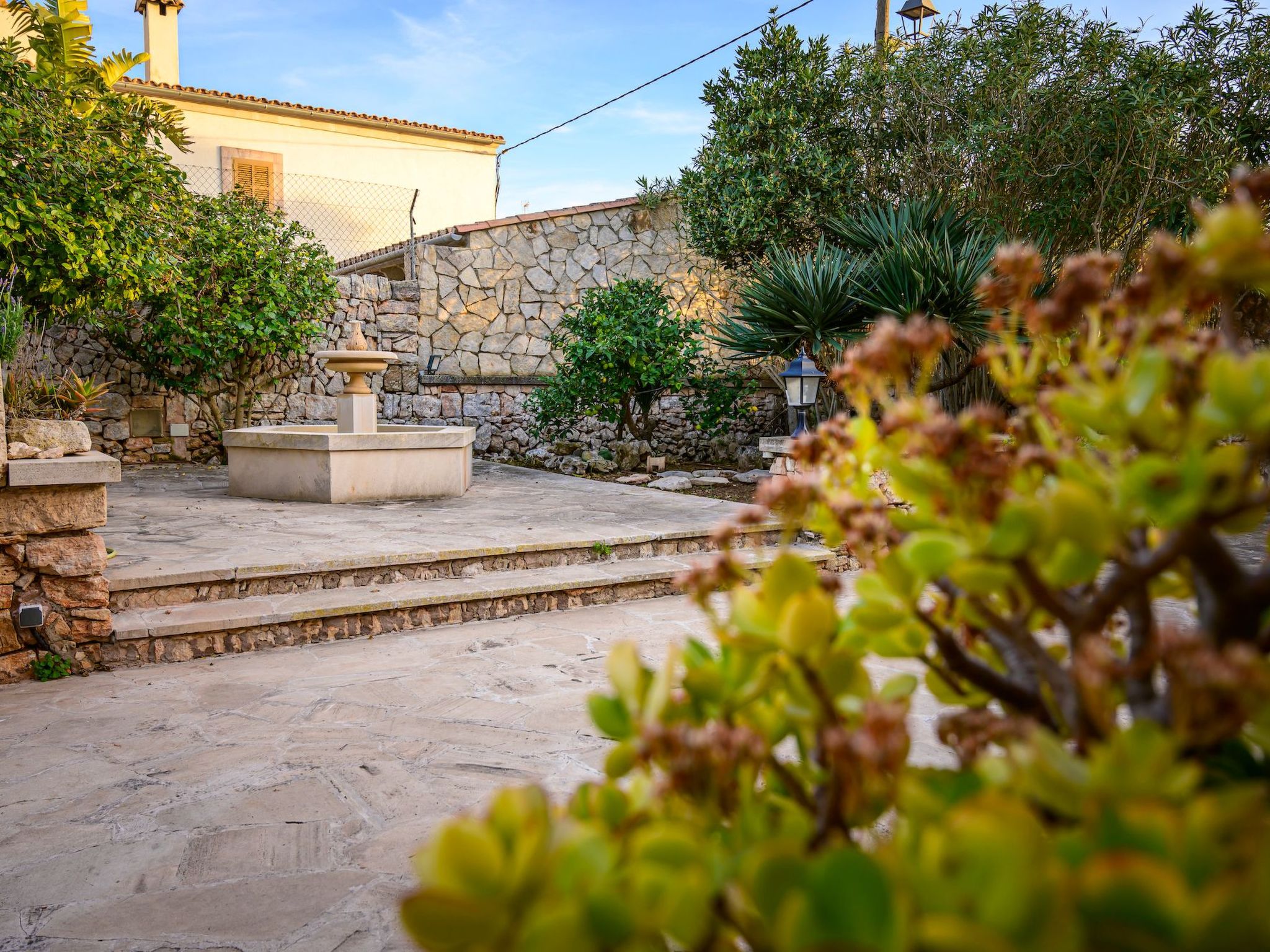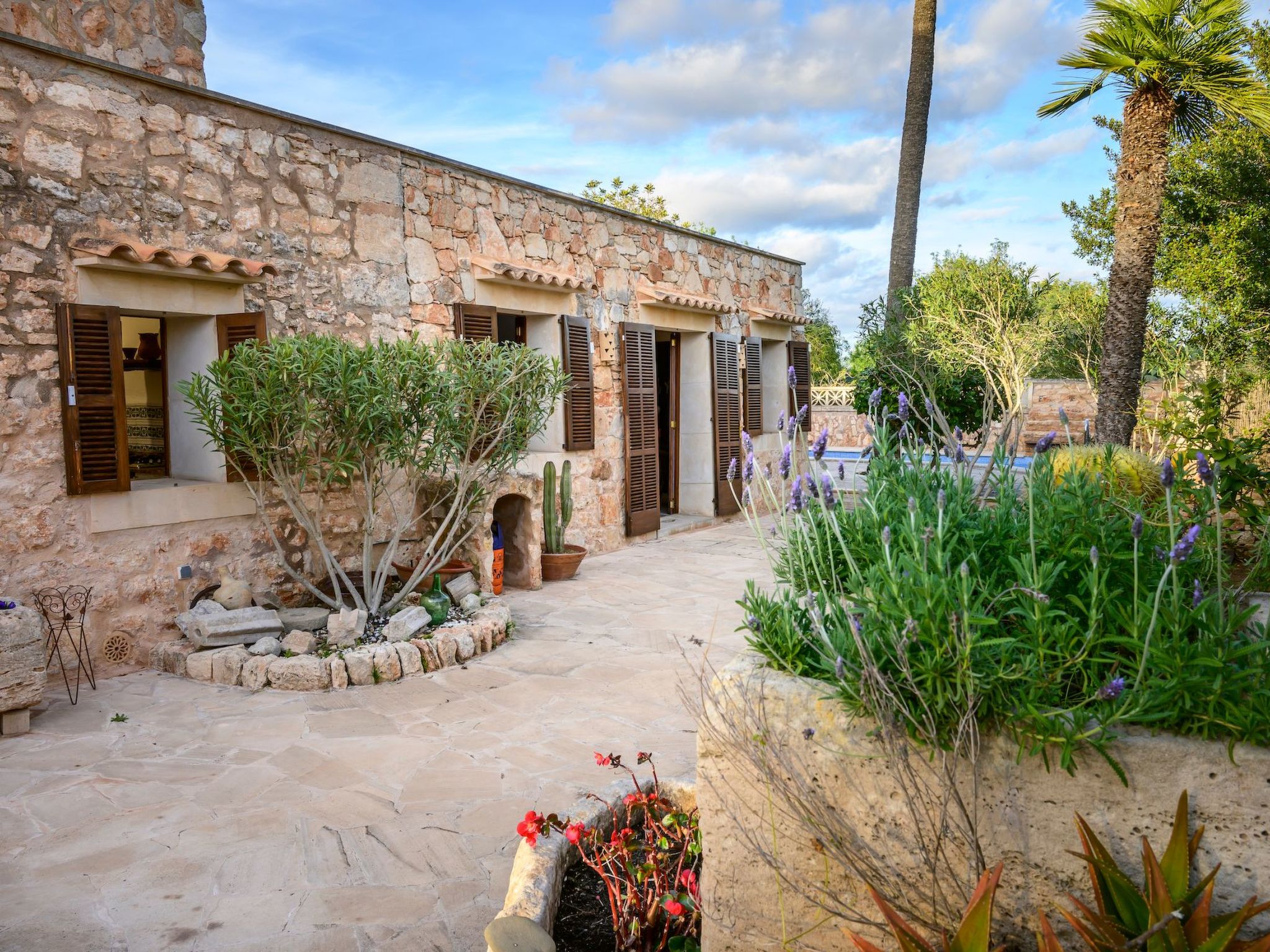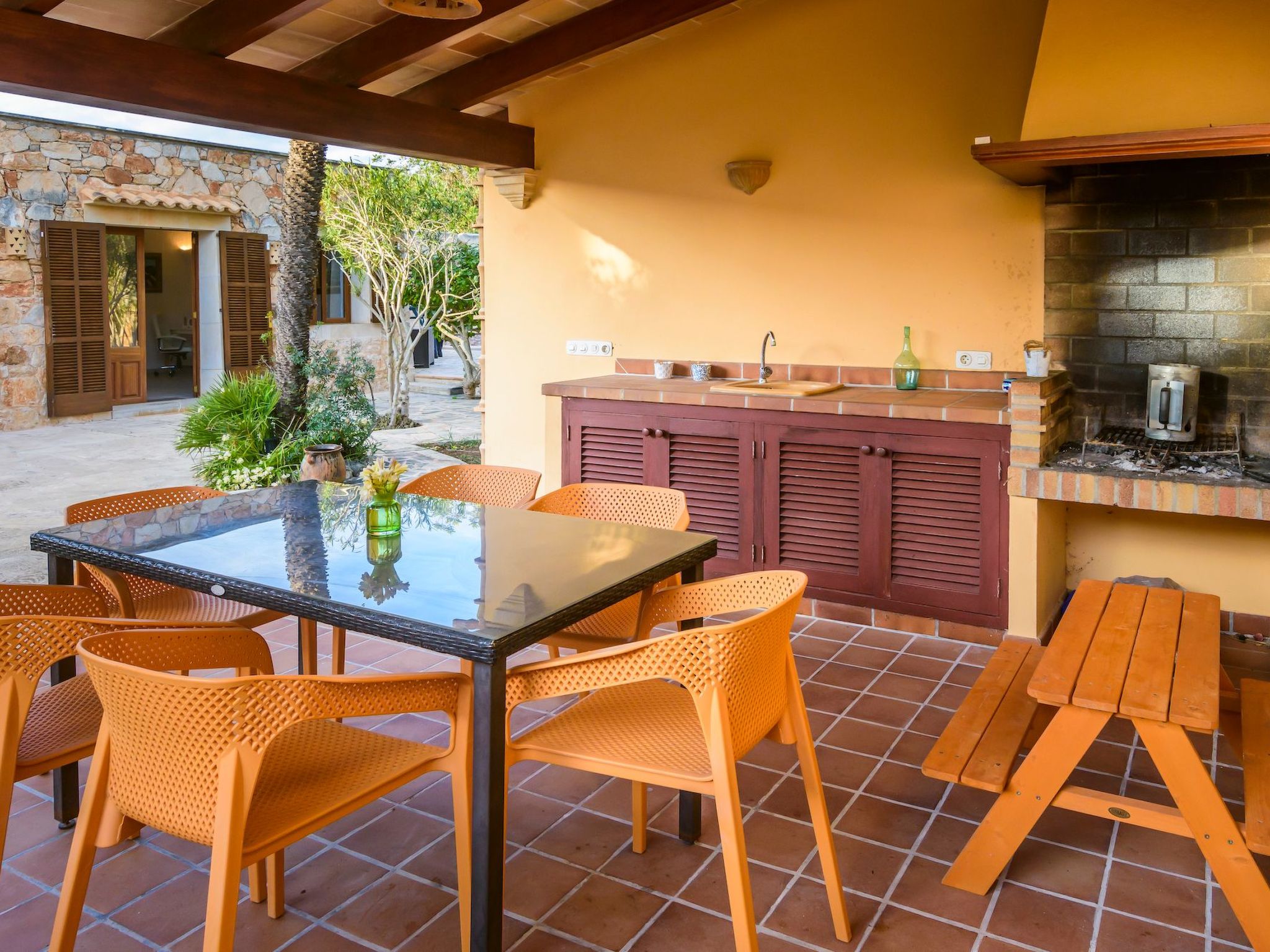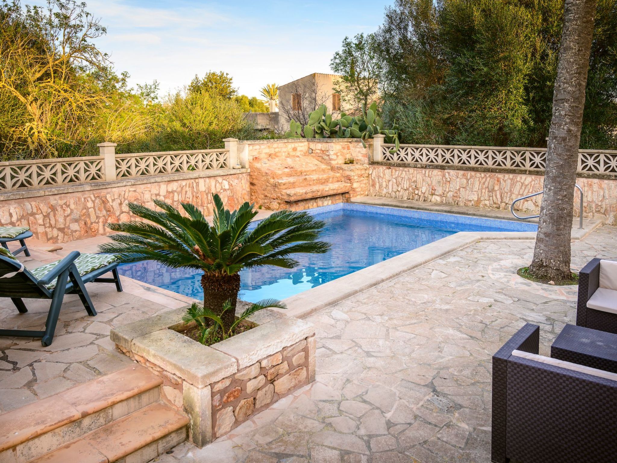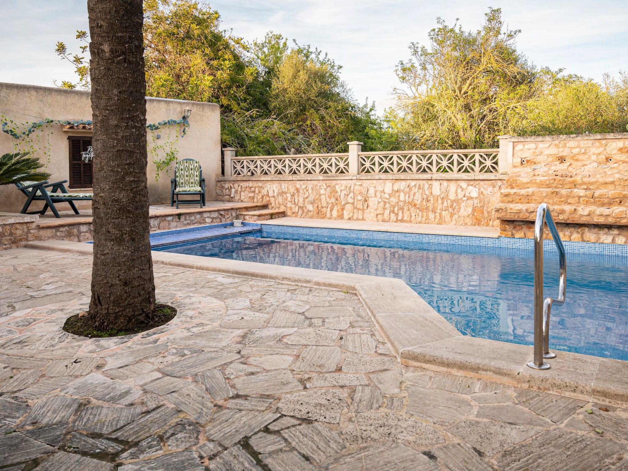 Der Außenbereich des Hauses ist eine wahre Oase der Entspannung. Der private Swimmingpool mit blauen Mosaiken und einem Wasserfall aus Naturstein ist ein Highlight und bietet einen perfekten Rückzugsort für sonnige Tage. Die Außenküche mit Grill und Essbereich im Freien lädt zu unvergesslichen Abenden unter dem mallorquinischen Sternenhimmel ein. Außerdem bietet die Terrasse mit Blick auf den Pool den perfekten Rahmen für ruhige Momente an der frischen Luft.