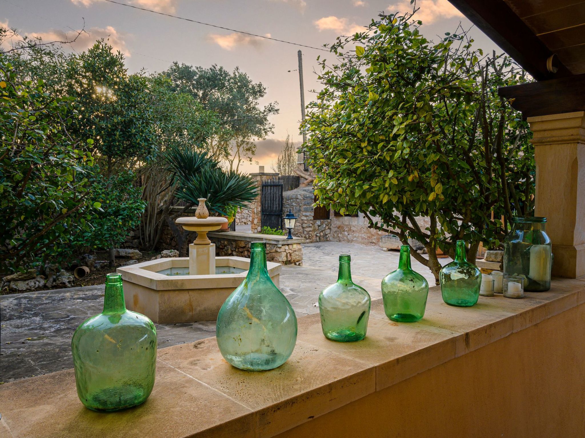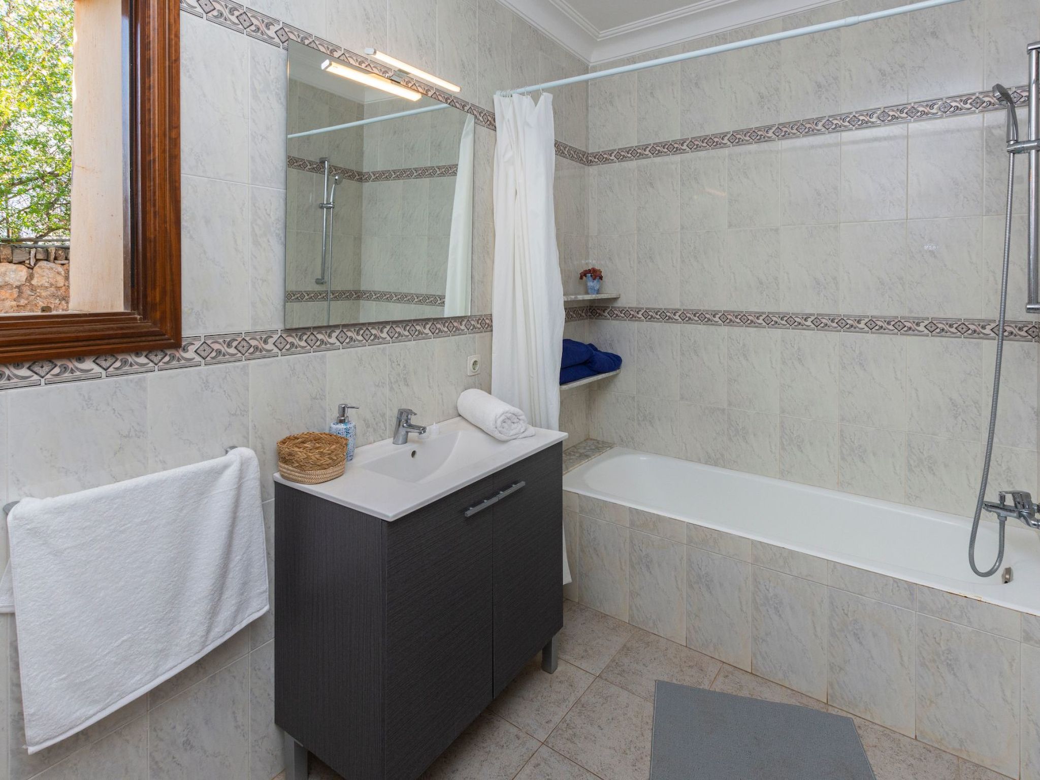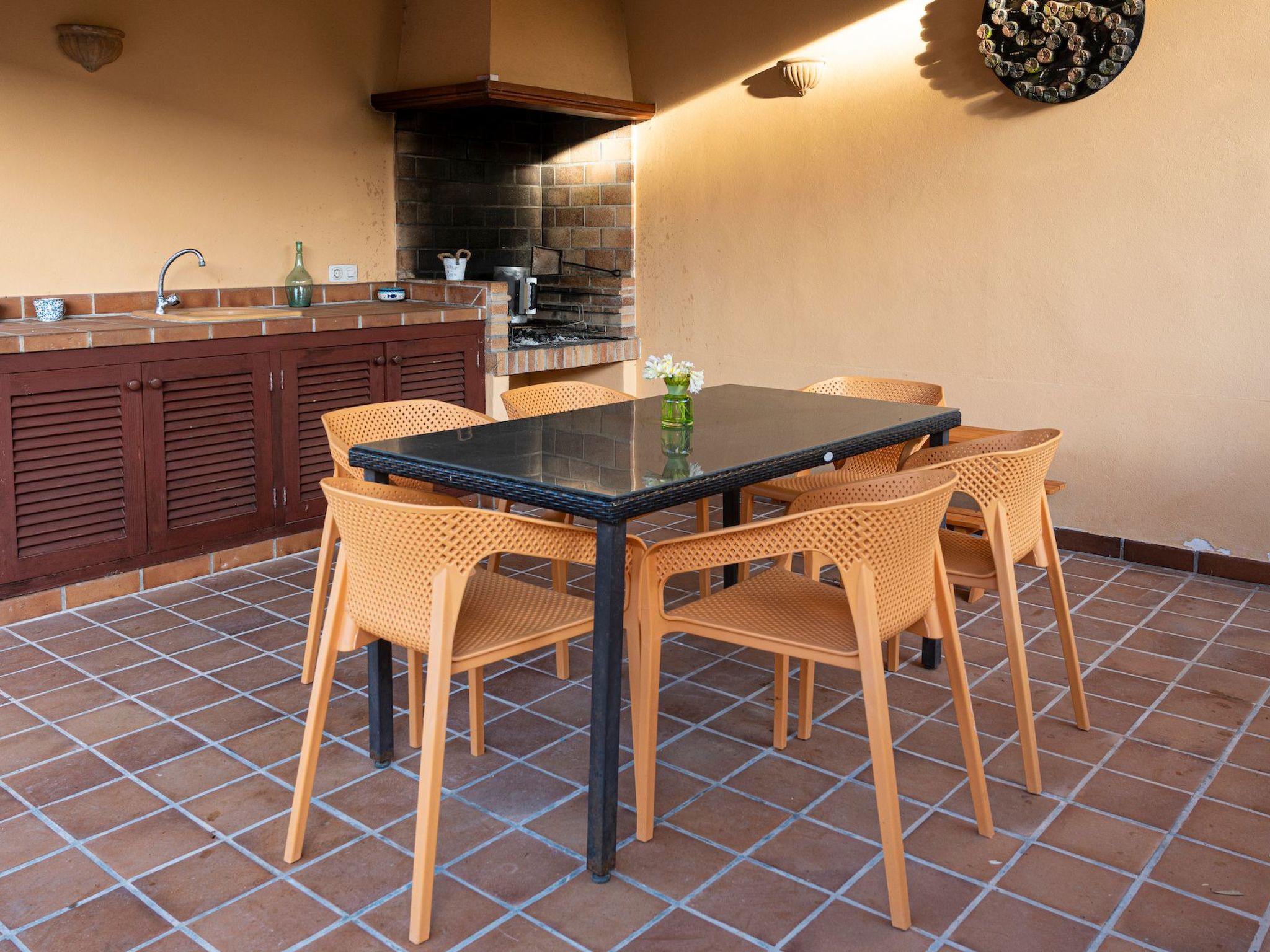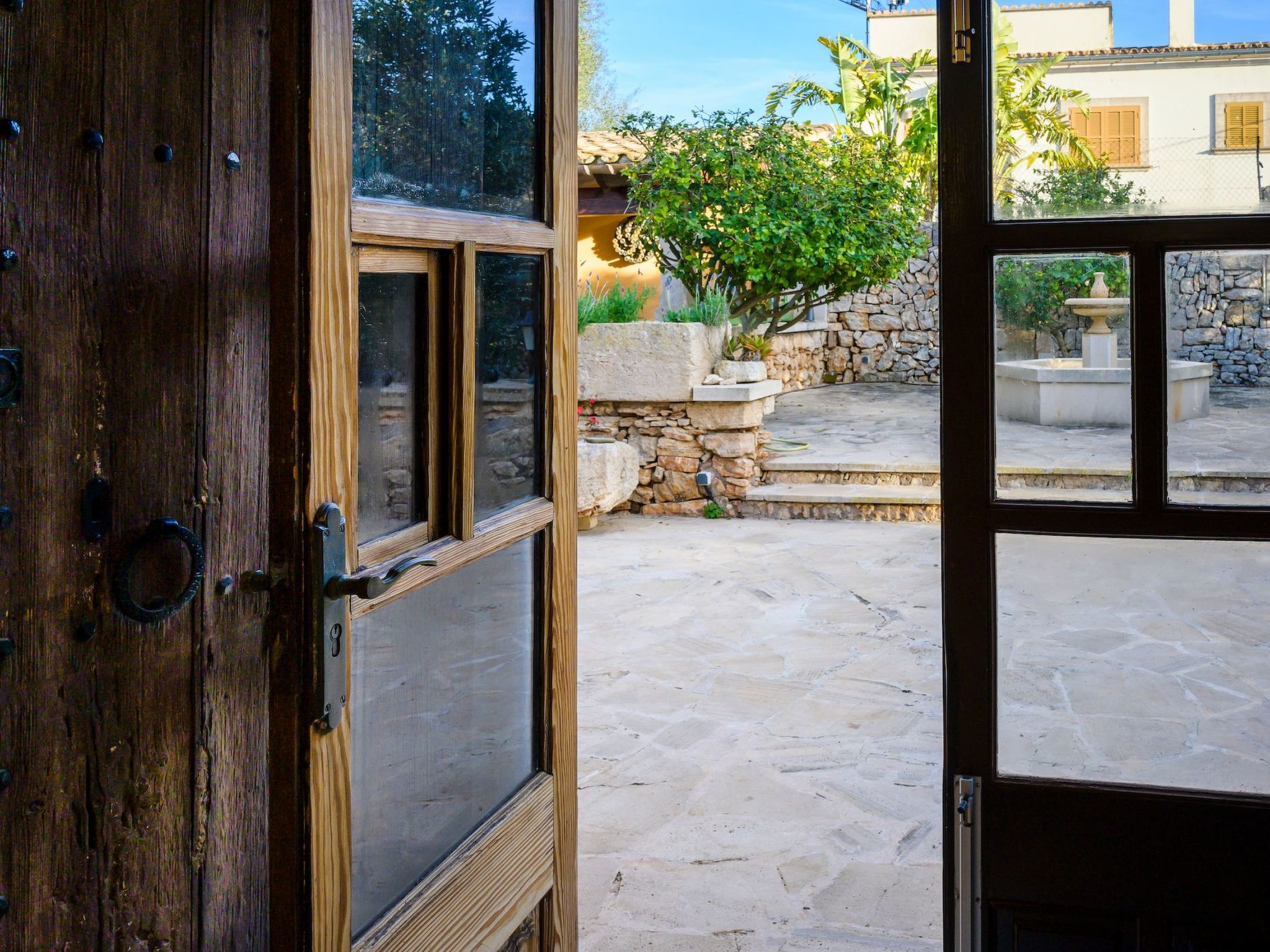 Der Außenbereich des Hauses ist eine wahre Oase der Entspannung. Der private Swimmingpool mit blauen Mosaiken und einem Wasserfall aus Naturstein ist ein Highlight und bietet einen perfekten Rückzugsort für sonnige Tage. Die Außenküche mit Grill und Essbereich im Freien lädt zu unvergesslichen Abenden unter dem mallorquinischen Sternenhimmel ein. Außerdem bietet die Terrasse mit Blick auf den Pool den perfekten Rahmen für ruhige Momente an der frischen Luft.