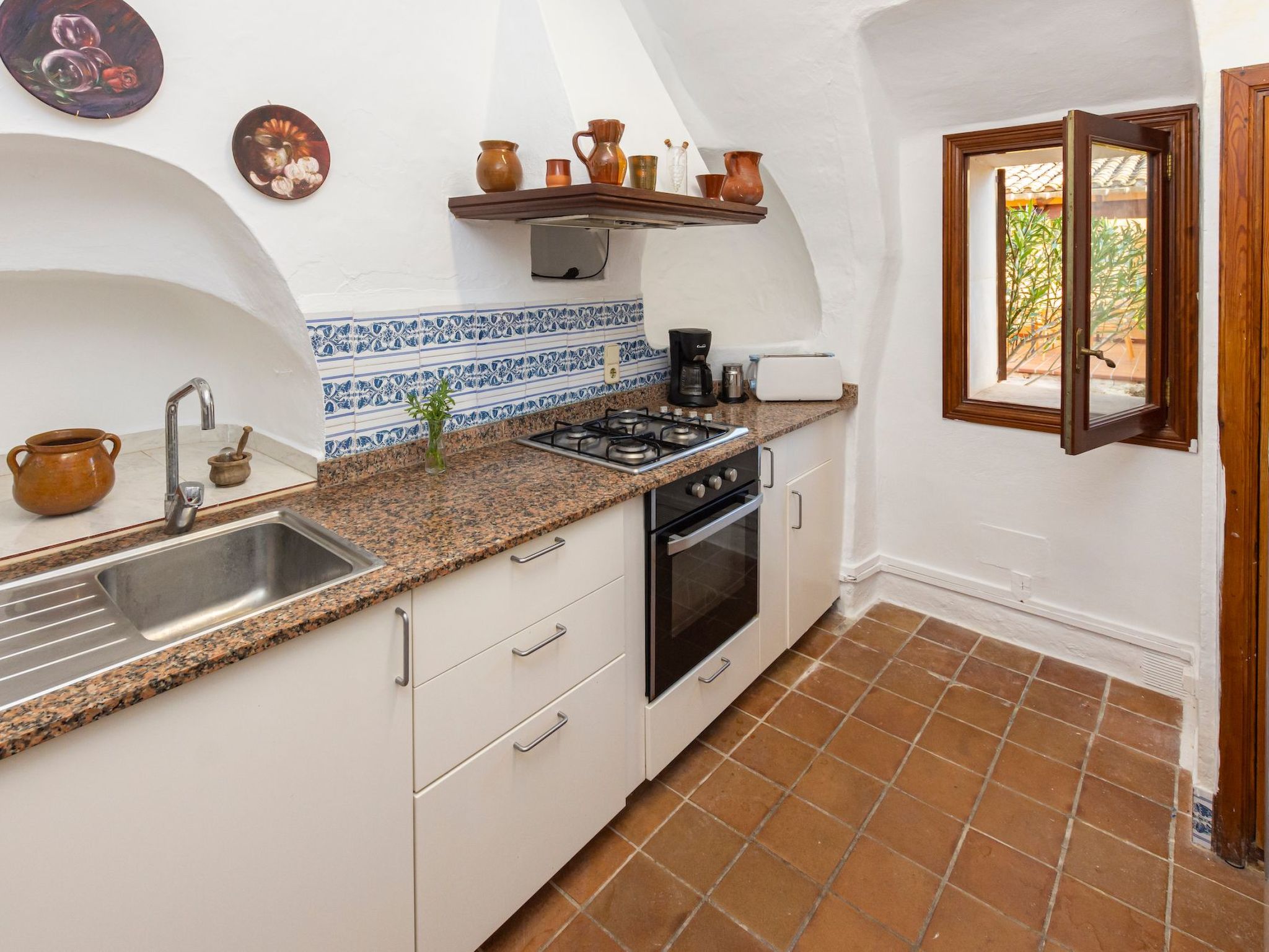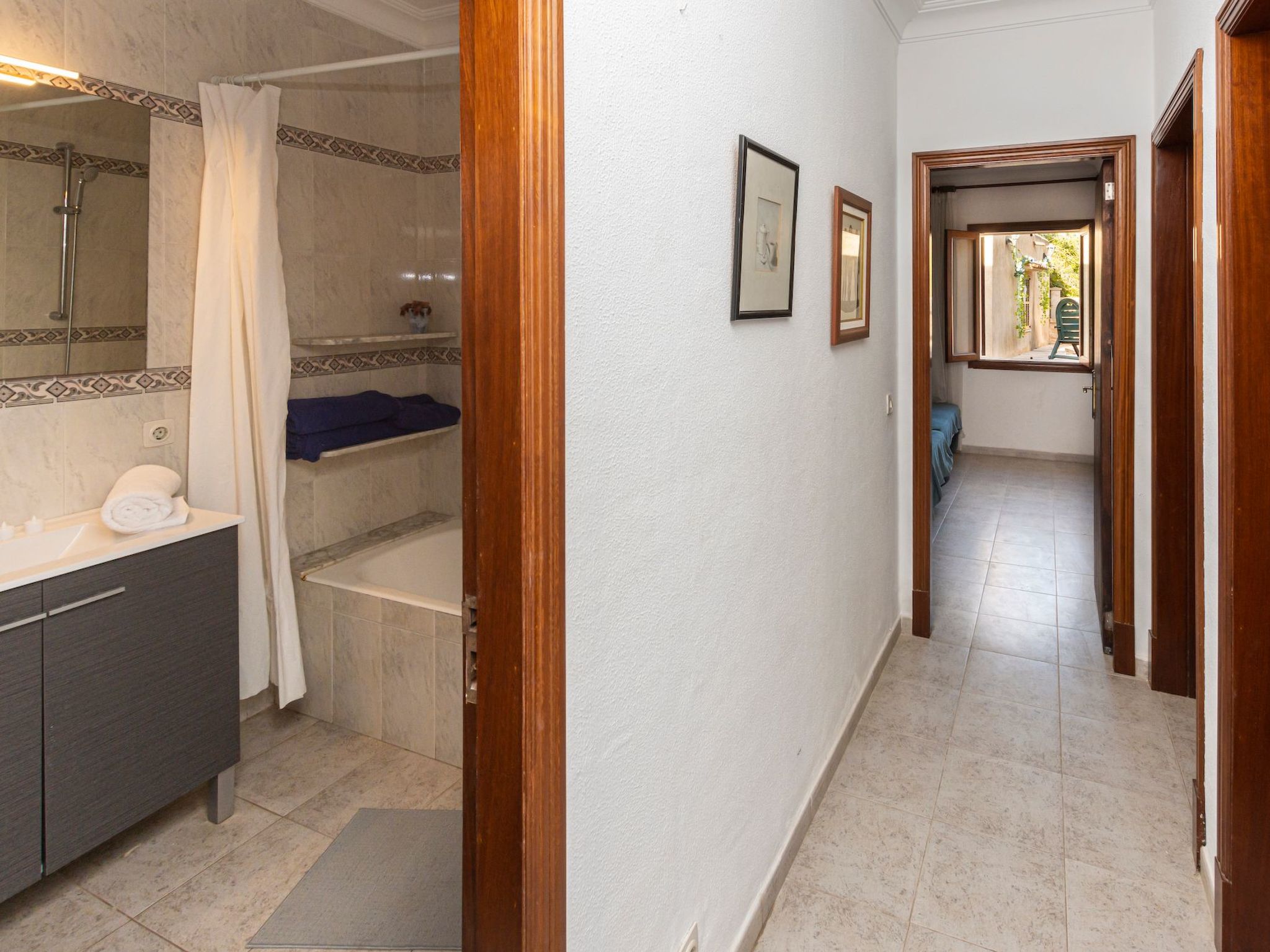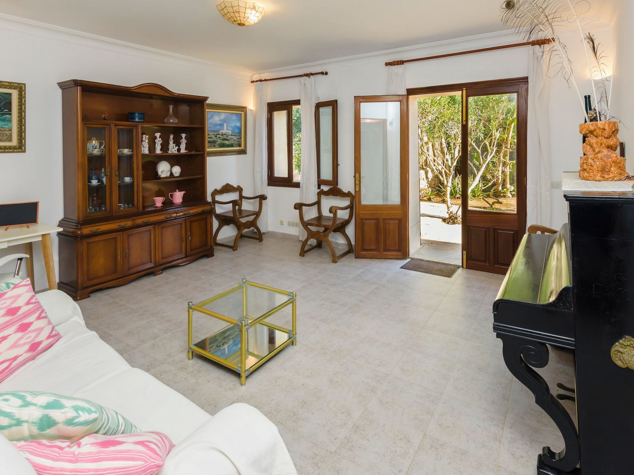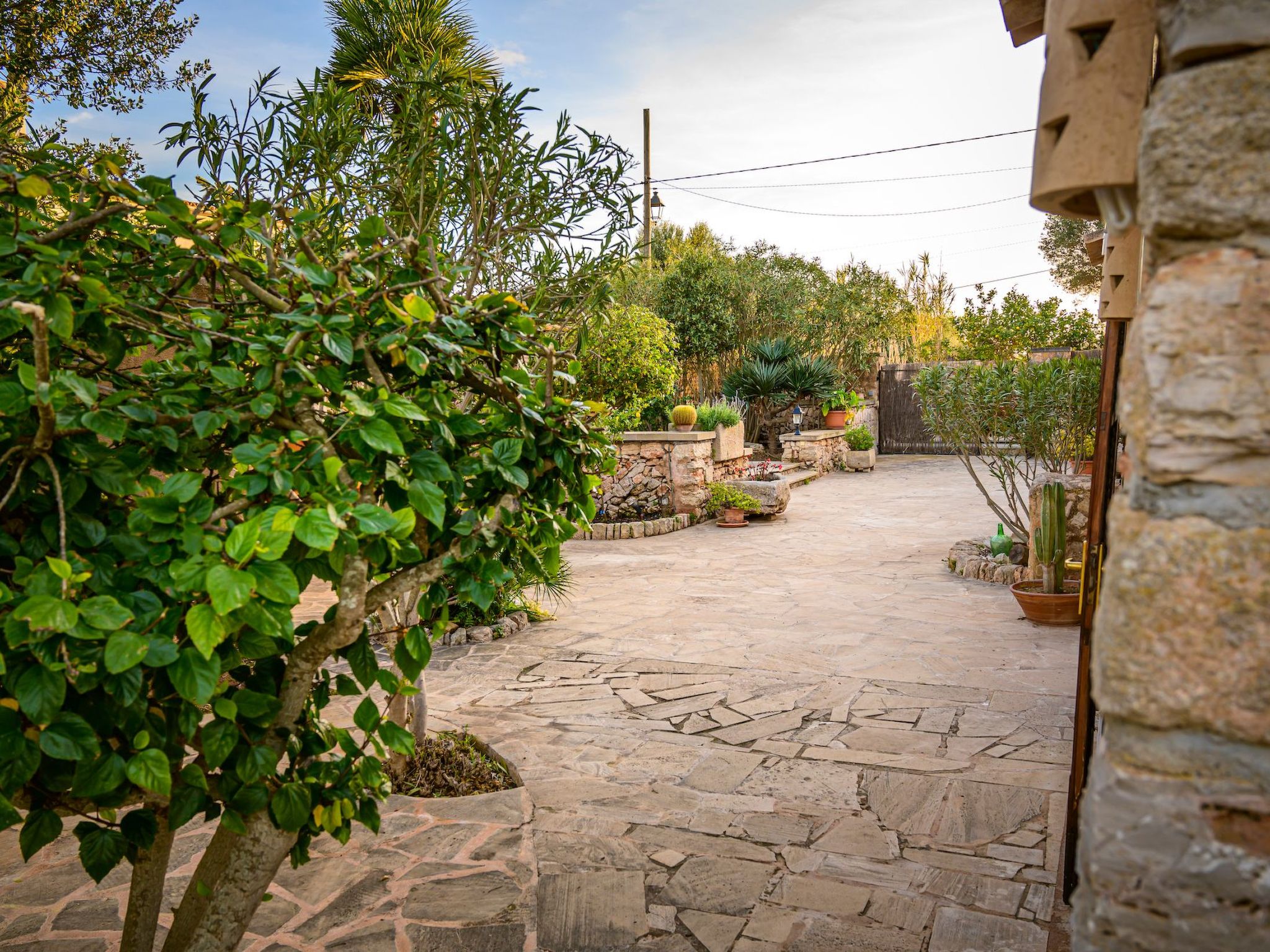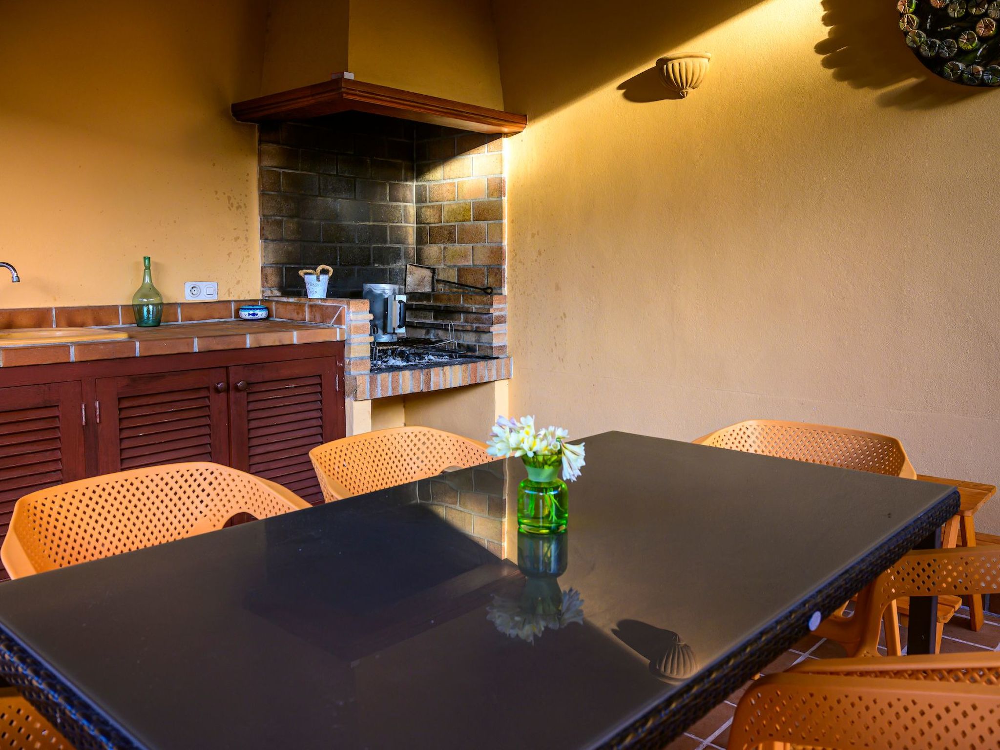 Der Außenbereich des Hauses ist eine wahre Oase der Entspannung. Der private Swimmingpool mit blauen Mosaiken und einem Wasserfall aus Naturstein ist ein Highlight und bietet einen perfekten Rückzugsort für sonnige Tage. Die Außenküche mit Grill und Essbereich im Freien lädt zu unvergesslichen Abenden unter dem mallorquinischen Sternenhimmel ein. Außerdem bietet die Terrasse mit Blick auf den Pool den perfekten Rahmen für ruhige Momente an der frischen Luft.