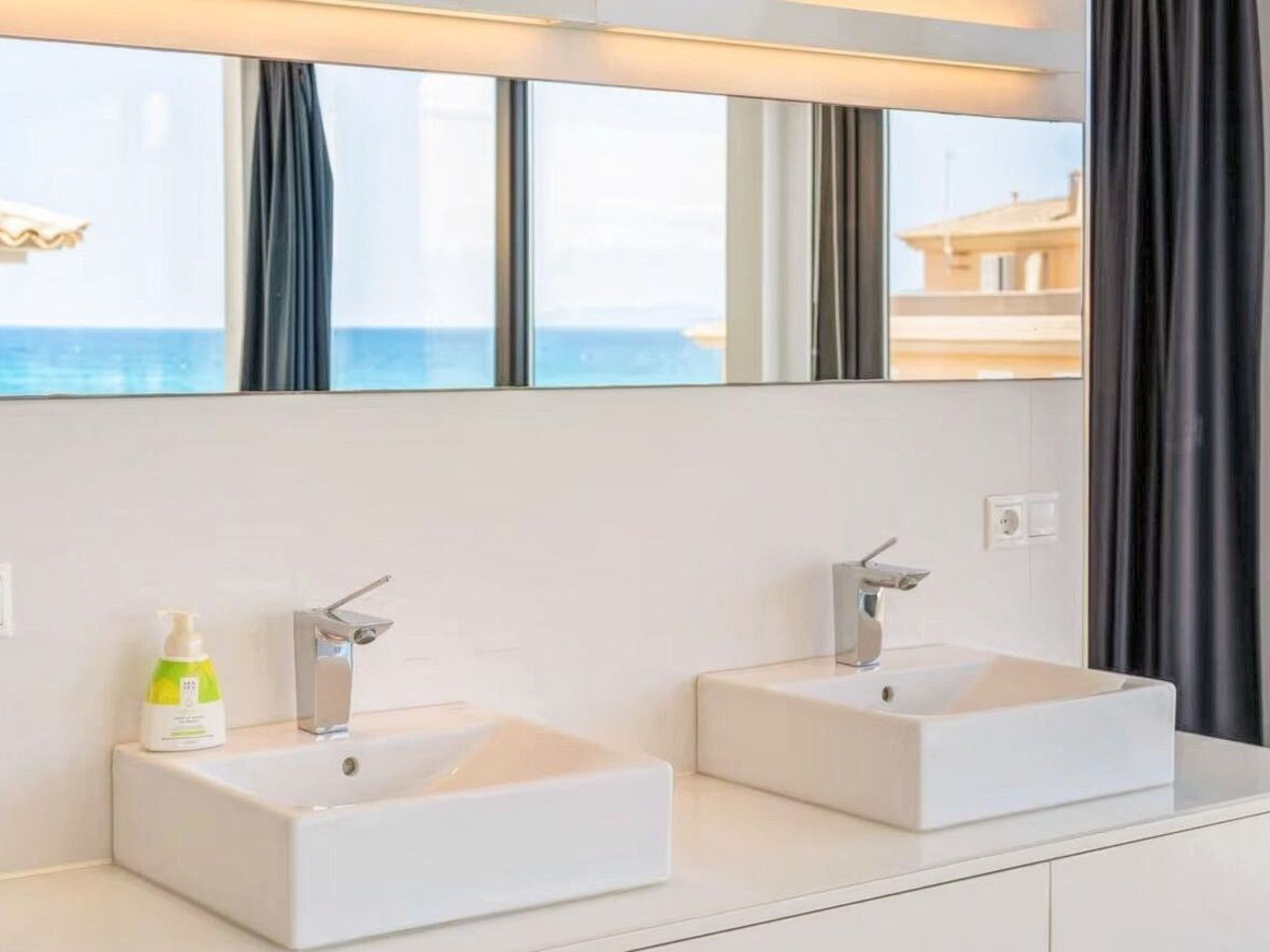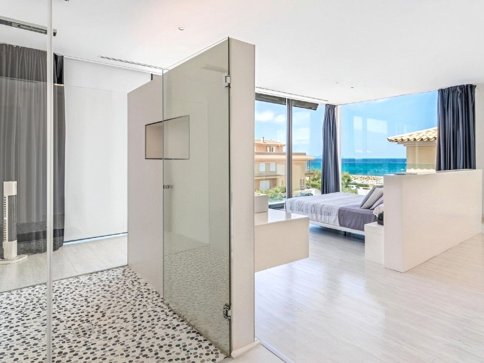 Das Haus bietet mit 300 m² Wohnfläche auf drei Etagen verteilt drei edle Schlafzimmer, alle mit Doppelbett und Klimaanlage und insgesamt vier Badezimmer. Zwei der Zimmer und zwei der Badezimmer befinden sich oben. Eins der Schlafzimmer oben ist die Suite mit eigenem offenen Badezimmer und einer riesigen lichtdurchfluteten Glasfront von der man einen atemberaubenden Blick auf das Meer hat.