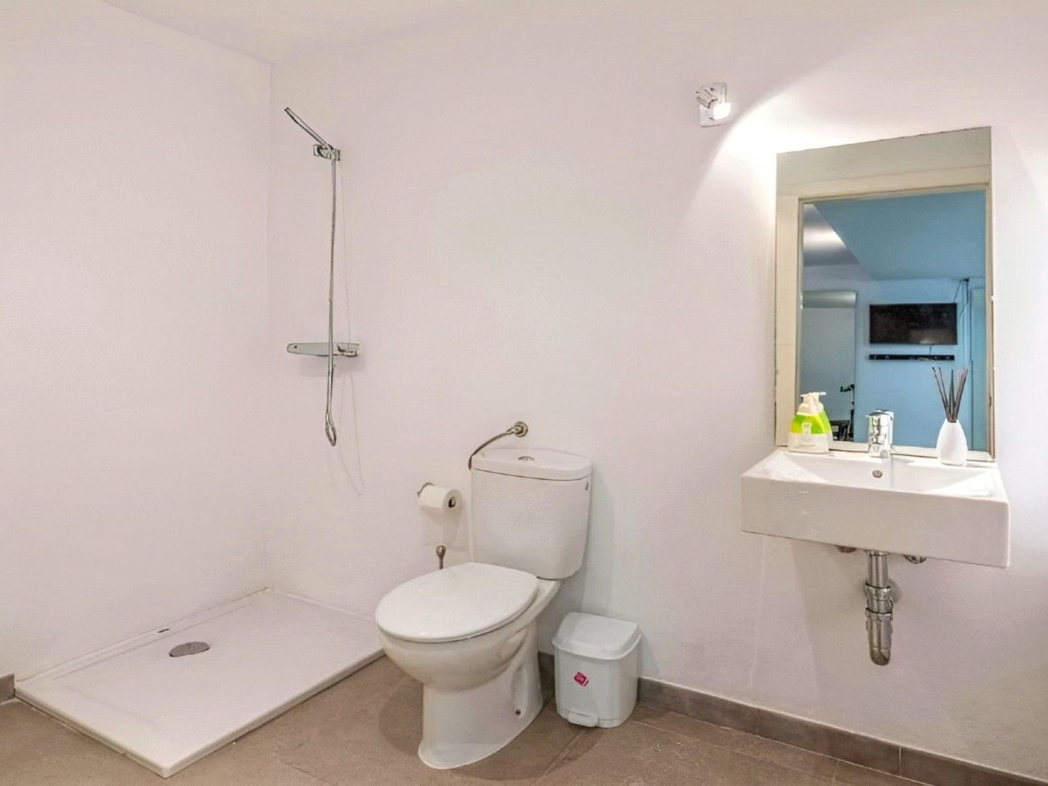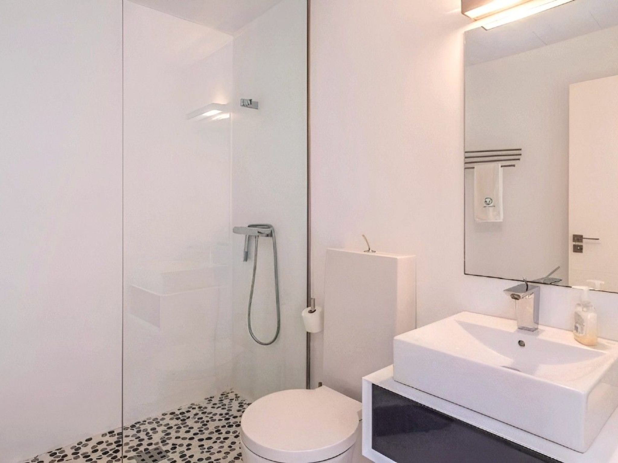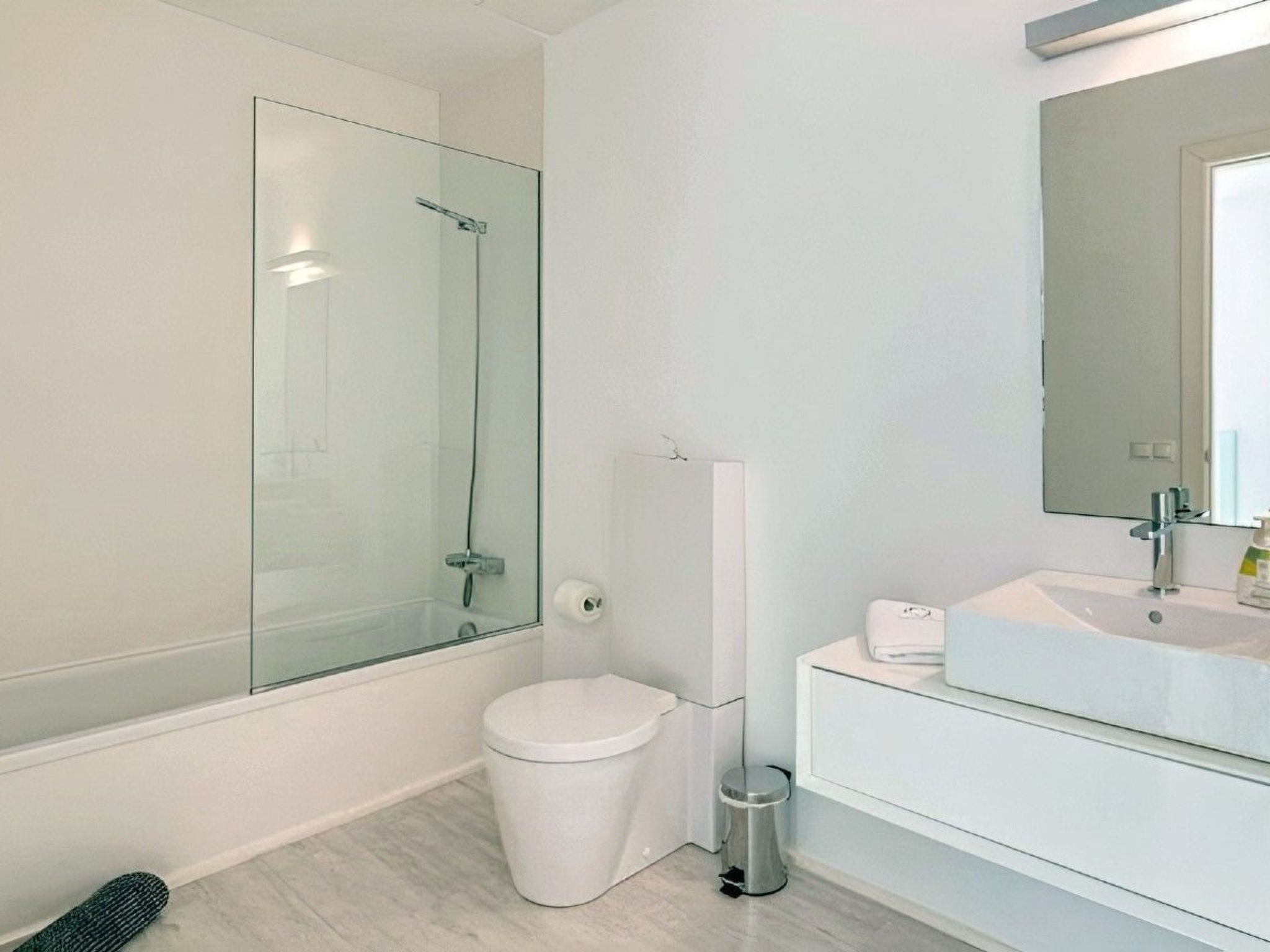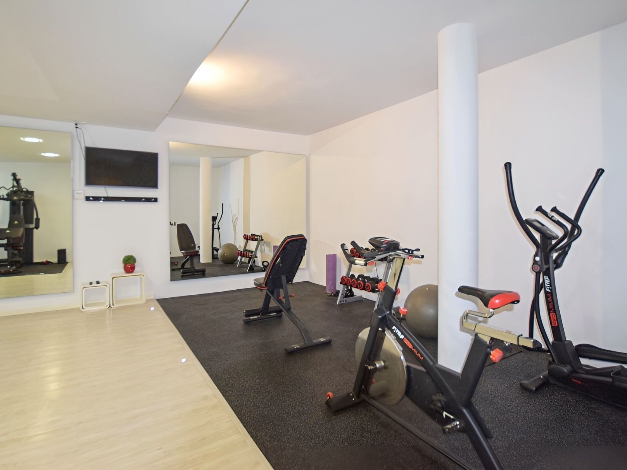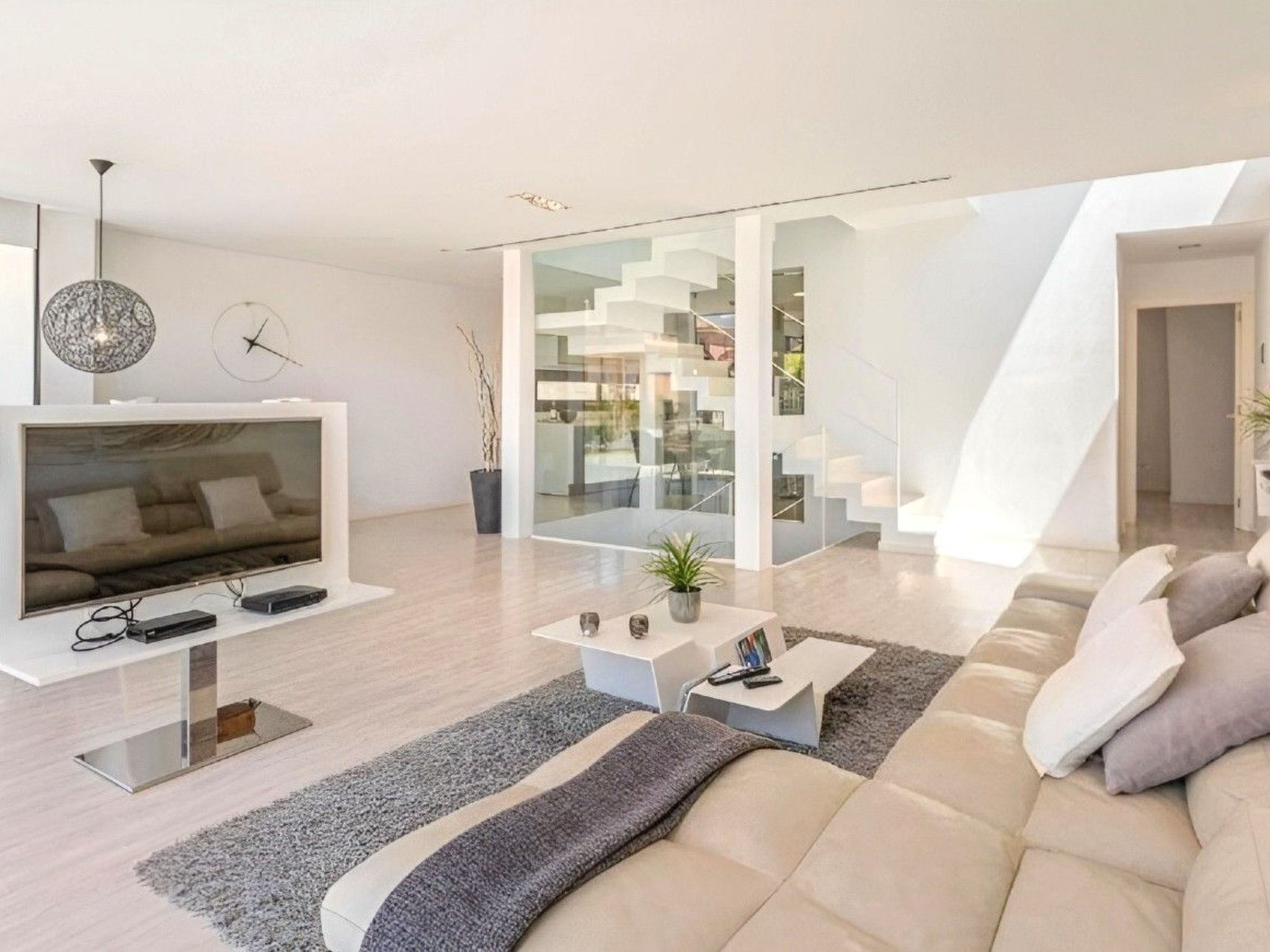 Die untere Ebene beherbergt das dritte Schlafzimmer, ein weiteres Badezimmer, die moderne helle mit allem ausgestattete offene Küche und das gemütliche Wohnzimmer.mit freistehendem Smart-TV und Kuschelsofa... natürlich ebenfalls mit Meerblick! Auf der zweiten Ebene wurde eigens ein Home-Office Zimmer eingerichtet und in der unterkellerten Ebene gibt es für die ganz sportlichen ein eigenes Fitness-Studio und eine Garage und viel Platz zum Beispiel für das unterstellen von Fahrrädern.