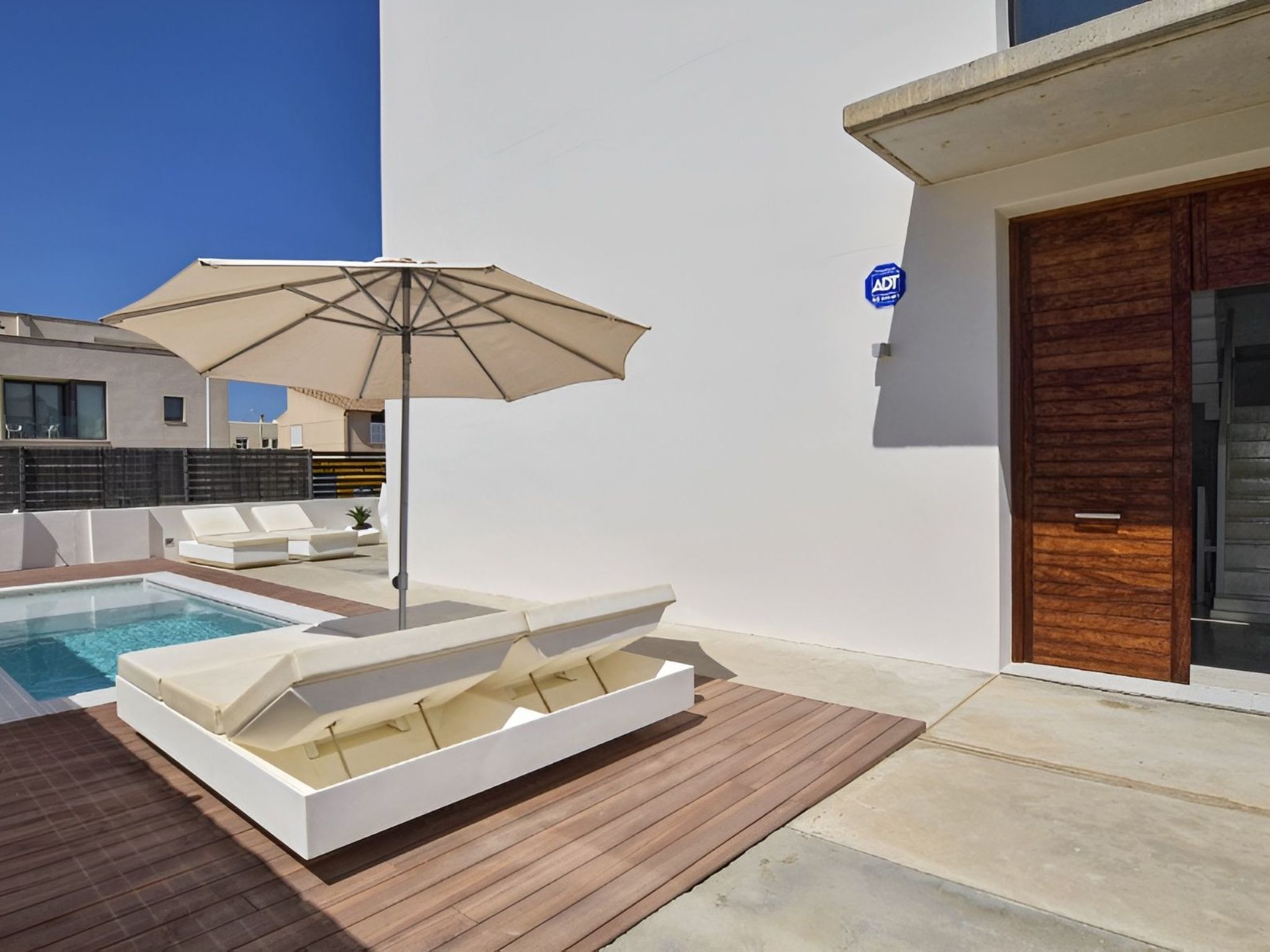 Die Villa ist umgeben von 320 m² die dem gepflegten Outdoor-Chillen keine Grenzen setzen. Ein schicker Glastisch lädt zu gemeinsamen Open Air-Mahlzeiten ein, natürlich mit Meerblick. Mit der Markise kann man sich bei Bedarf etwas Schatten spenden und wenn man einmal nicht im Meer baden gehen möchte, sorgt der private 5 m x 3 m Swimming Pool mit einer Tiefe von 1 m bis 2 m für die kühle Erfrischung.