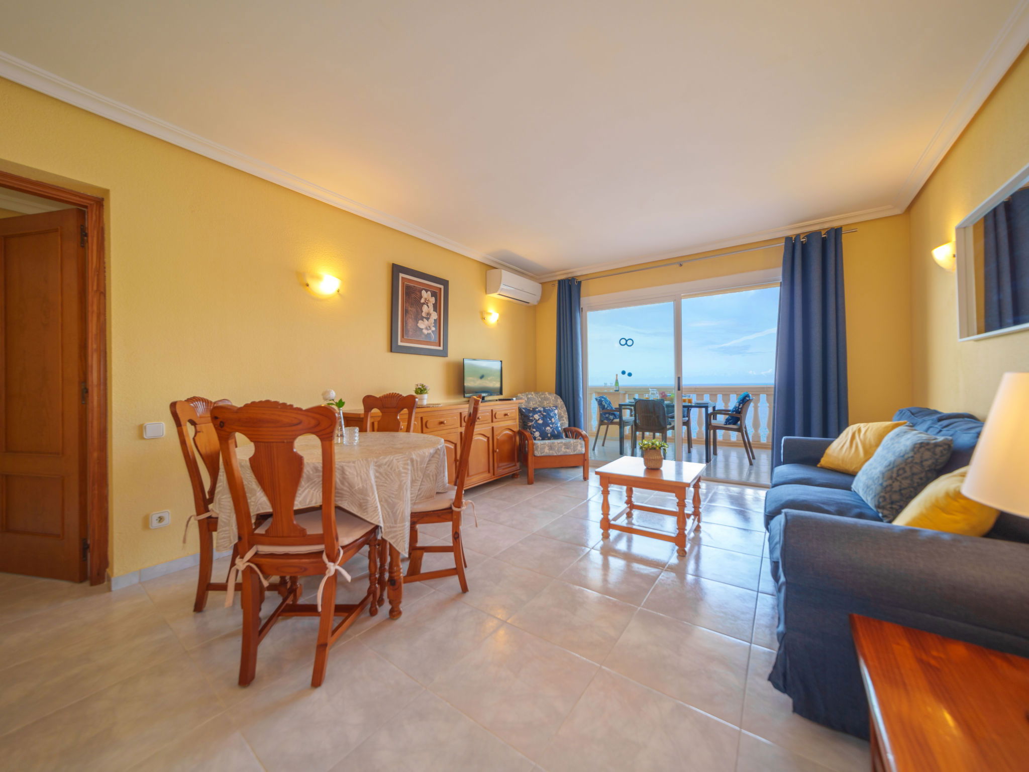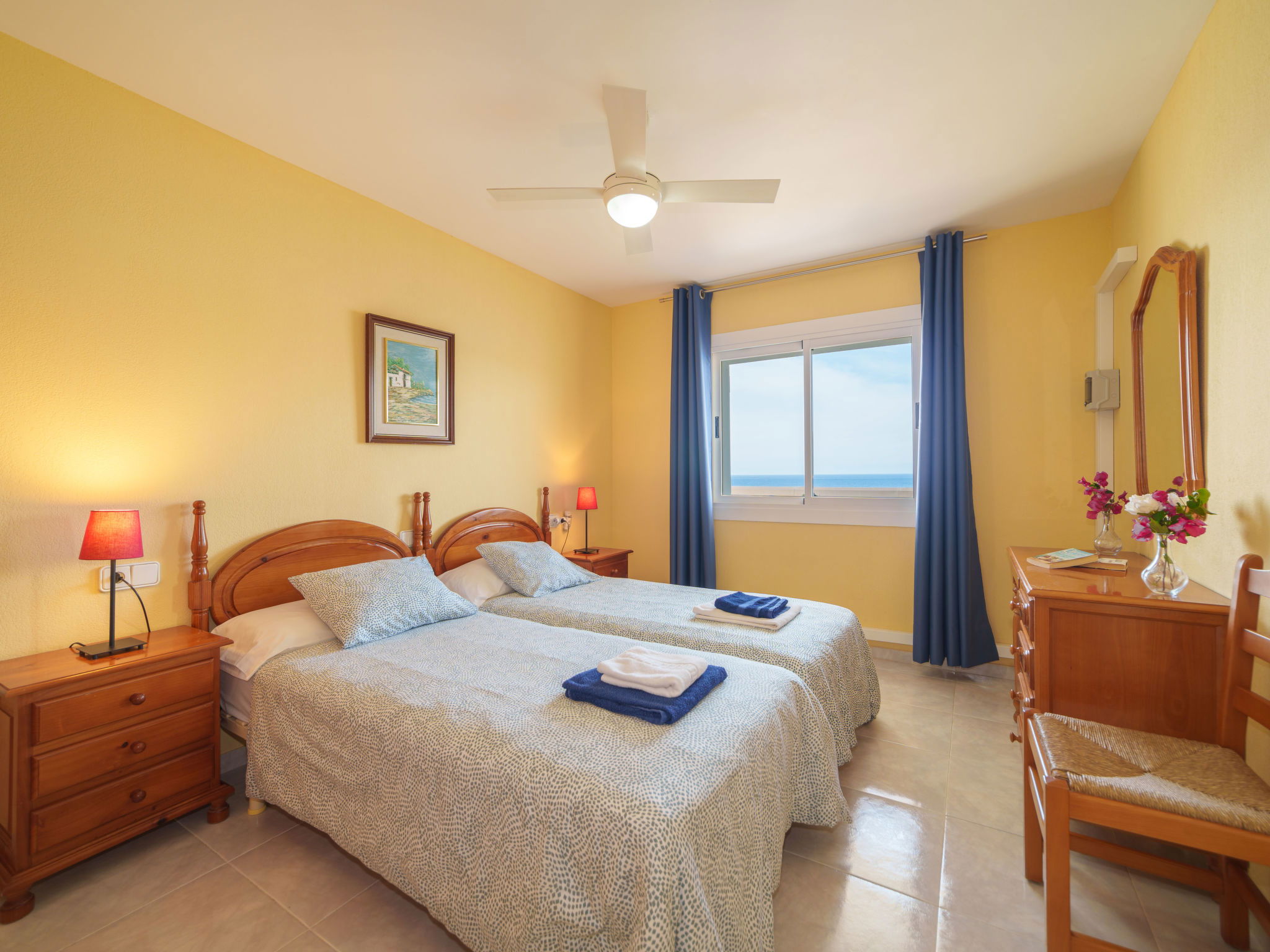 "Apartamentos Amores (TEL201)", 3-Zimmer-Wohnung 80 m2. Zweckmässig eingerichtet: Wohn-/Esszimmer mit Esstisch, Sat-TV und Digital-TV. 1 Zimmer mit 2 Betten und E-Heizofen. 1 Zimmer mit 1 franz. Bett (1 x 140 cm), E-Heizofen. Küche (4 Flammen, Toaster, Mikrowelle, elektrische Kaffeemaschine). Dusche/WC, sep. WC. Balkon 18 m2. Balkonmöbel, Liegestühle (2). Herrliche Sicht auf das Meer. Zur Verfügung: Waschmaschine, Safe, Kinderhochstuhl, Babybett. Bitte beachten: Nichtraucher-Unterkunft. Feuerlöscher. VTV0614BAL