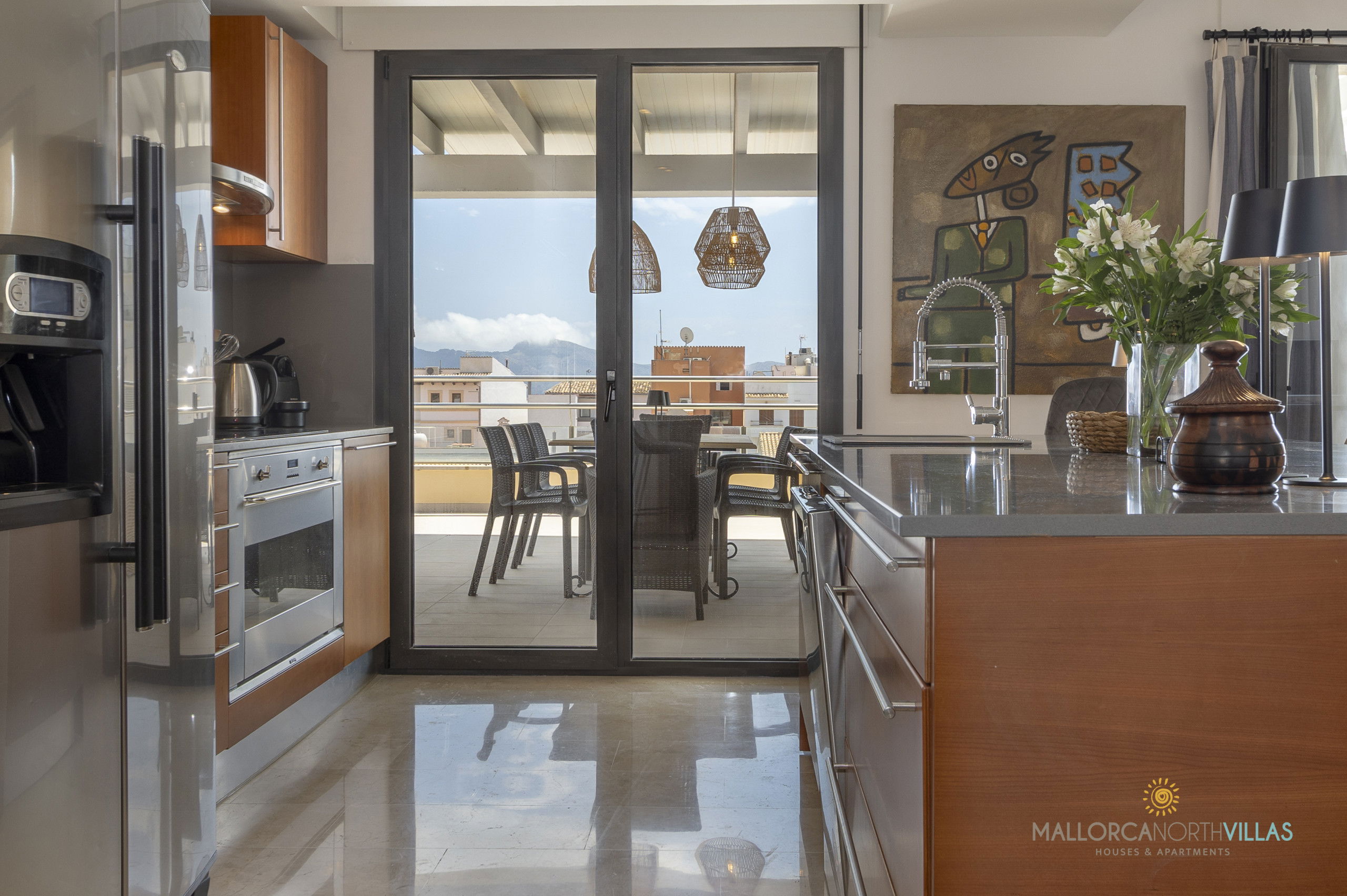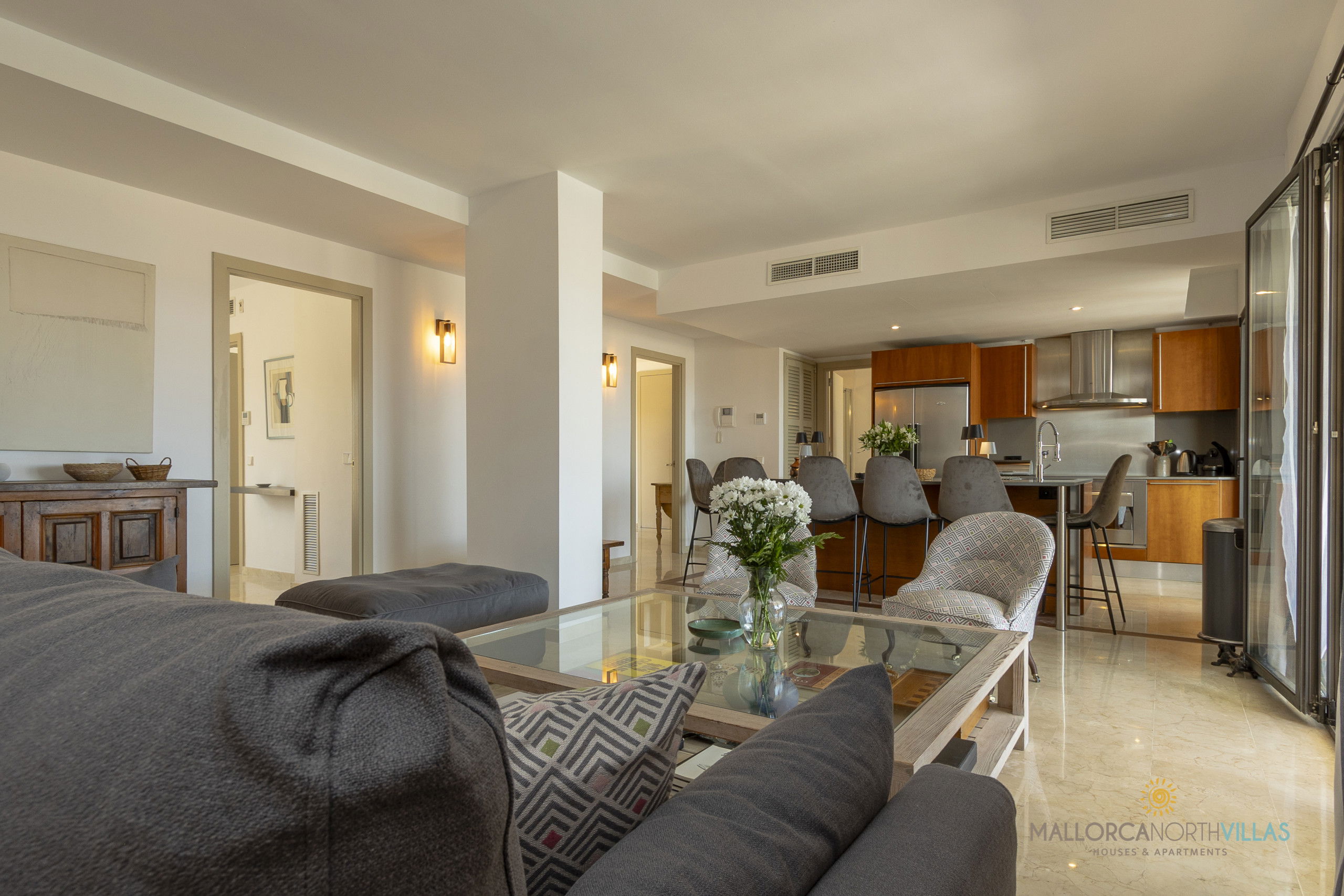 Die Küche verfügt über eine große Mittelinsel und ist komplett mit modernen Geräten ausgestattet und bietet alles, was Sie für die Zubereitung hausgemachter Mahlzeiten benötigen. Das Wohnzimmer, das dank der großen Fenster mit natürlichem Licht gefüllt ist, ist der perfekte Ort zum Entspannen nach einem erlebnisreichen Tag in Puerto de Pollensa.